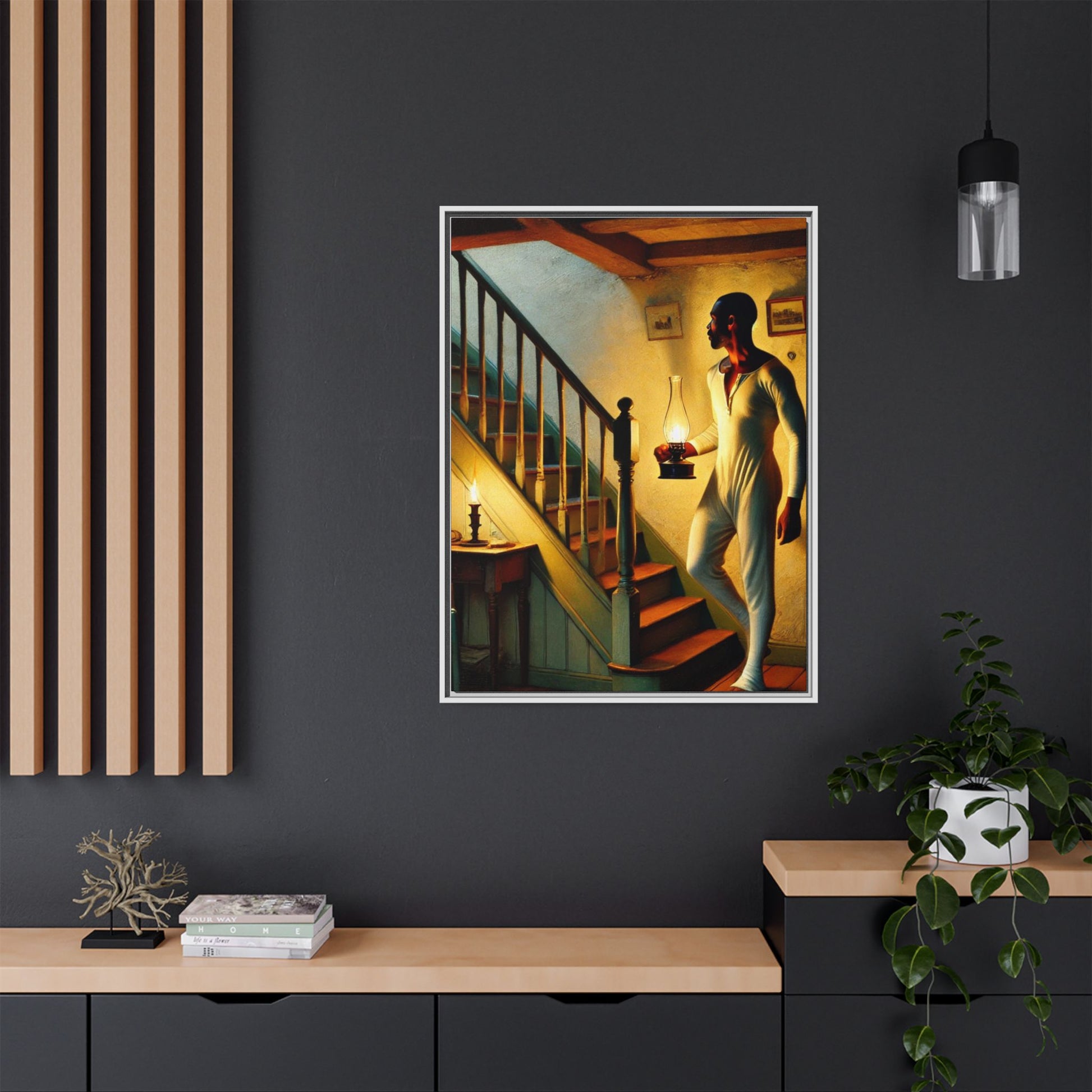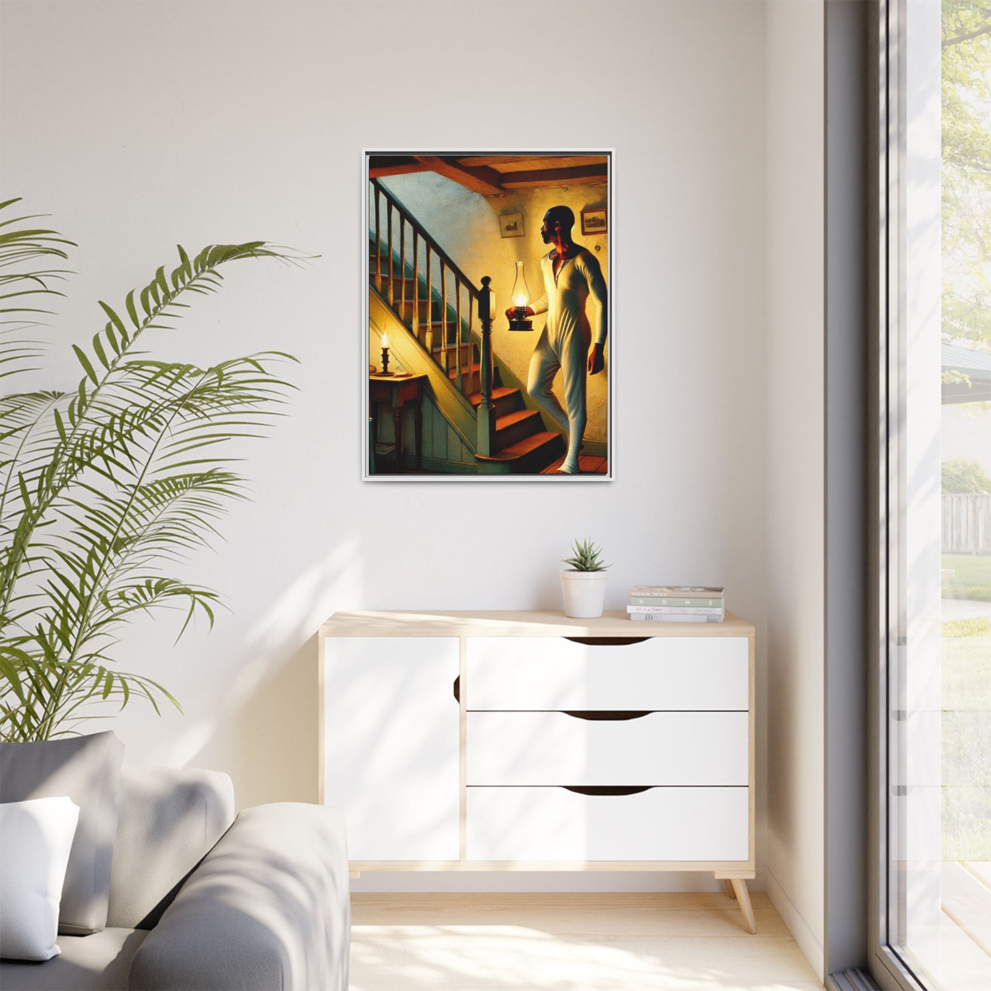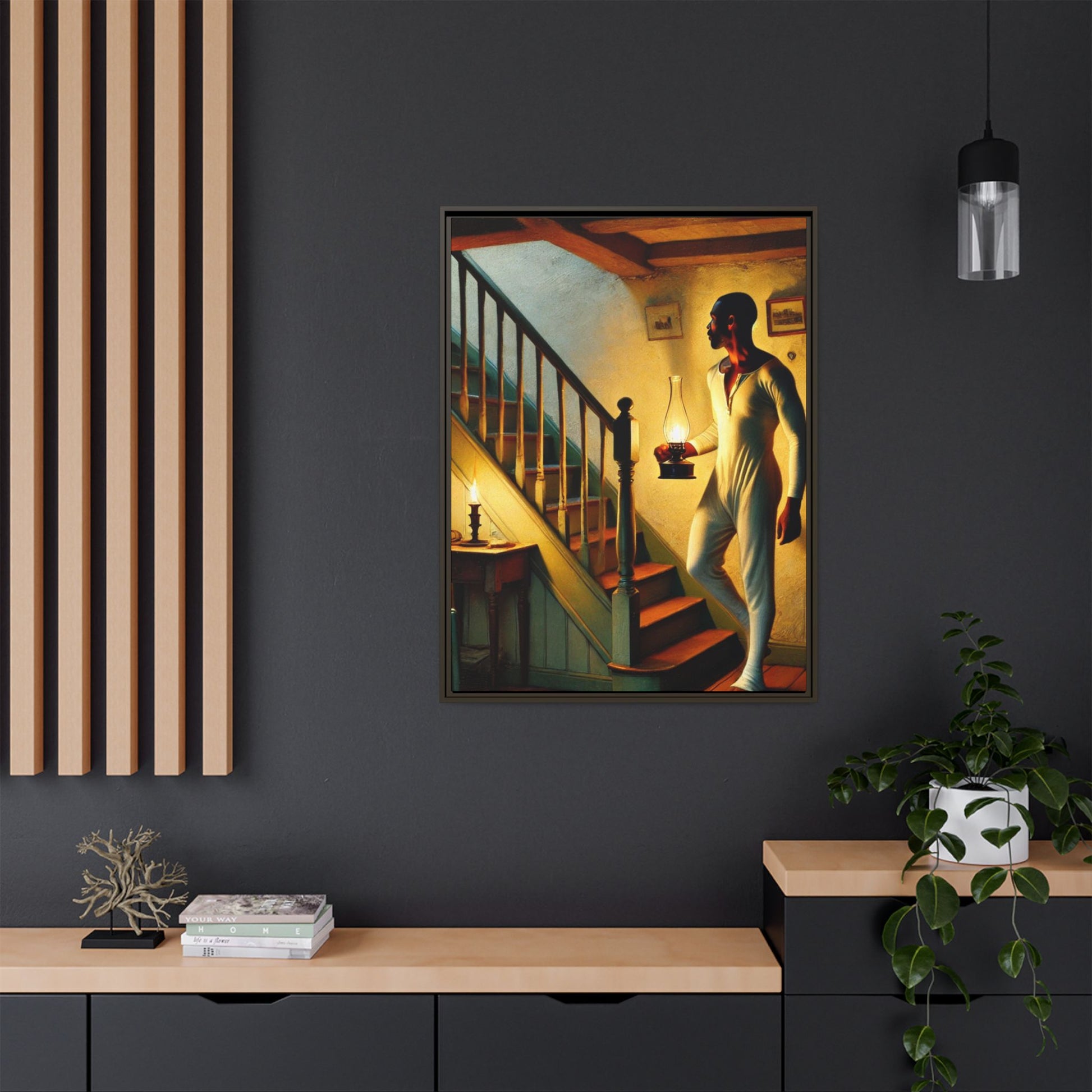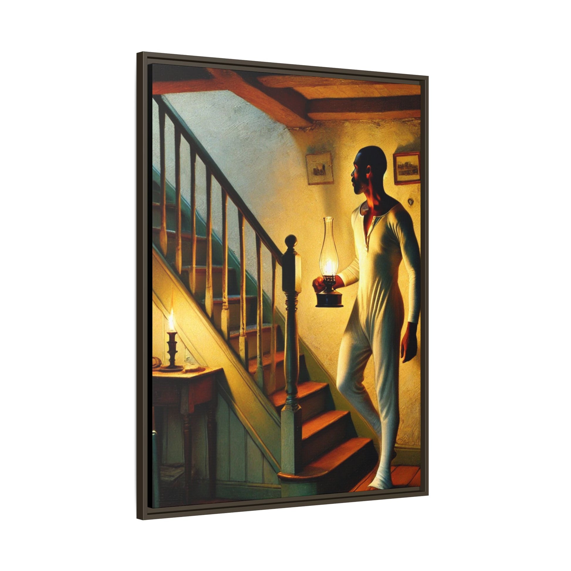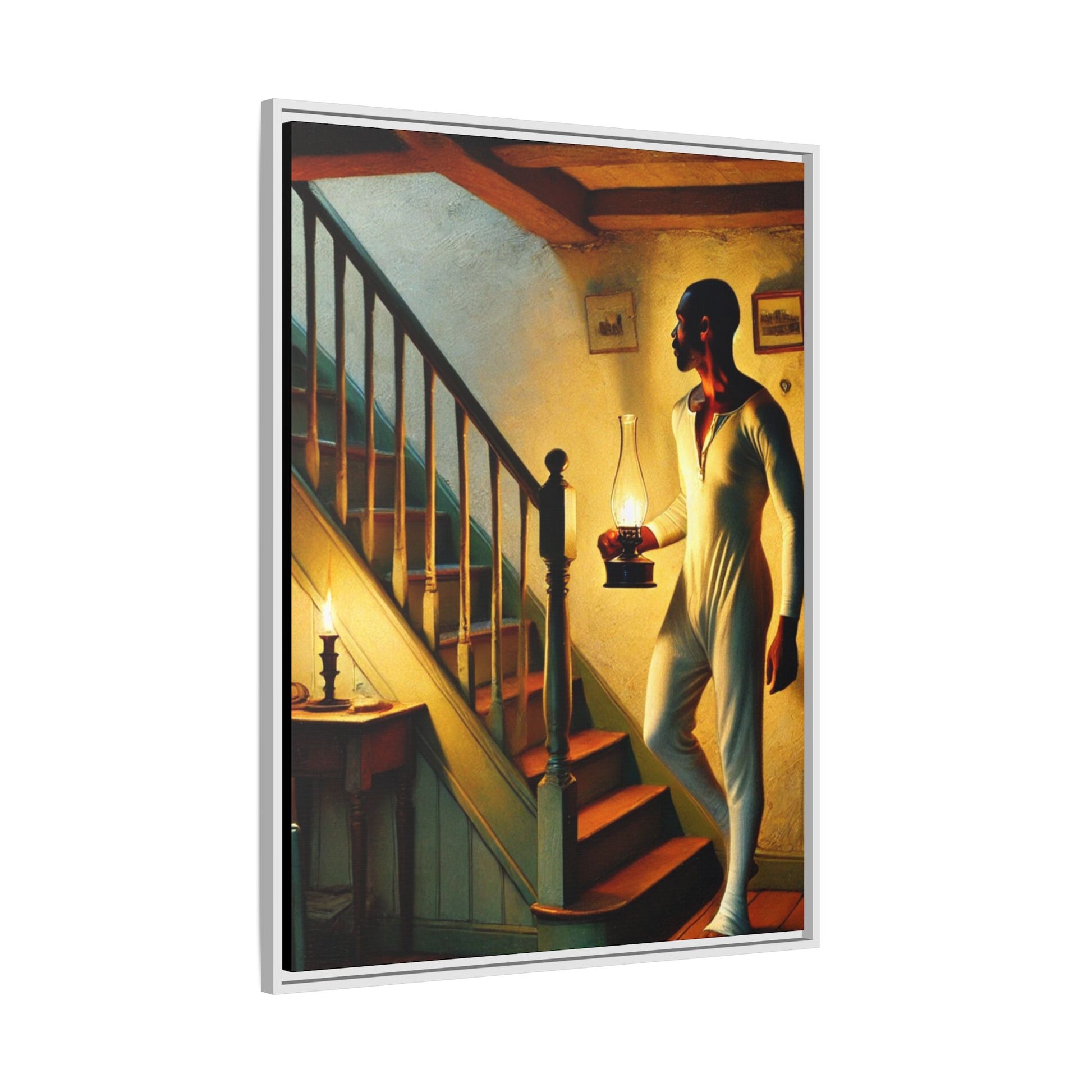 This framed artwork portrays an African-American man descending a staircase while holding an oil lantern, lighting a warm glow on the scene. He is dressed in a white, long-sleeved, ribbed onesie, evoking a vintage or historical atmosphere. His bare feet tread carefully on the polished wooden steps, and his posture and expression suggest attentiveness or caution as he gazes toward the source of the light or sound.