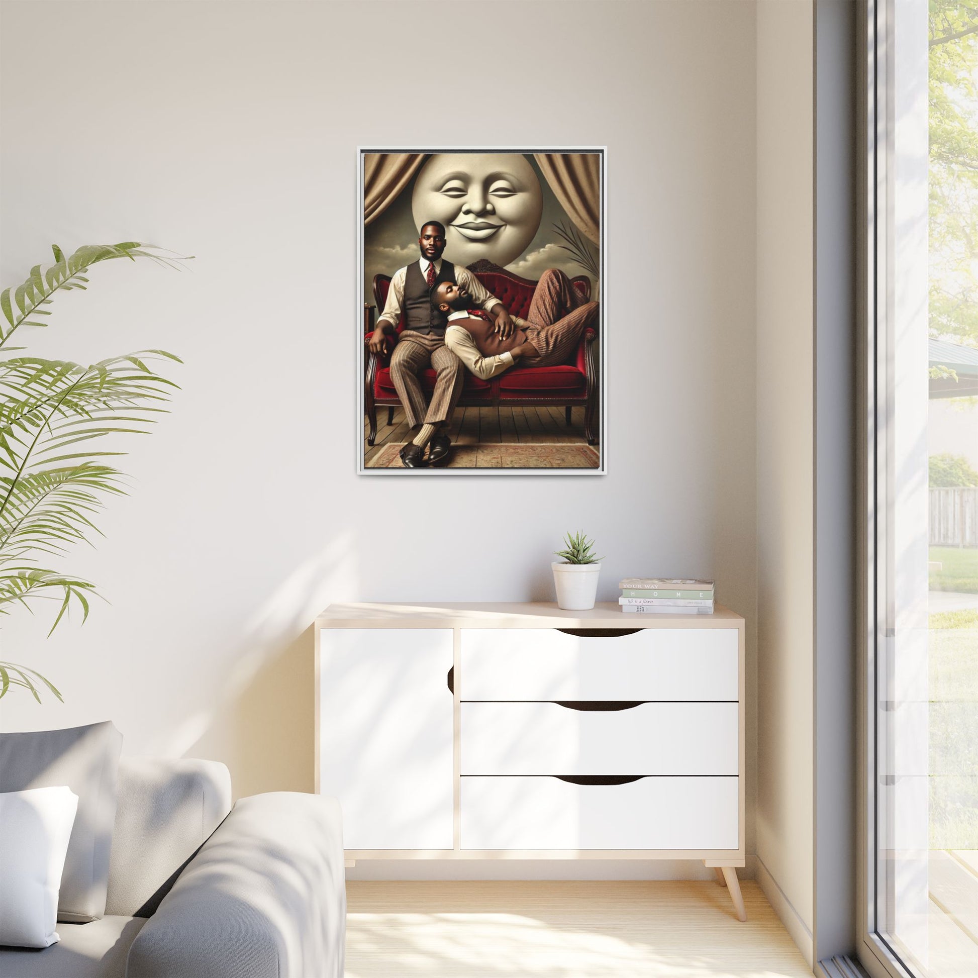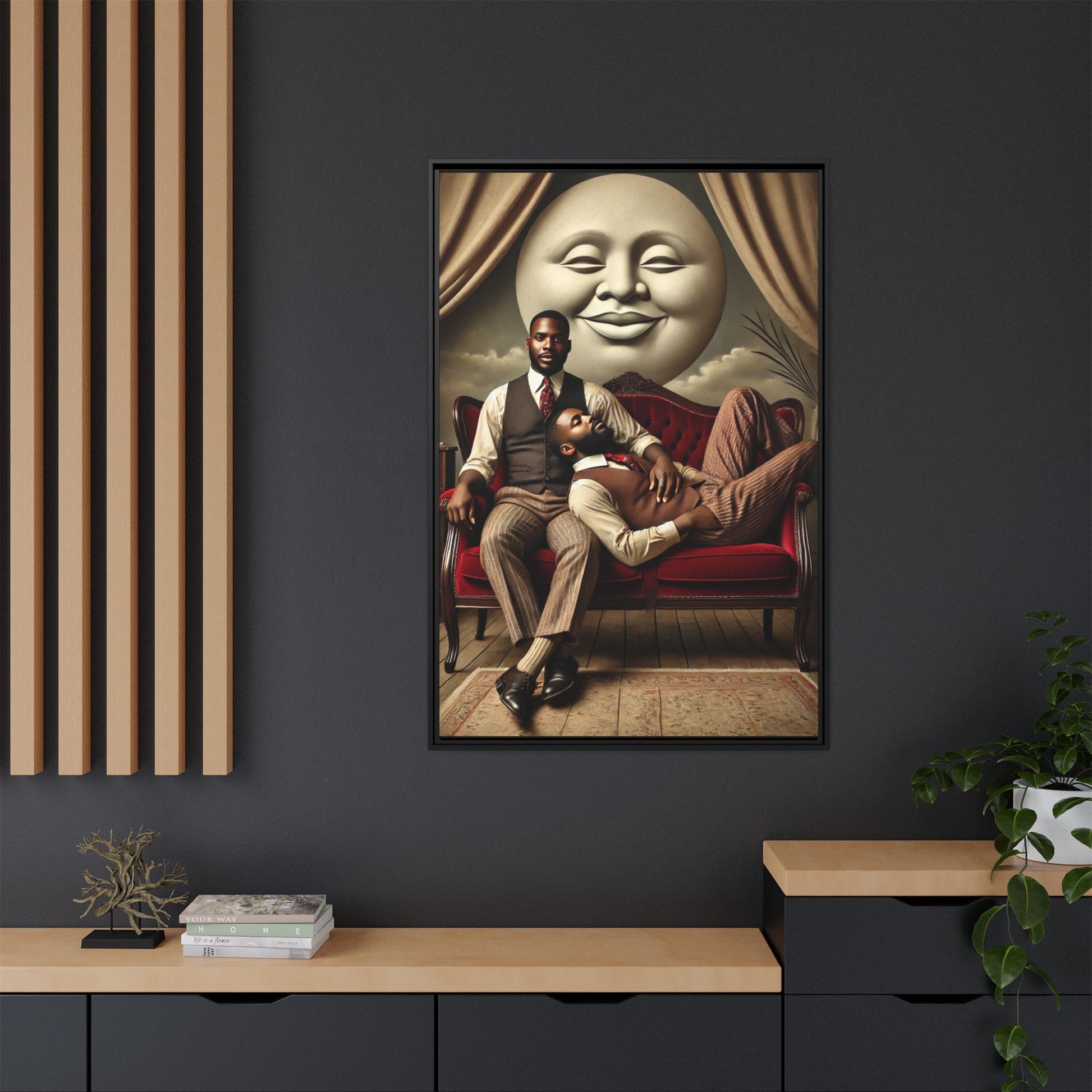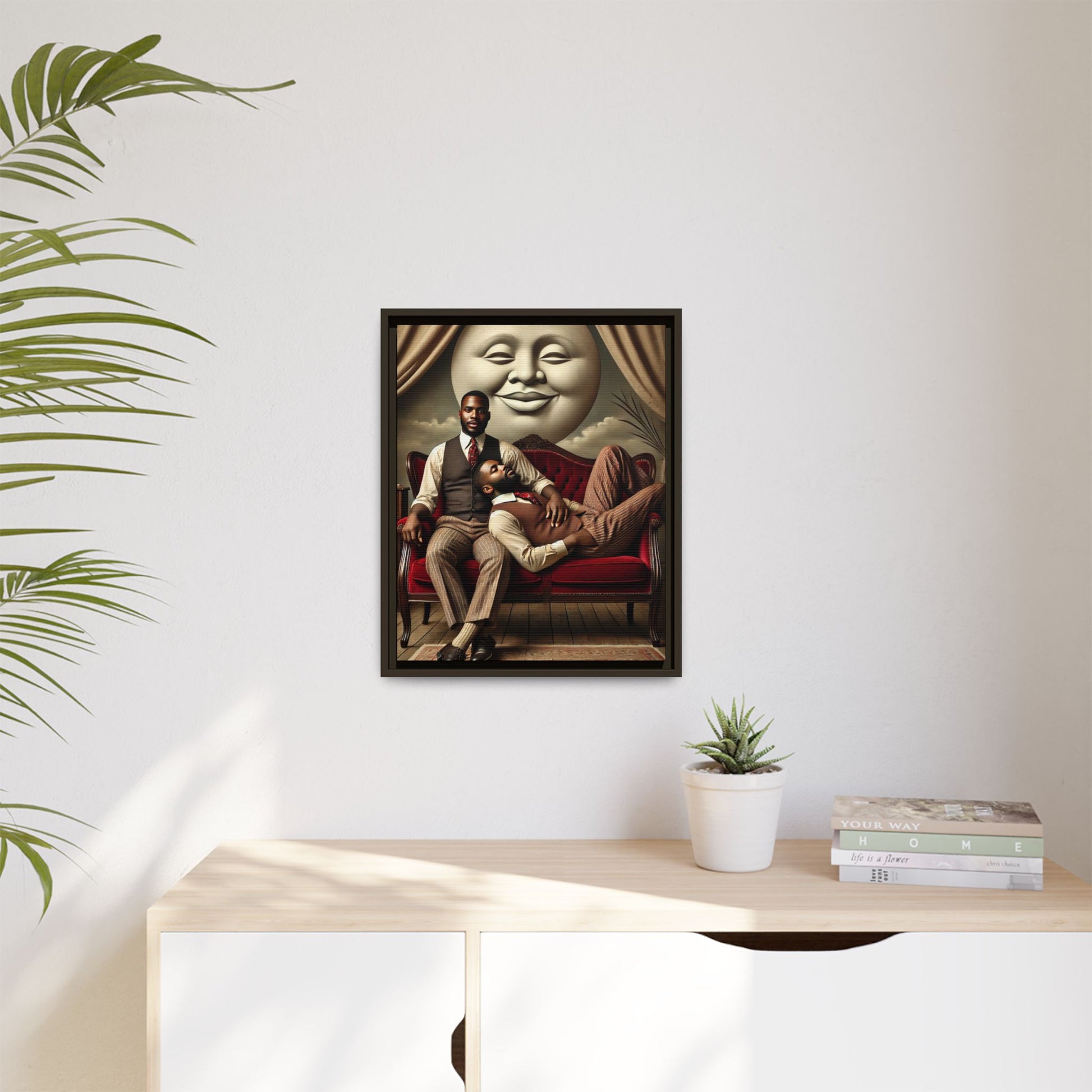 This original piece portrays two Black men sharing a moment of quiet intimacy and strength. One sits tall and composed on a red velvet settee, while the other reclines with his head resting gently in the seated man’s lap, held close in a tender, protective embrace. The vintage setting is complete with rich wood flooring, a deep crimson backdrop, and heavy velvet curtains framing a soft, smiling full moon that looms large and luminous in the sky.