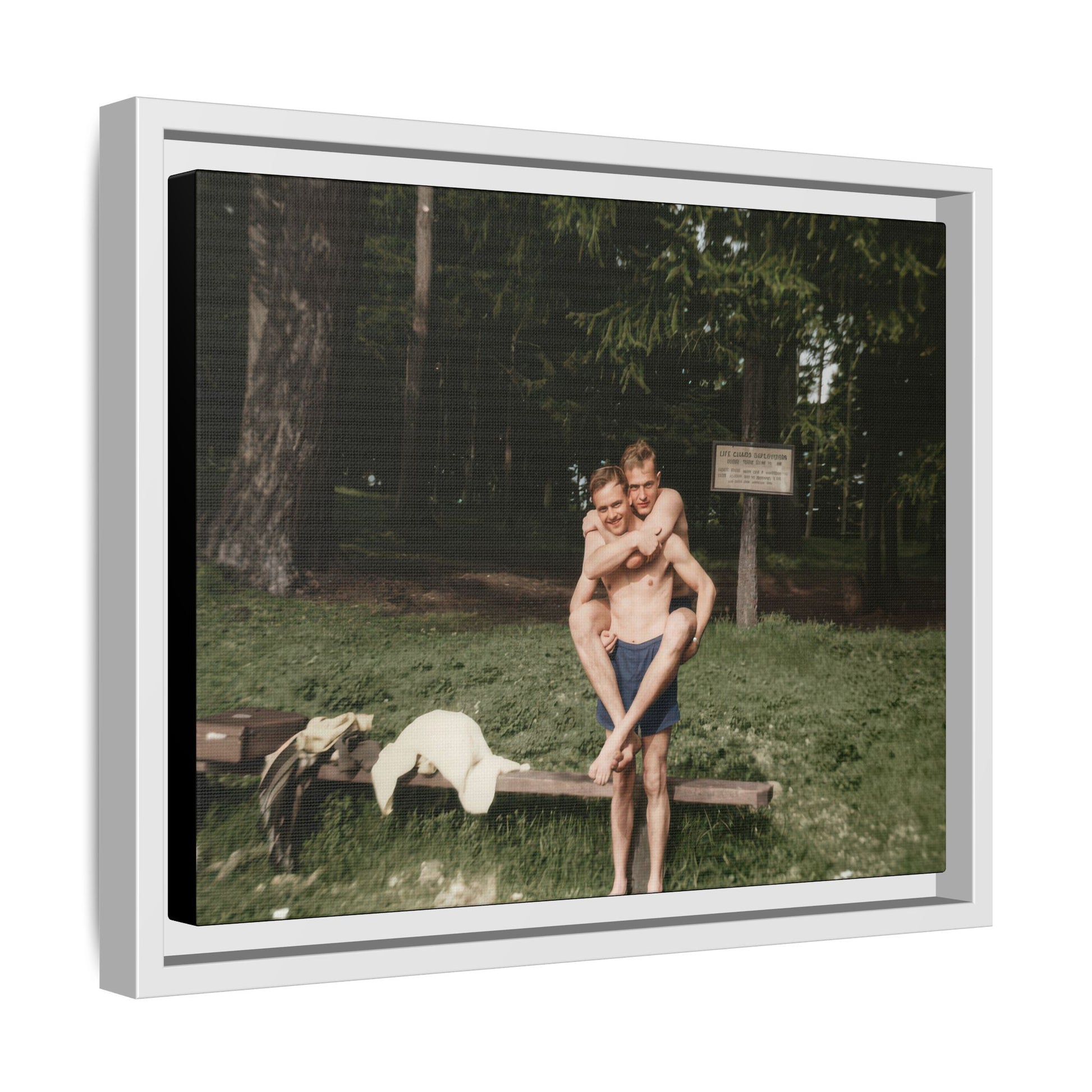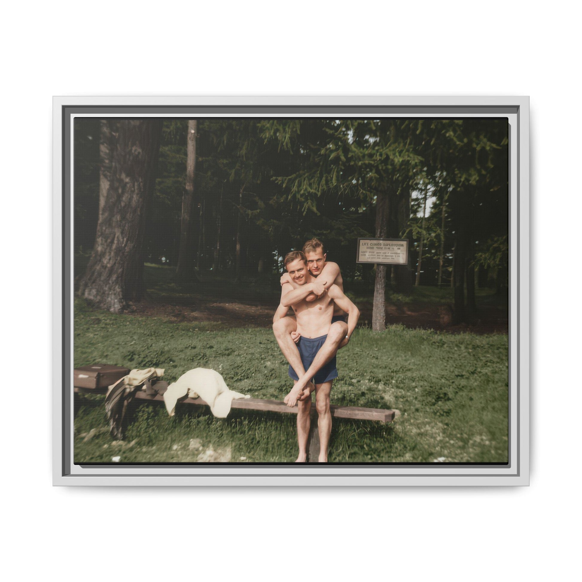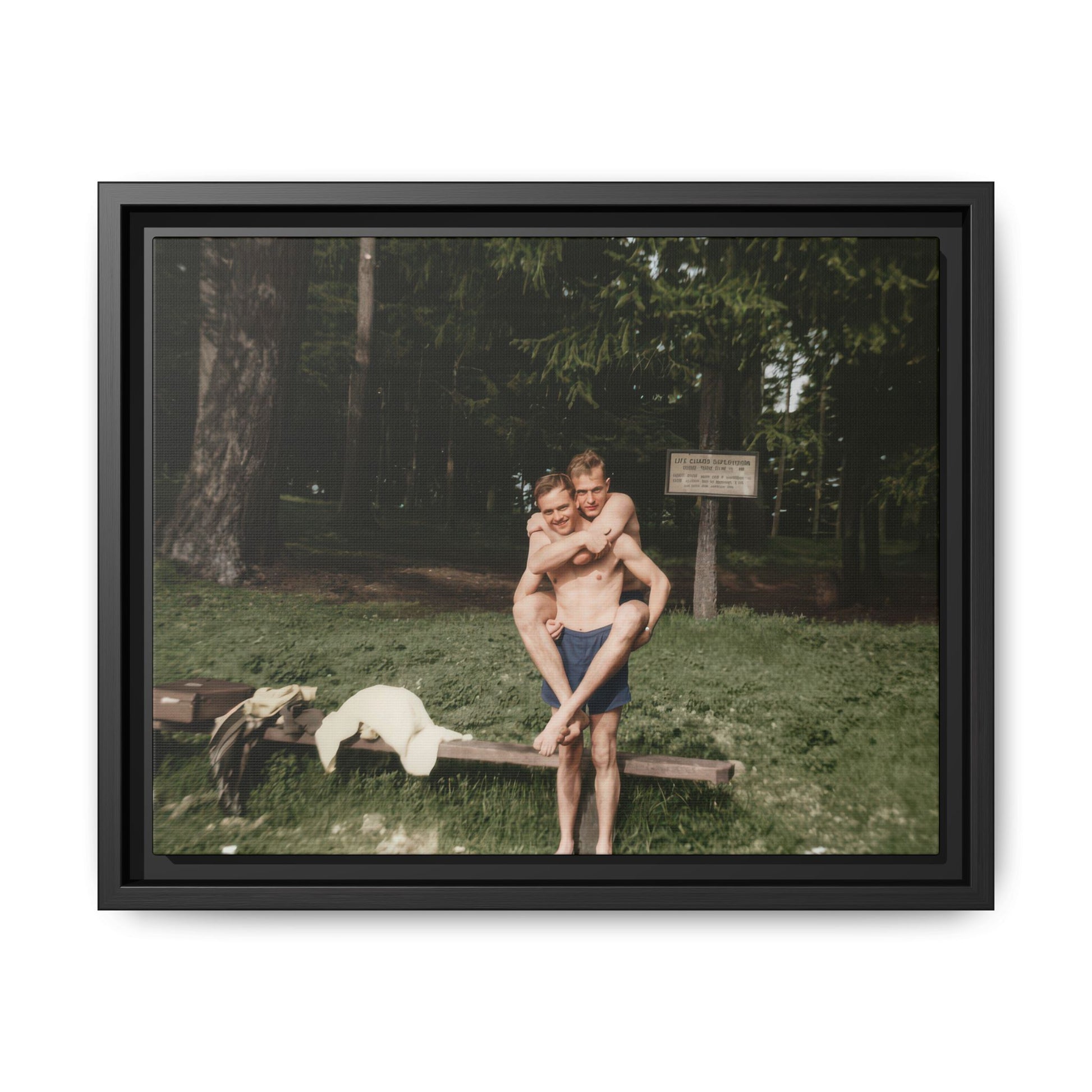 Title: Two Men in Bathing Trunks with Bench and Signboard in Woodland Setting