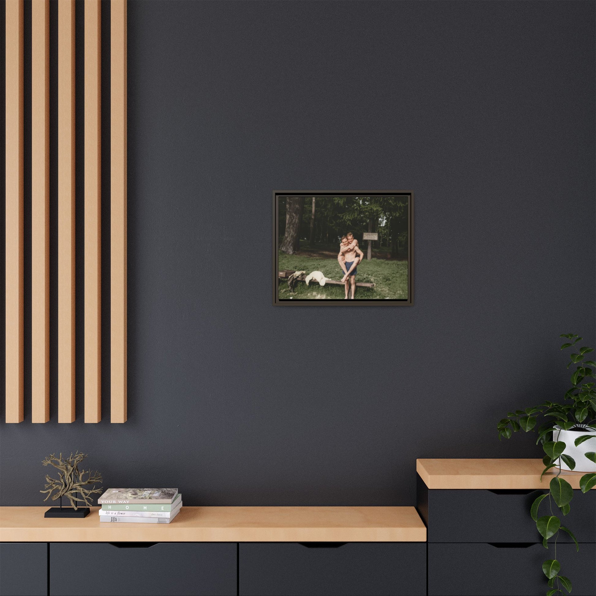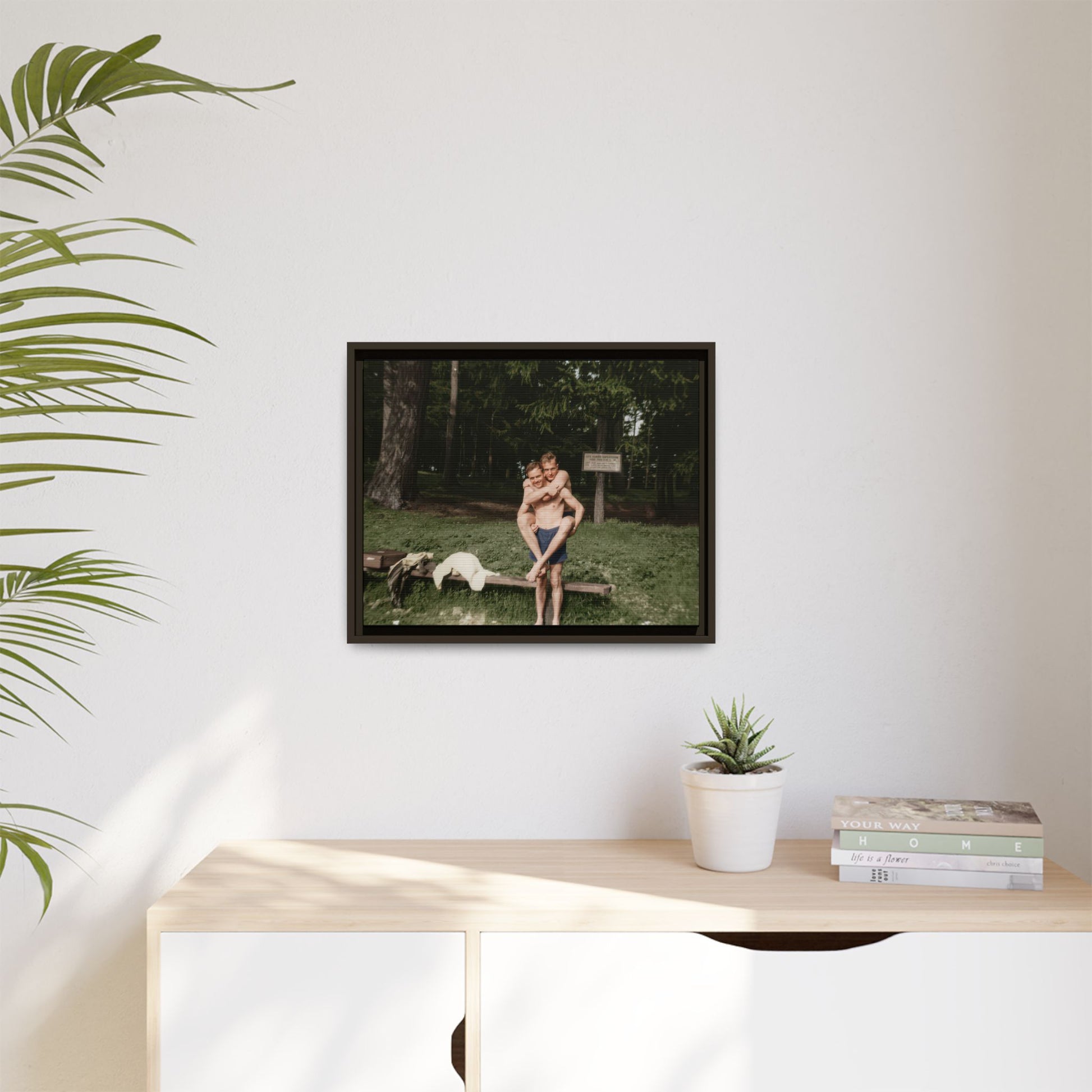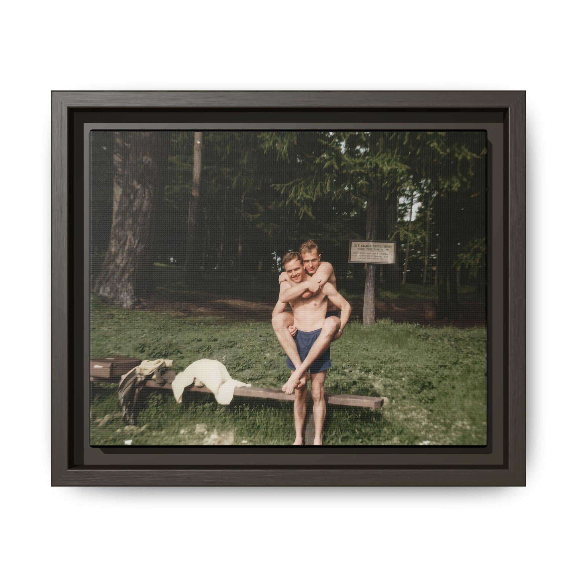 Title: Two Men in Bathing Trunks with Bench and Signboard in Woodland Setting