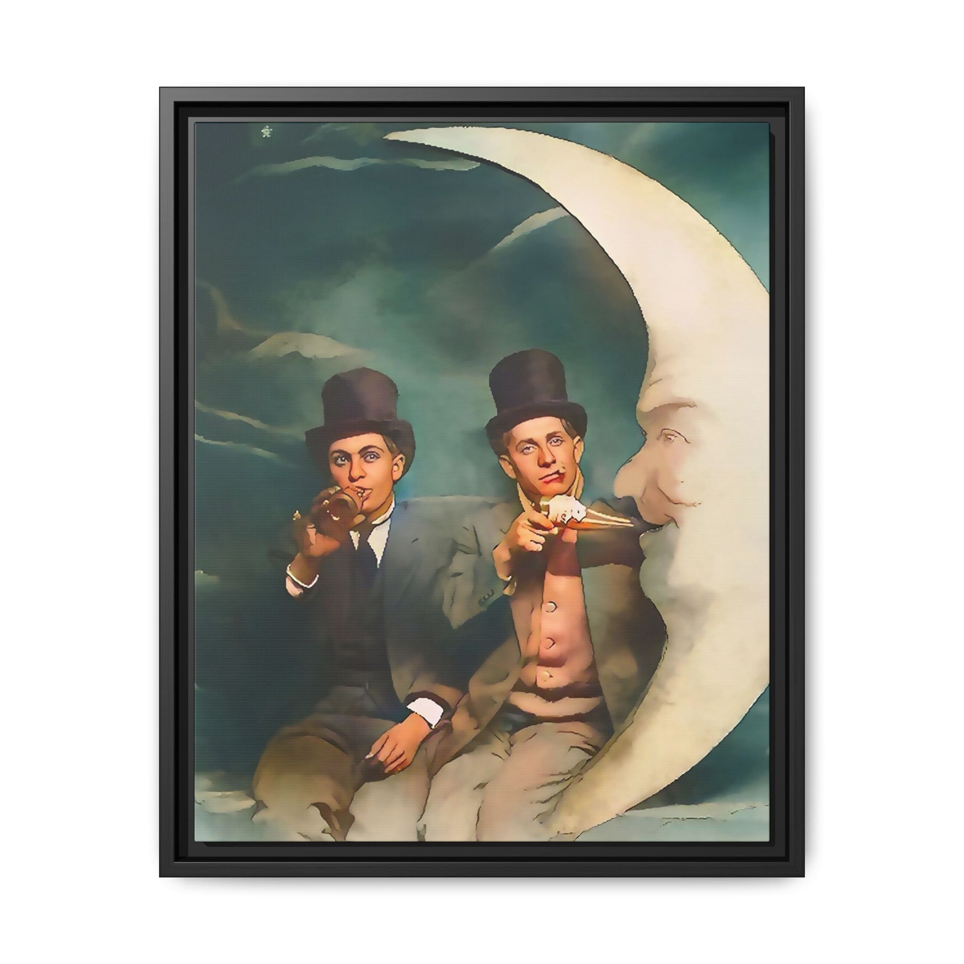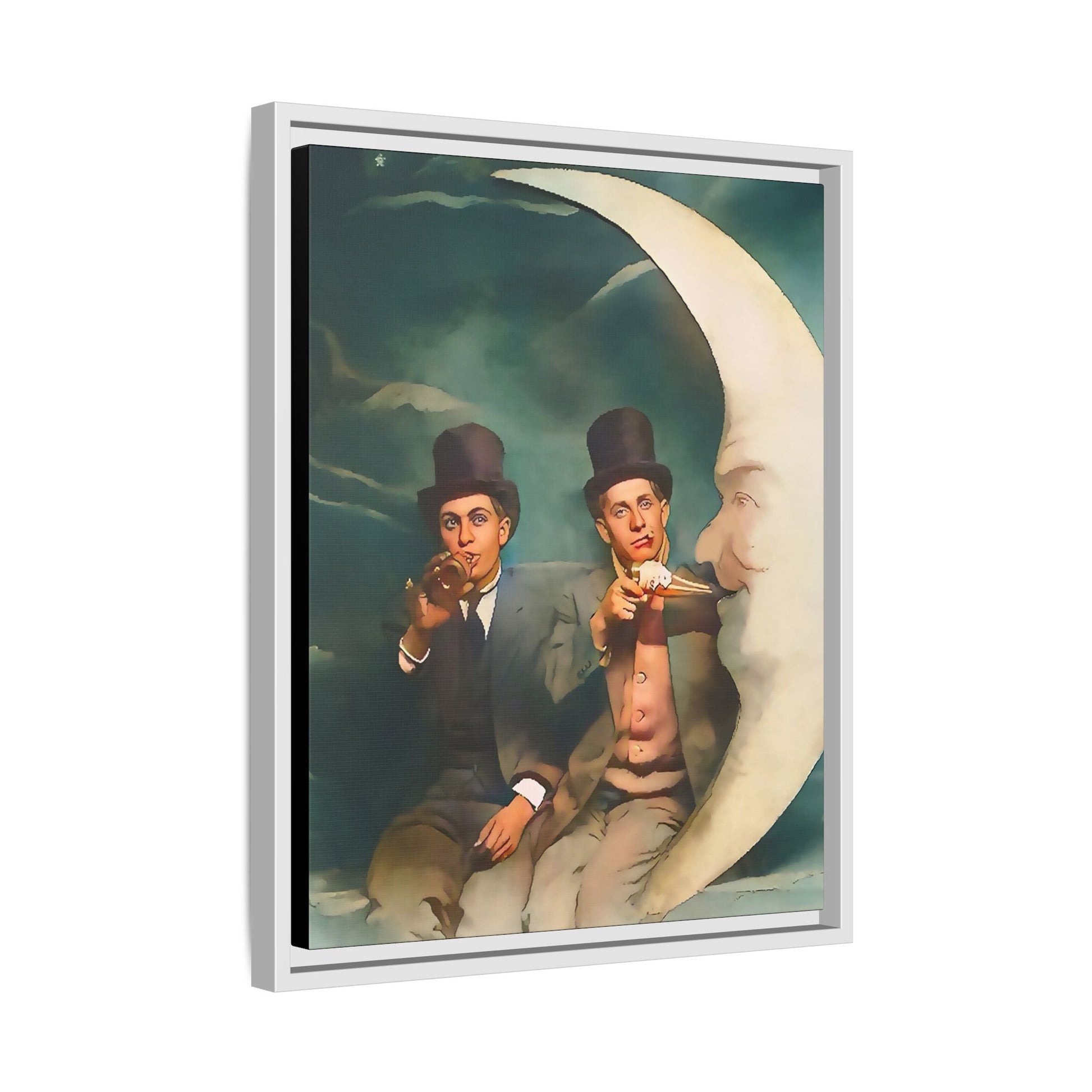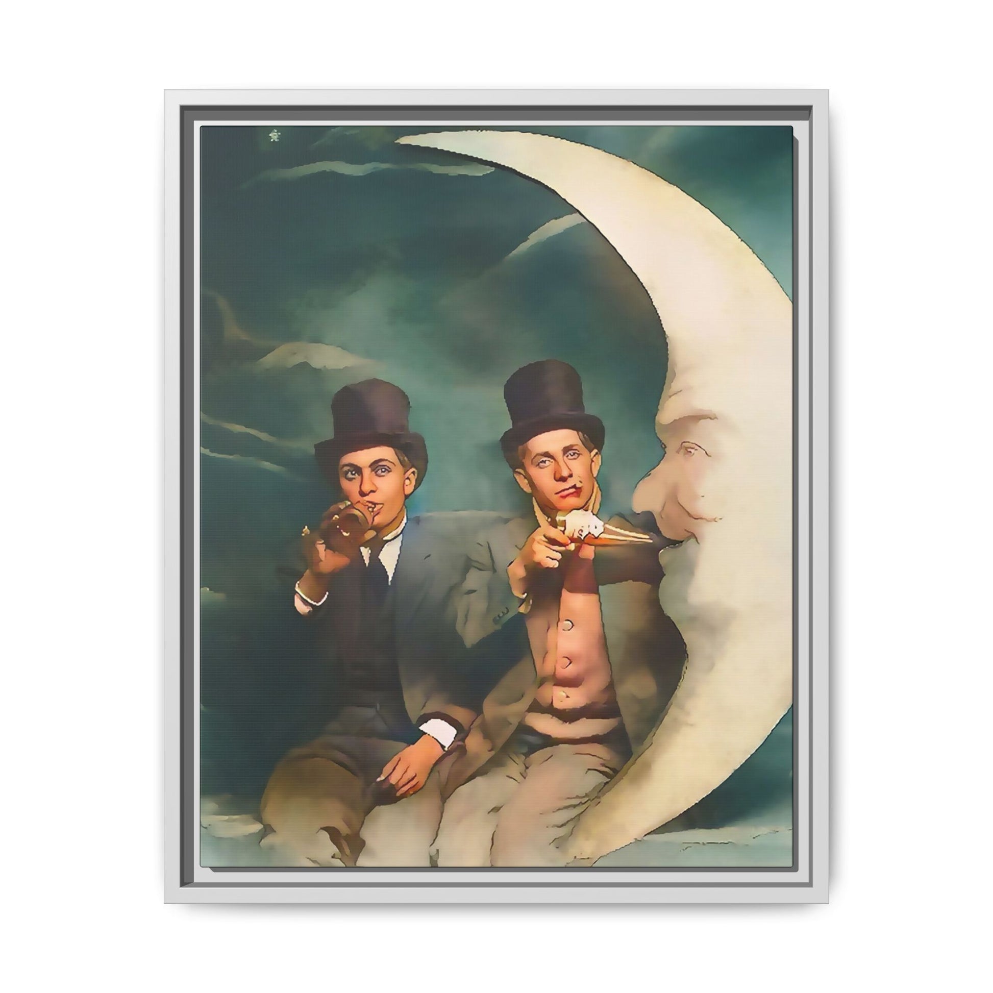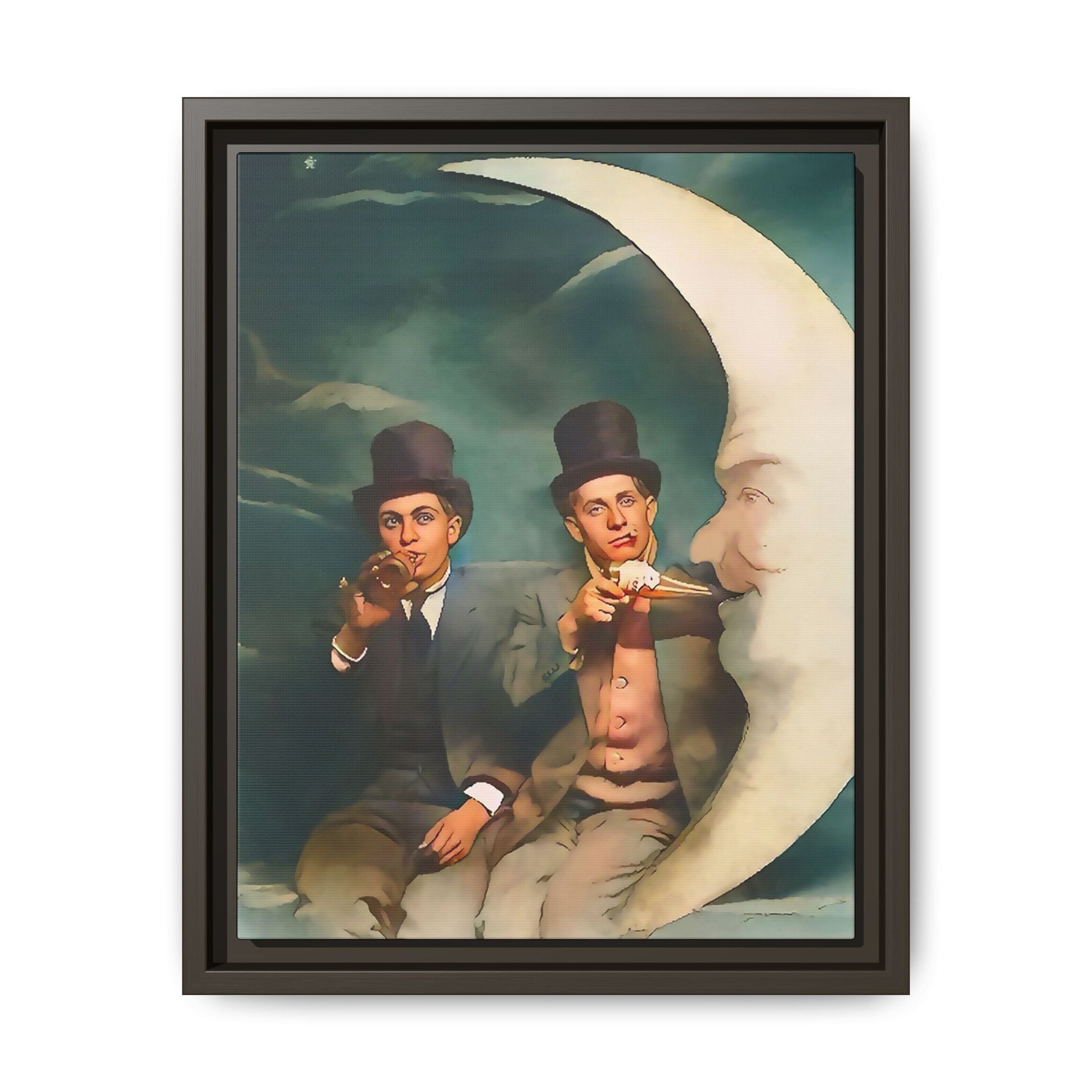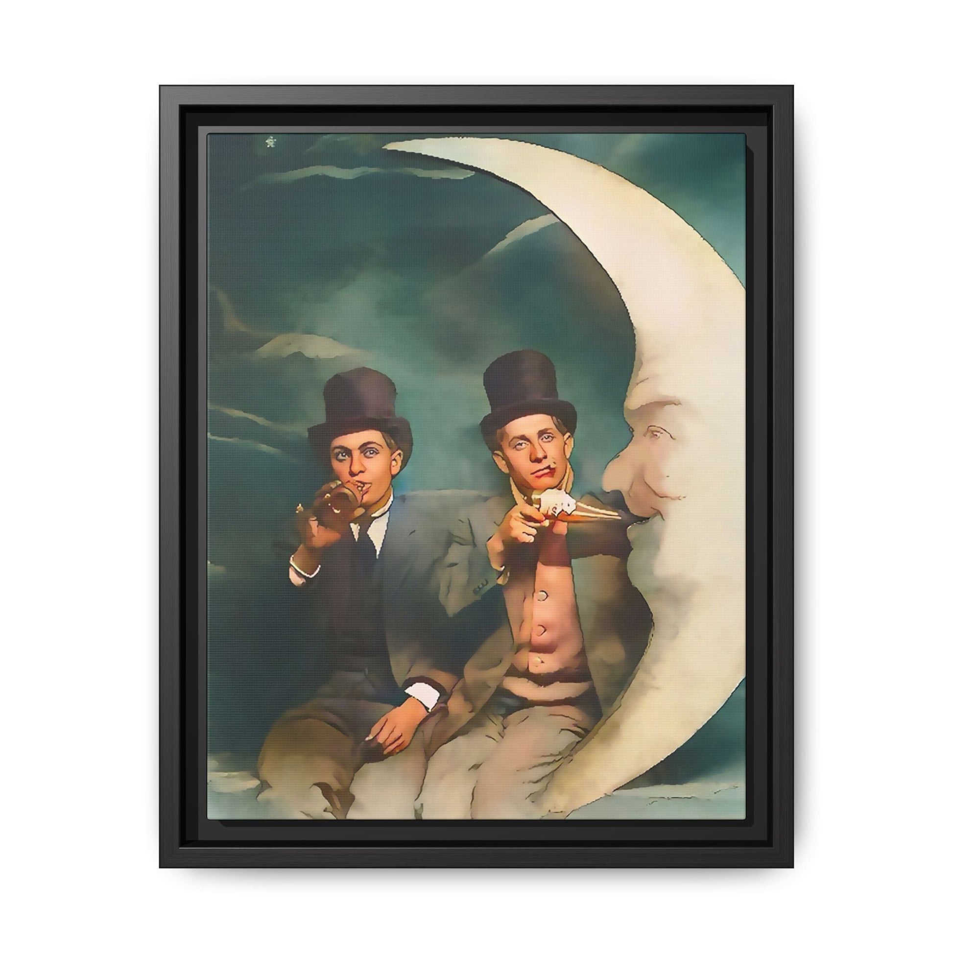 Step into the whimsical romance of Charles and Evan, captured in this enchanting photograph that feels like a page out of a dream. Seated on a crescent moon, the couple dons elegant top hats, their joyous expressions illuminated by the ethereal glow of the celestial backdrop. This beautifully restored and colorized vintage photo celebrates love, artistry, and the playful spirit of early 20th-century studio photography.