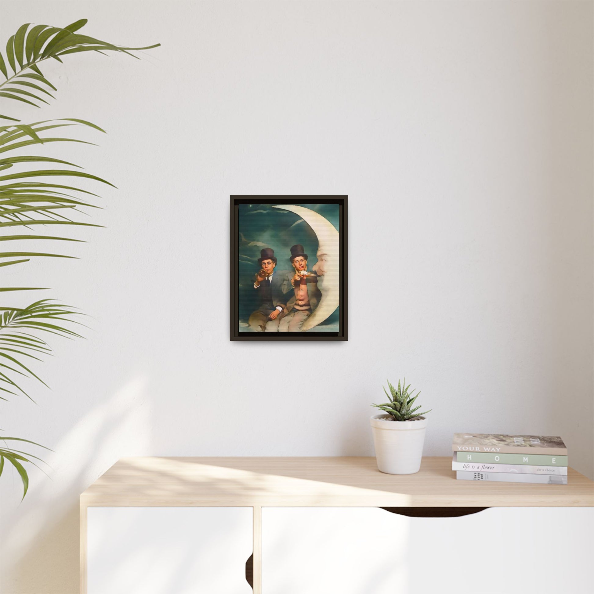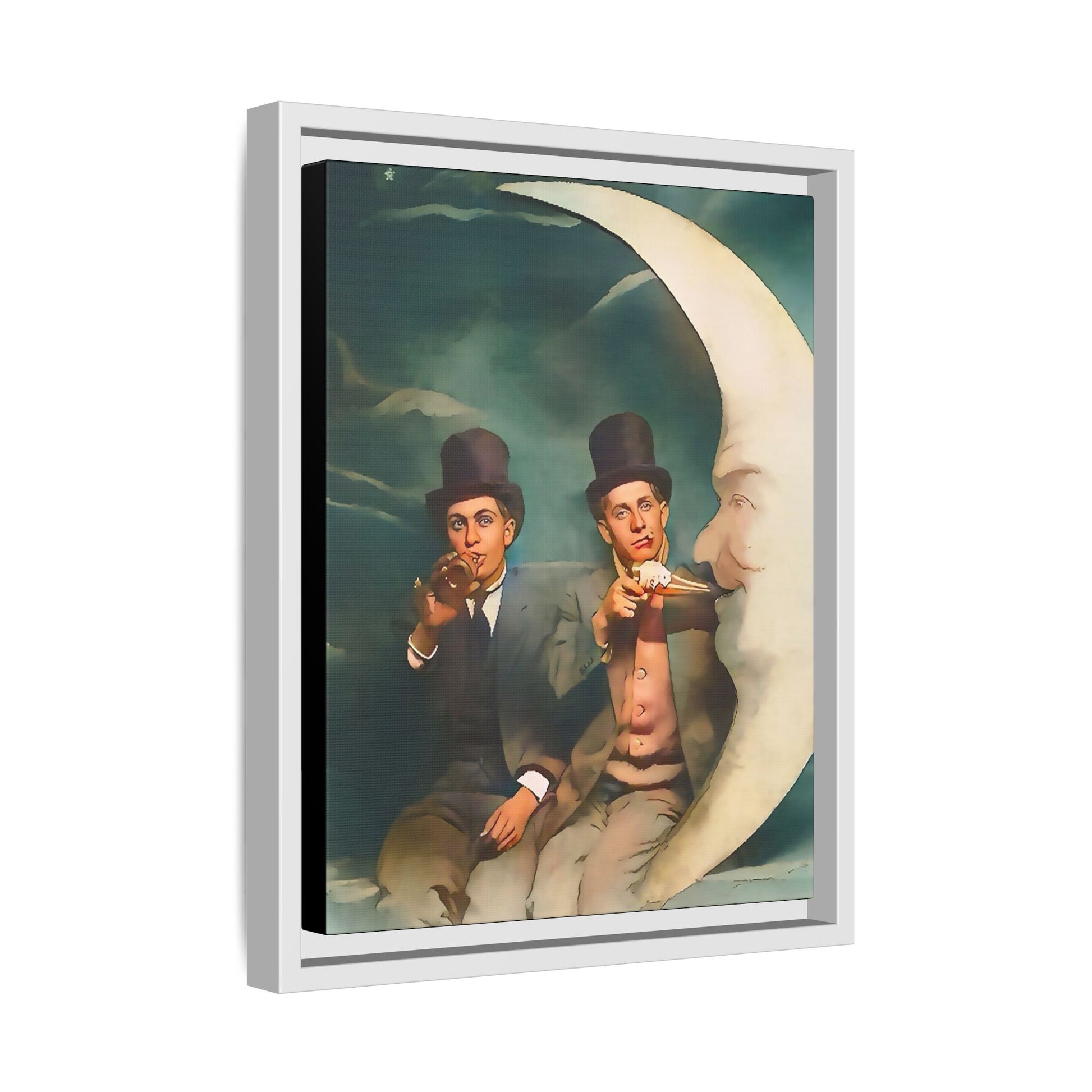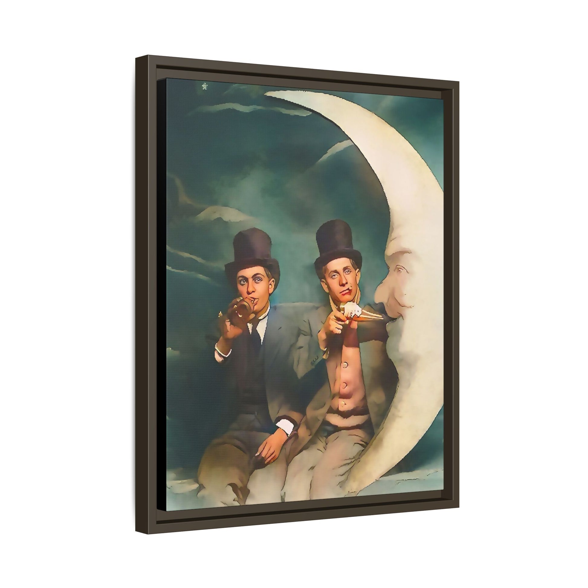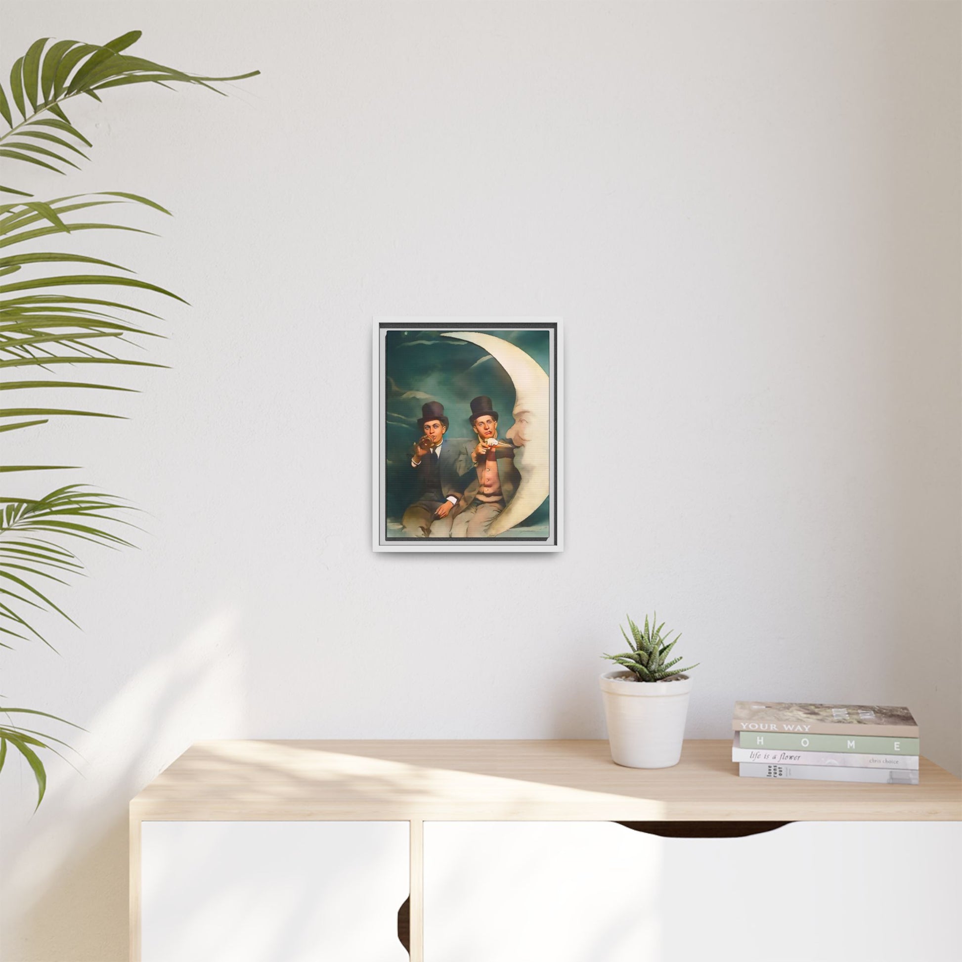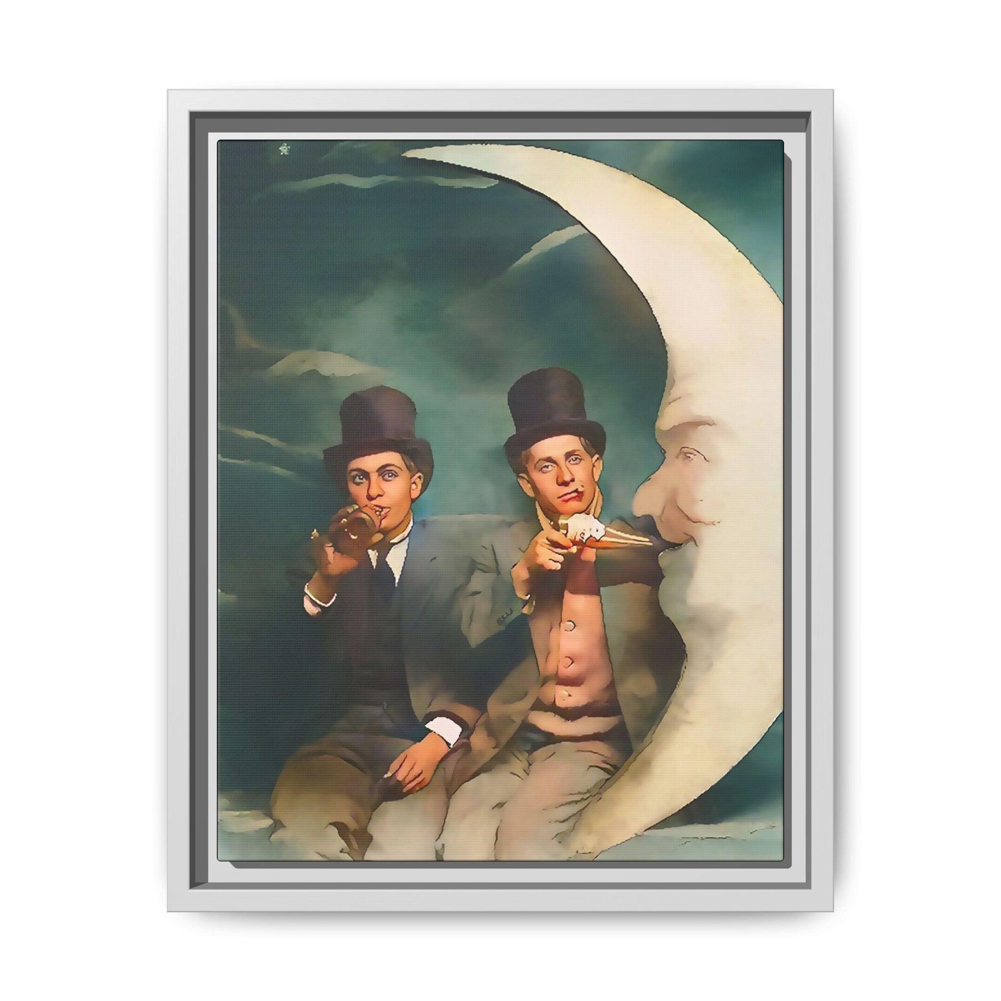 Step into the whimsical romance of Charles and Evan, captured in this enchanting photograph that feels like a page out of a dream. Seated on a crescent moon, the couple dons elegant top hats, their joyous expressions illuminated by the ethereal glow of the celestial backdrop. This beautifully restored and colorized vintage photo celebrates love, artistry, and the playful spirit of early 20th-century studio photography.