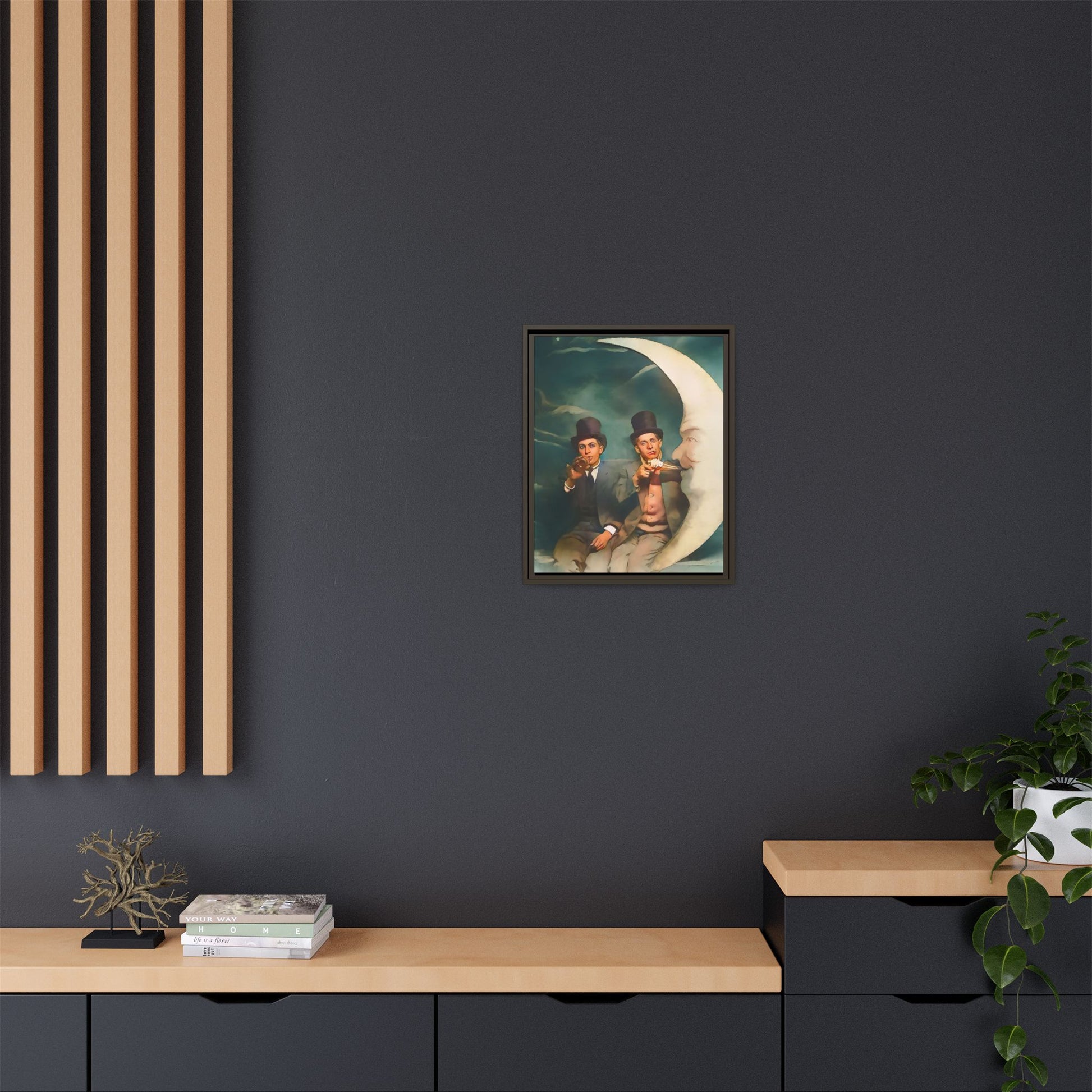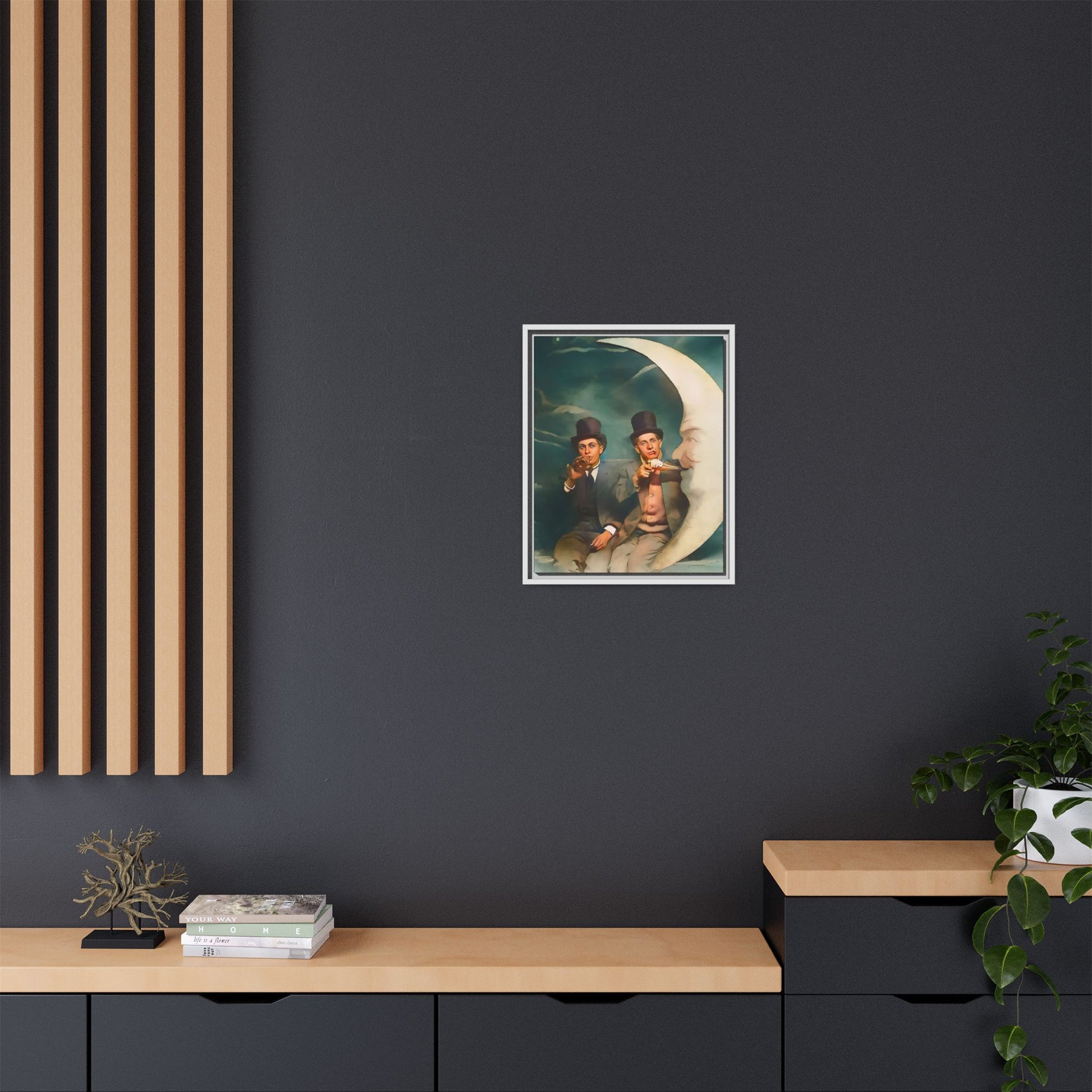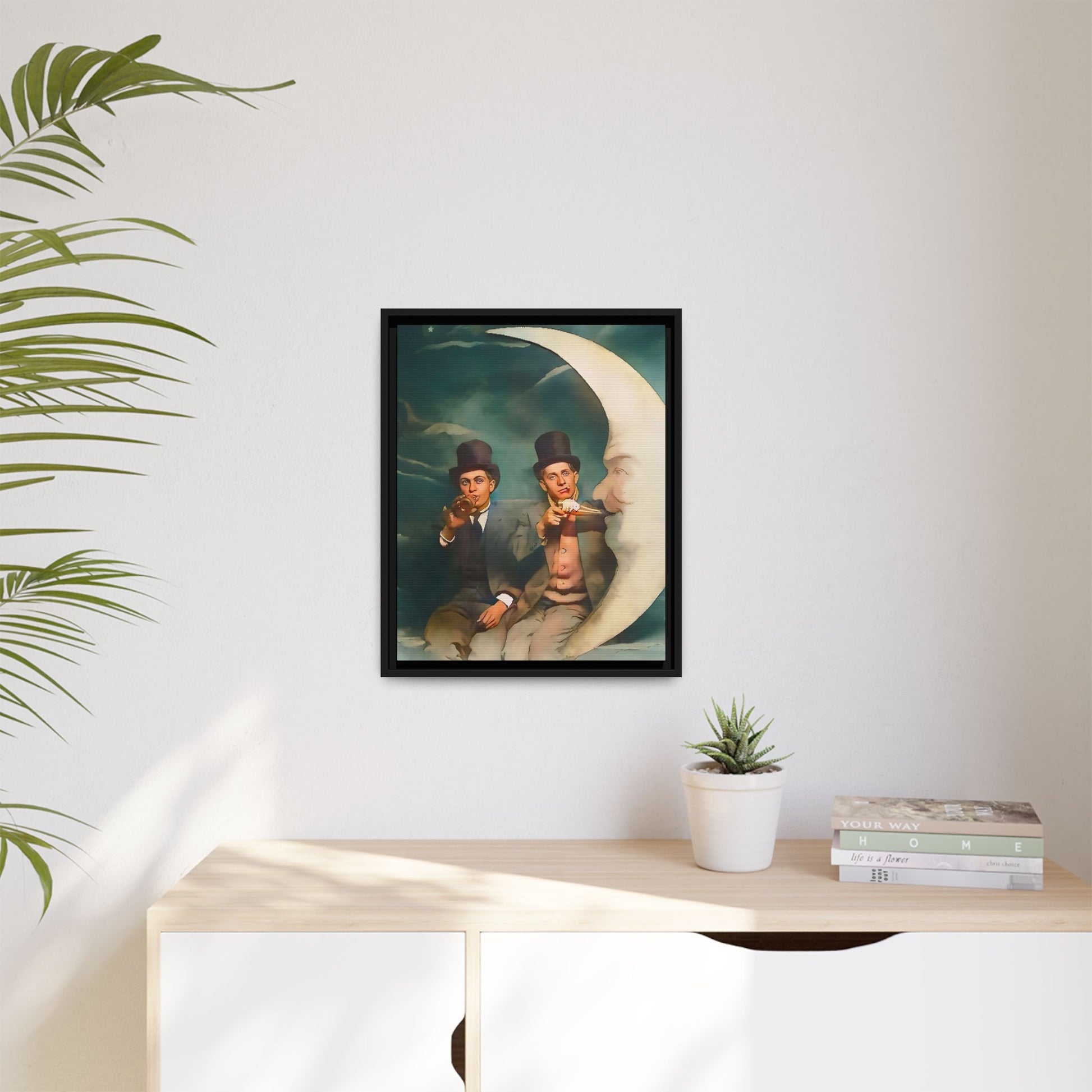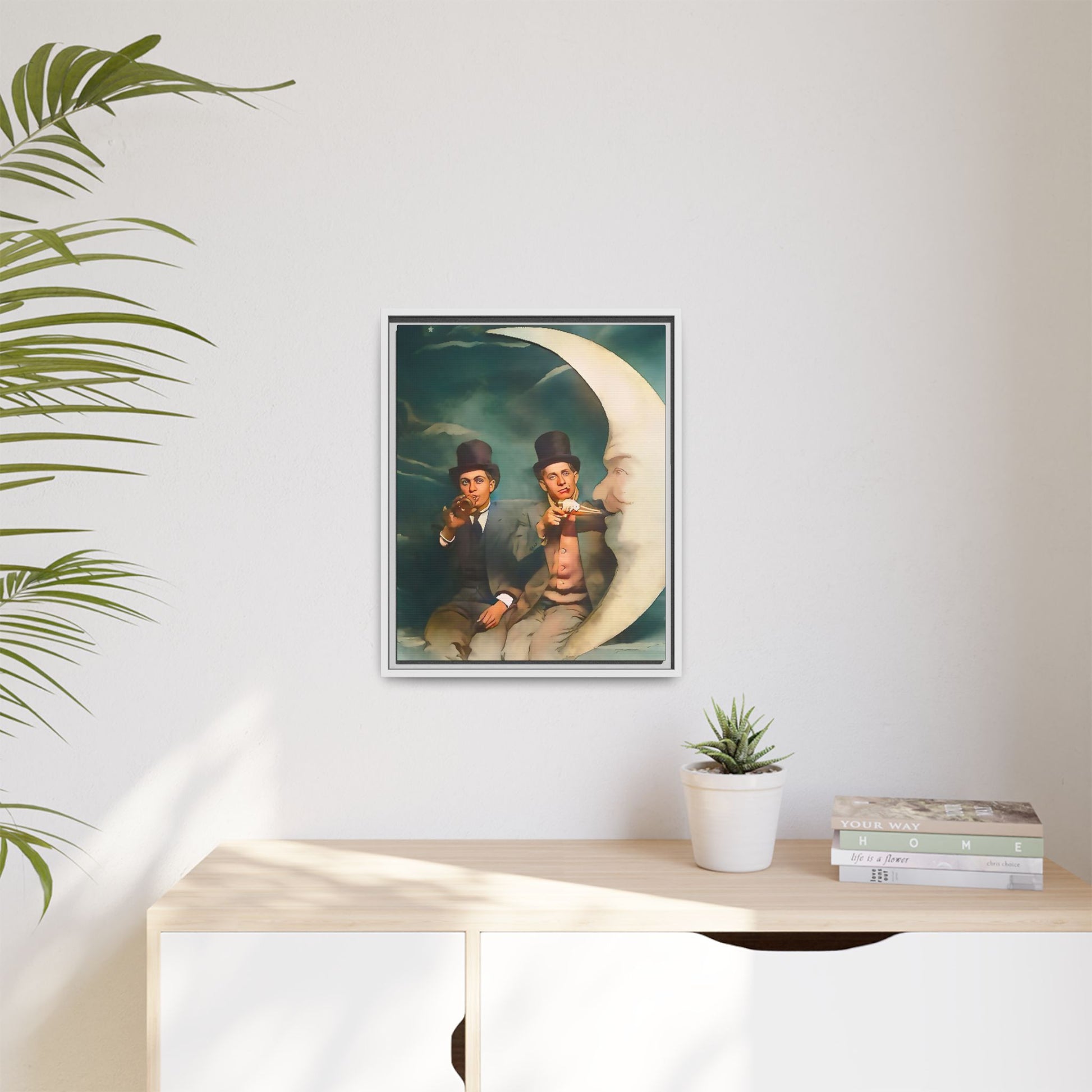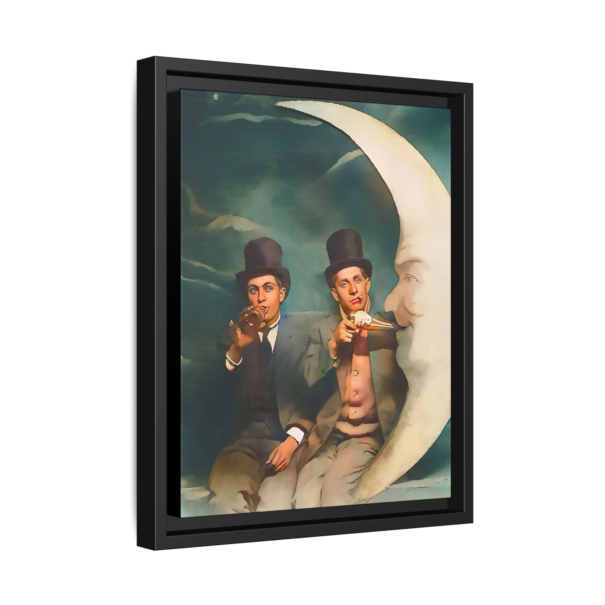 Step into the whimsical romance of Charles and Evan, captured in this enchanting photograph that feels like a page out of a dream. Seated on a crescent moon, the couple dons elegant top hats, their joyous expressions illuminated by the ethereal glow of the celestial backdrop. This beautifully restored and colorized vintage photo celebrates love, artistry, and the playful spirit of early 20th-century studio photography.