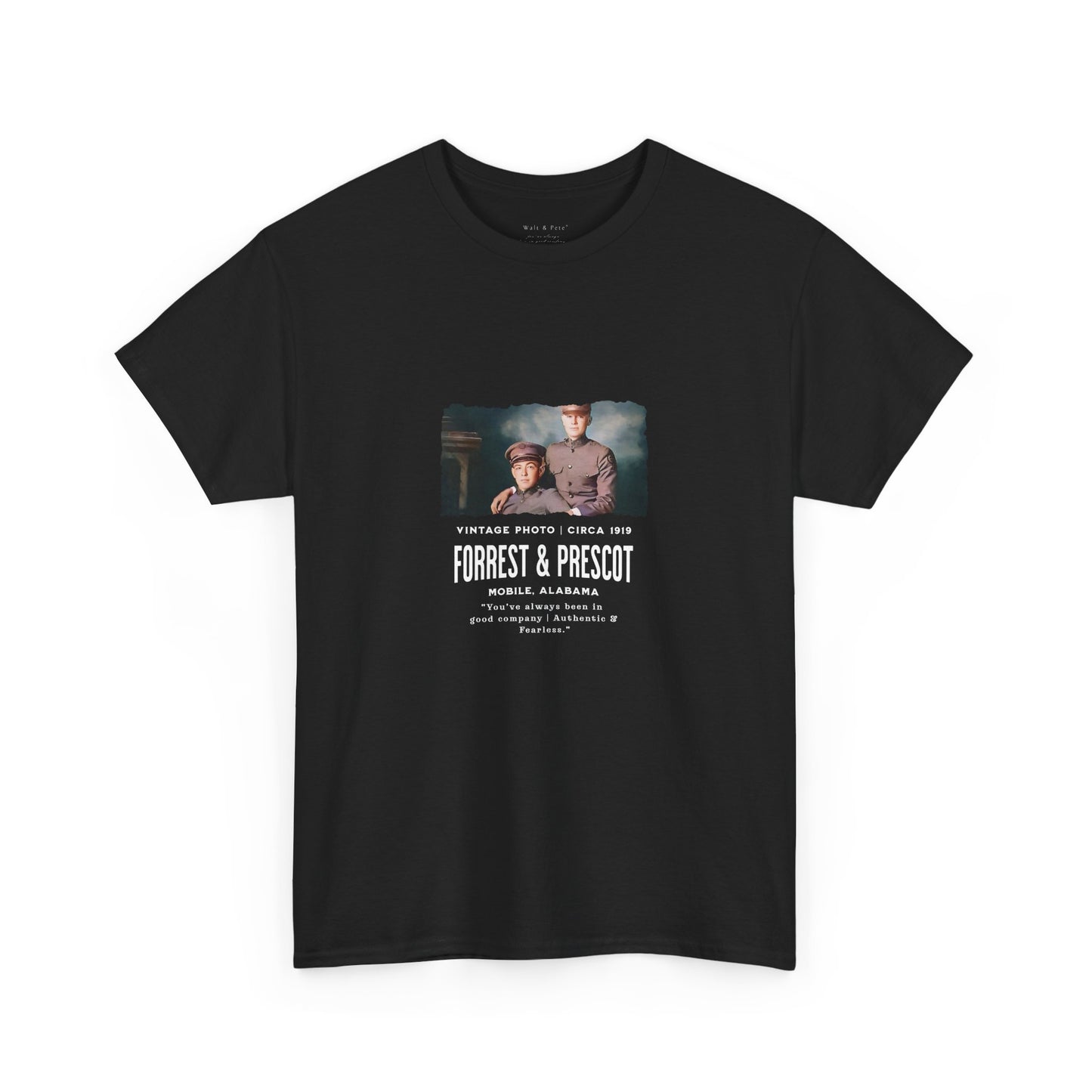Celebrate love and resilience with the "paire 001 | Vintage Photo - 1919 Forrest & Prescot, Mobile, Alabama | Be Charming" T-shirt. This beautifully restored and colorized photograph captures Forrest and Prescot, two young men from 1919, posing together in a portrait studio in Mobile, Alabama. Dressed in UMC dress uniforms, they sit close, with one casually resting his leg over the arm of the chair and the other wrapping an arm around his partner’s shoulder. Their confident expressions and affectionate pose, set against a backdrop of soft blue clouds, speak to a love that endures despite society’s expectations.