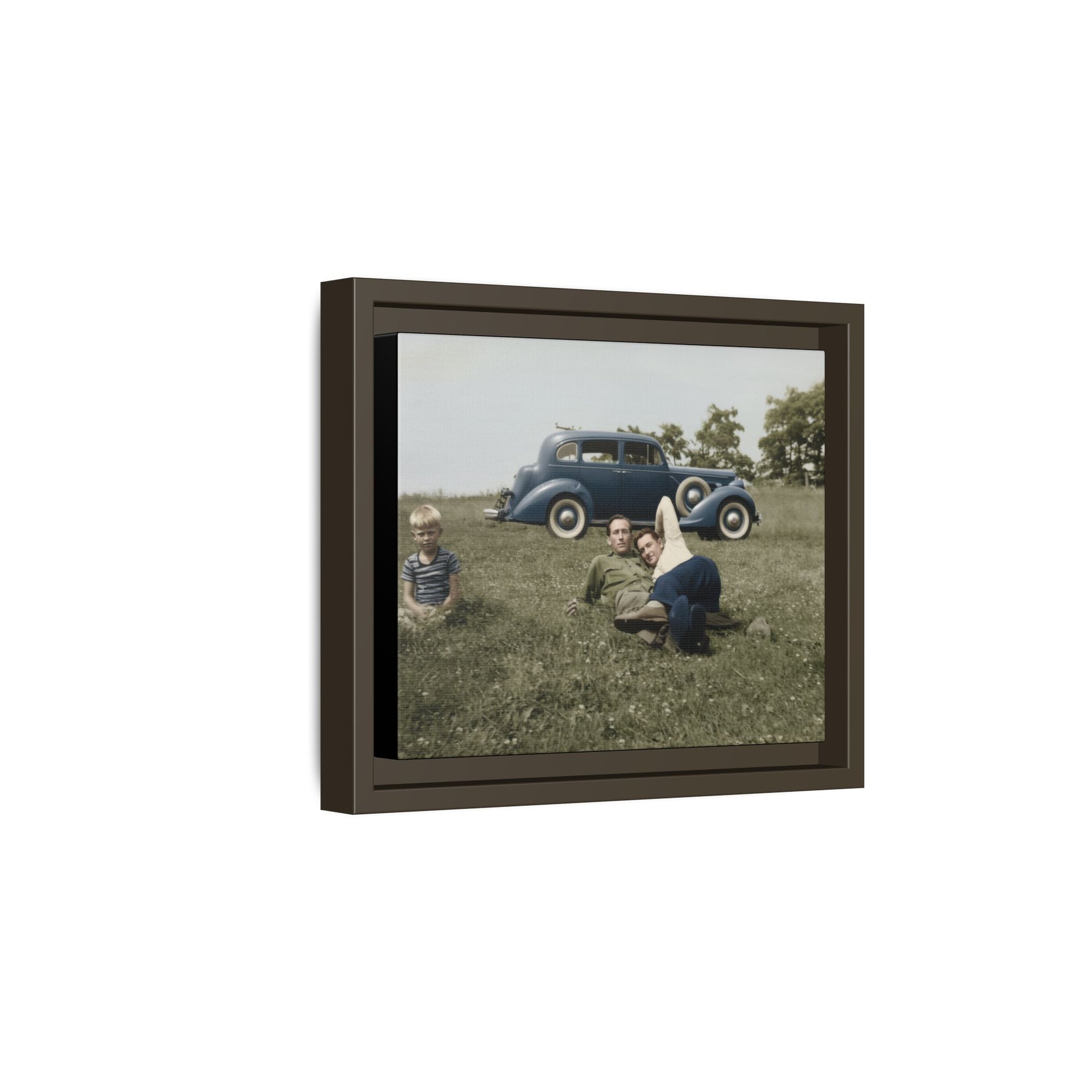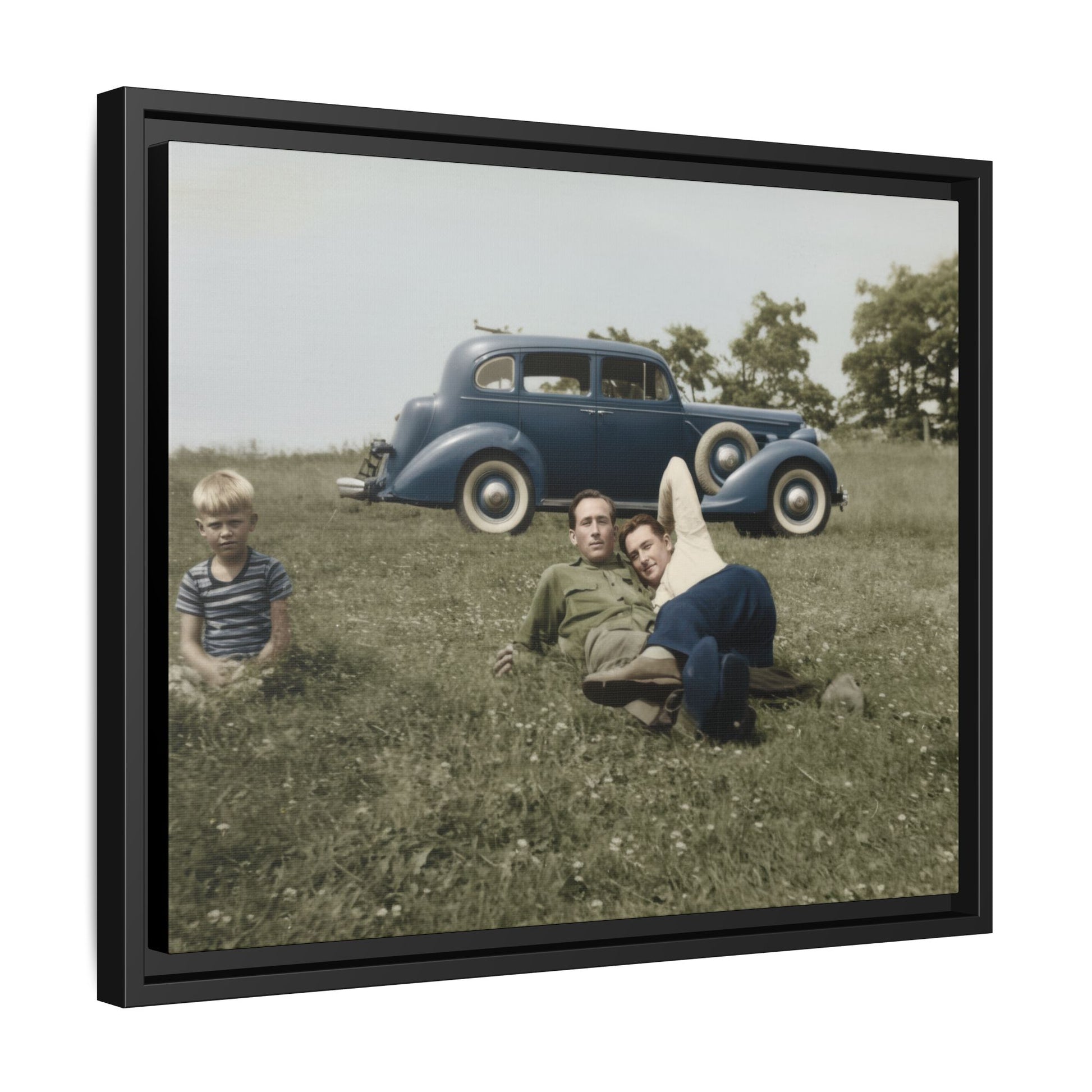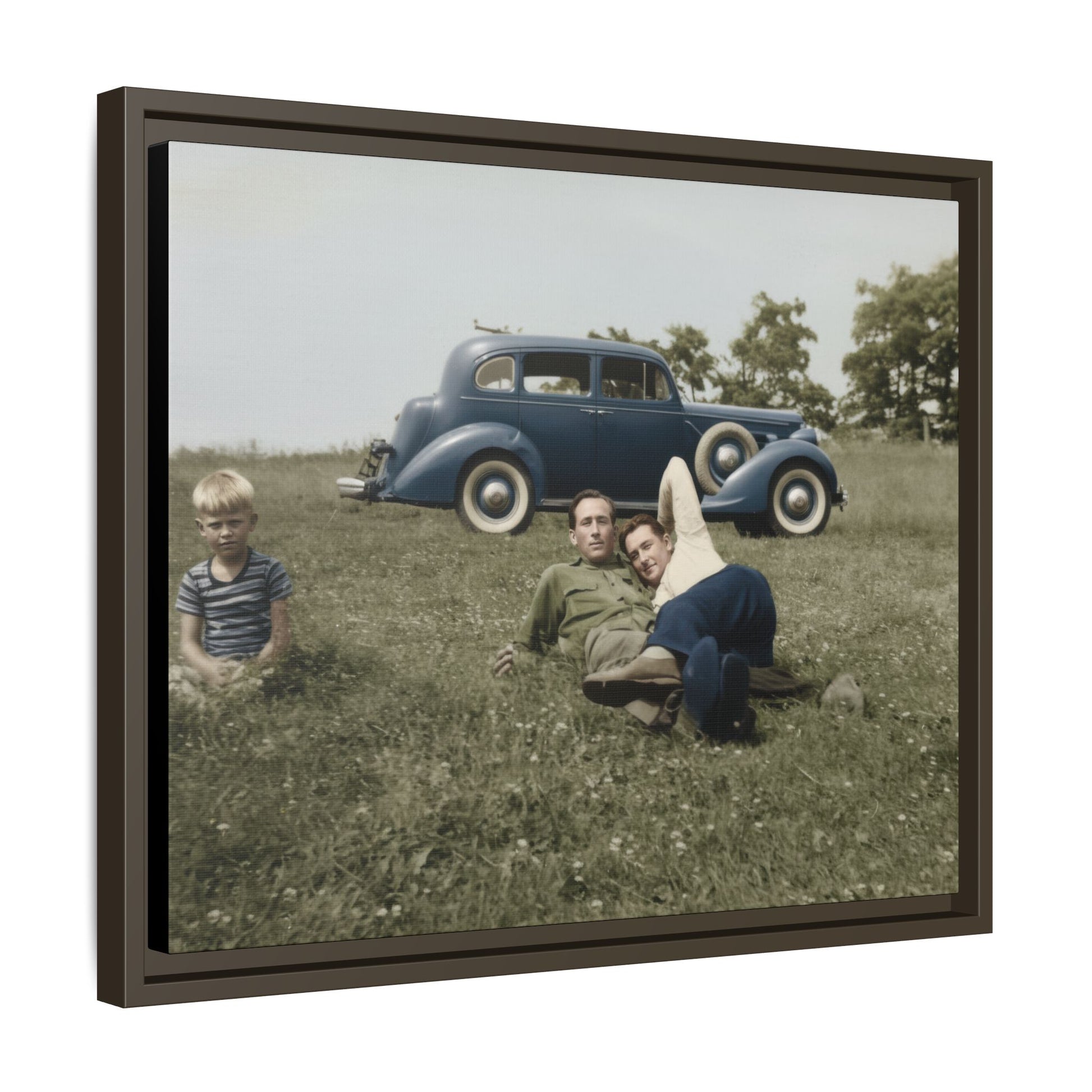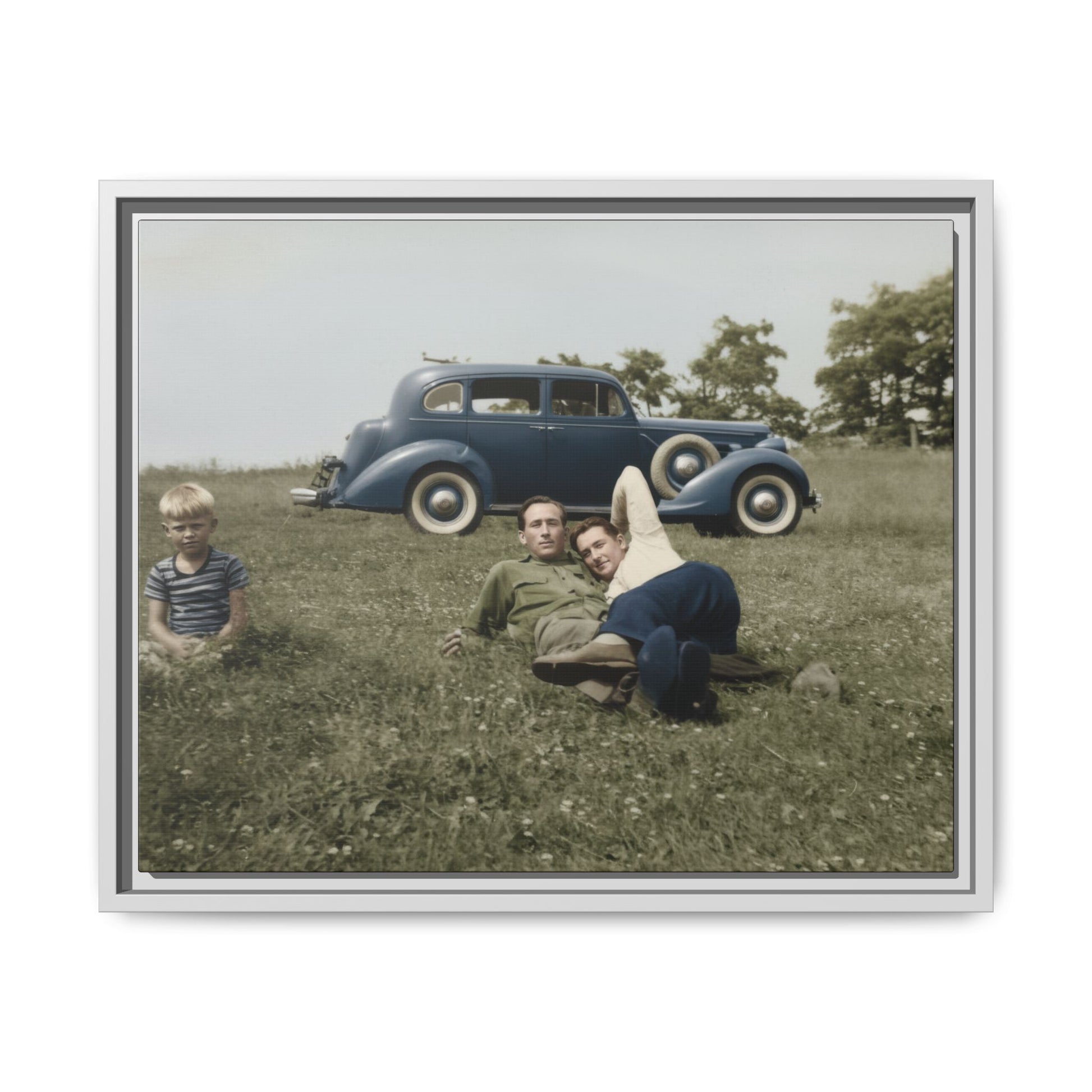 This artwork presents a vintage photograph reproduced as framed canvas wall art, drawn from an early twentieth-century outdoor snapshot. The historical image depicts two young men reclining together in a grassy field, with a child seated nearby and a period automobile positioned behind them. Carefully restored and reproduced as museum-quality décor, the photograph preserves the original image's visual character while presenting it as refined historical wall art.