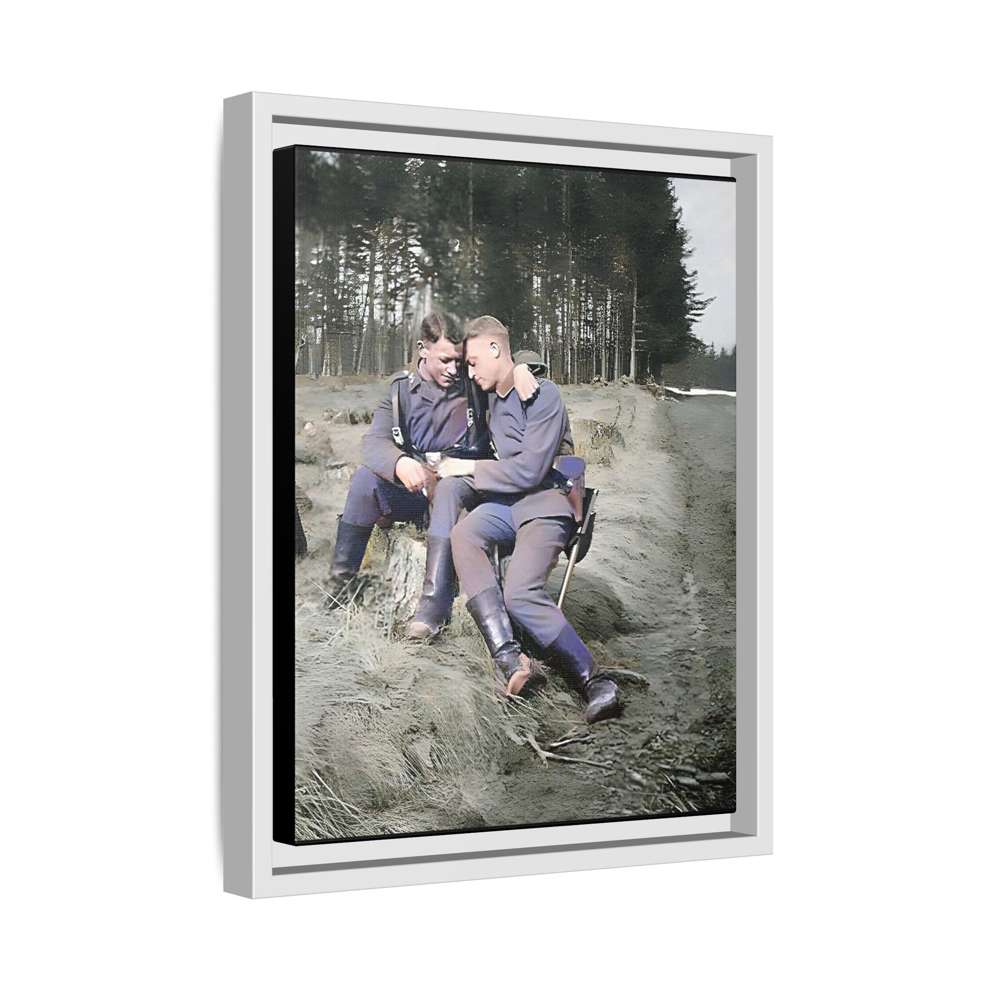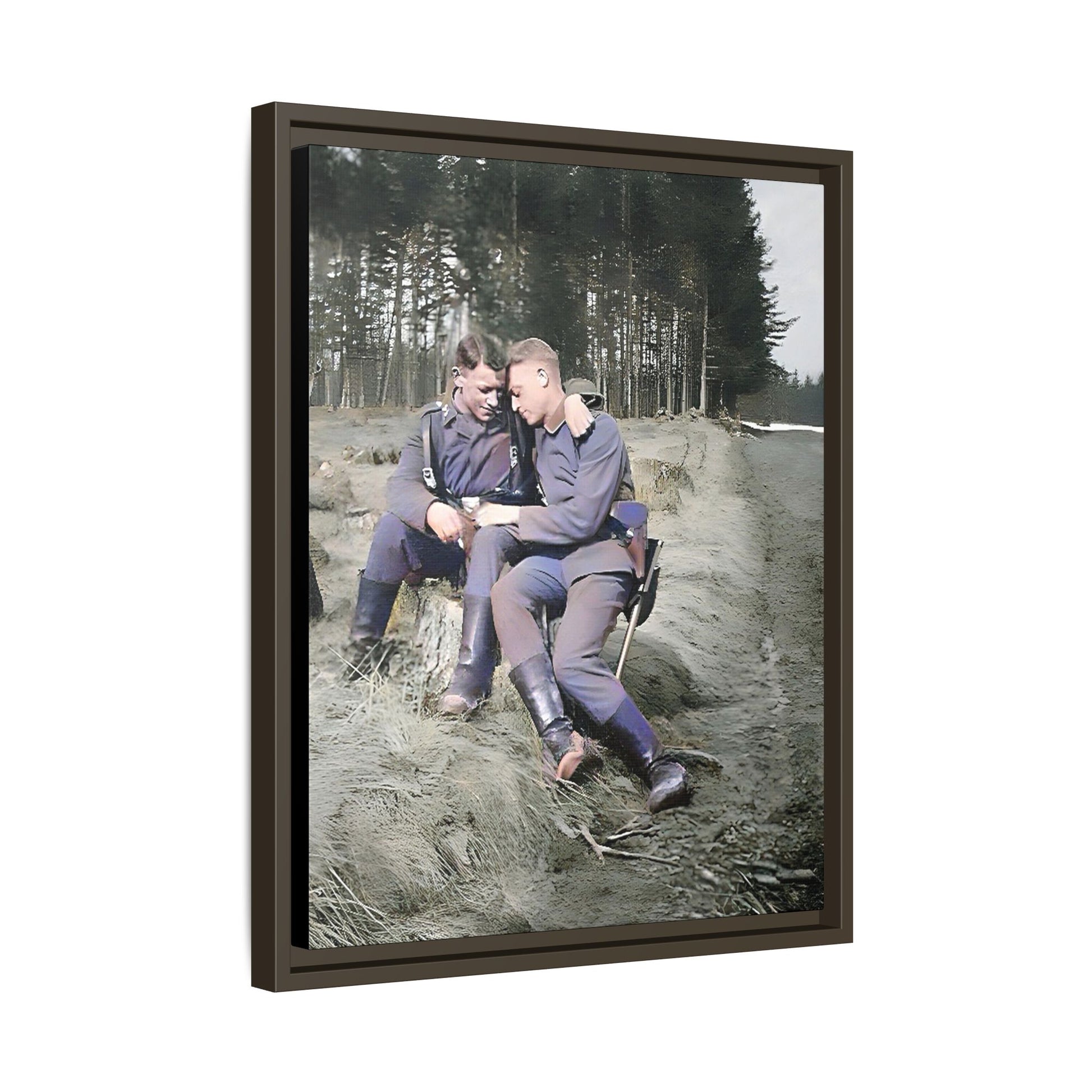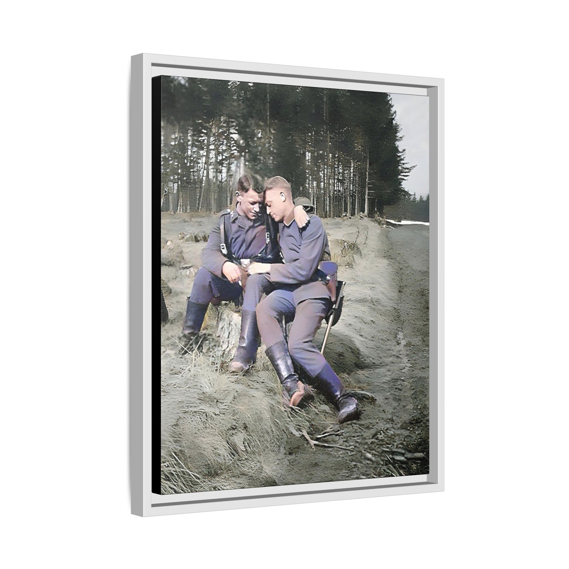 Their military uniforms and boots evoke the resilience and camaraderie of the era, while their affectionate gaze conveys a deep bond rarely documented in such times. The tranquil path and forest beyond serve as a poignant reminder of the enduring human spirit even amid the challenges of history.