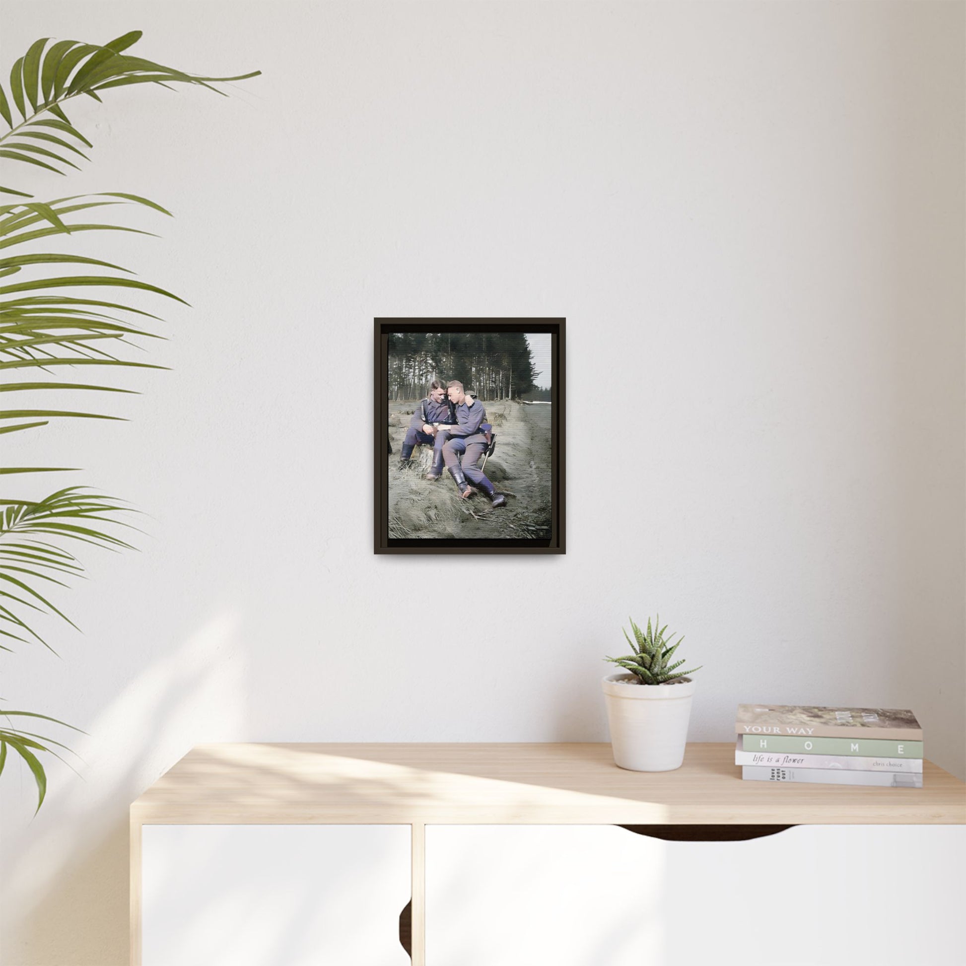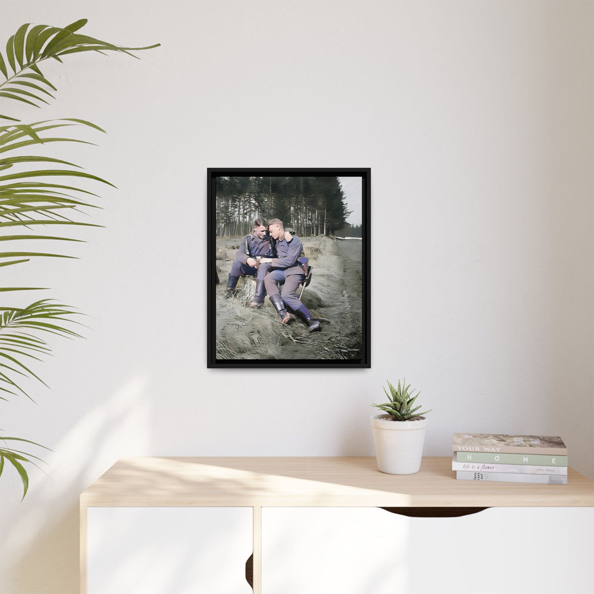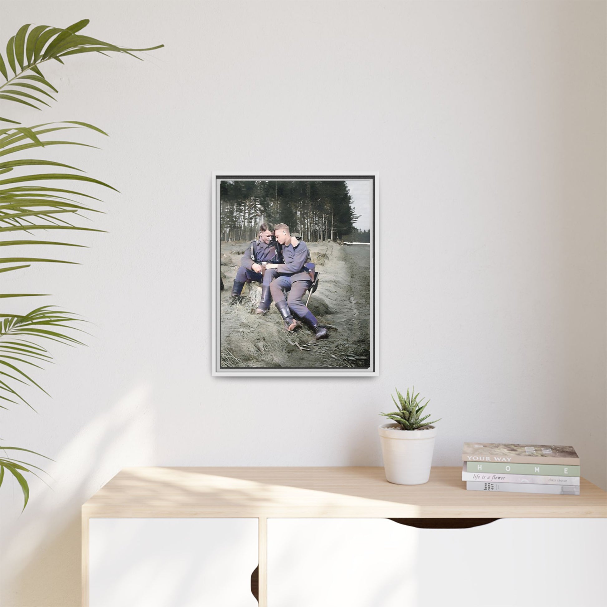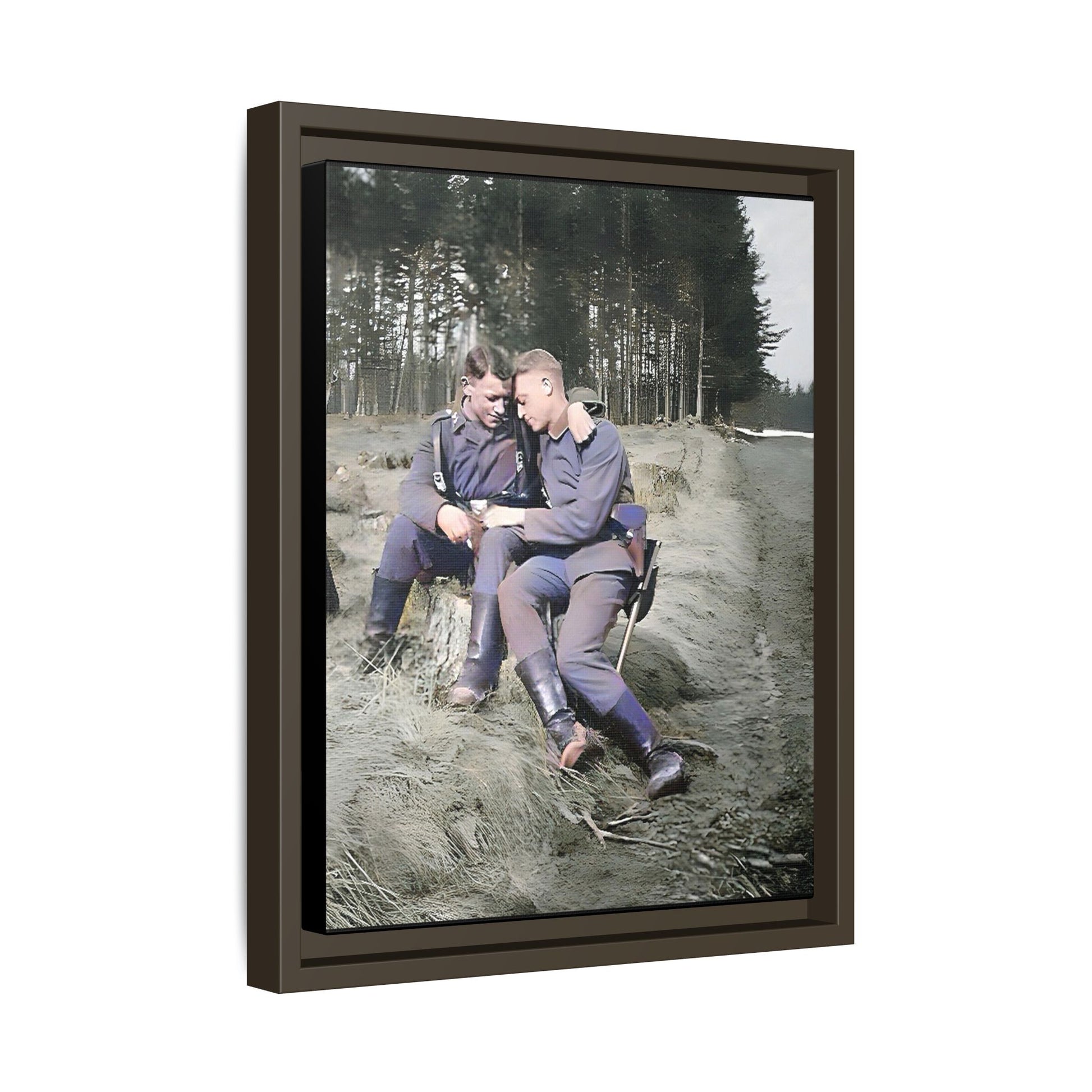 Their military uniforms and boots evoke the resilience and camaraderie of the era, while their affectionate gaze conveys a deep bond rarely documented in such times. The tranquil path and forest beyond serve as a poignant reminder of the enduring human spirit even amid the challenges of history.
