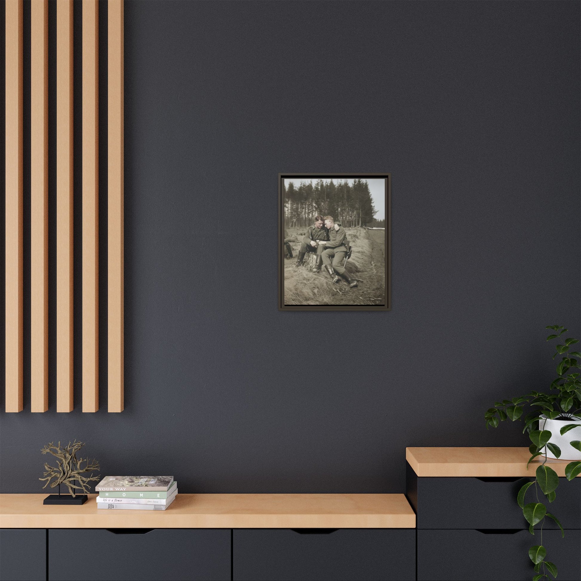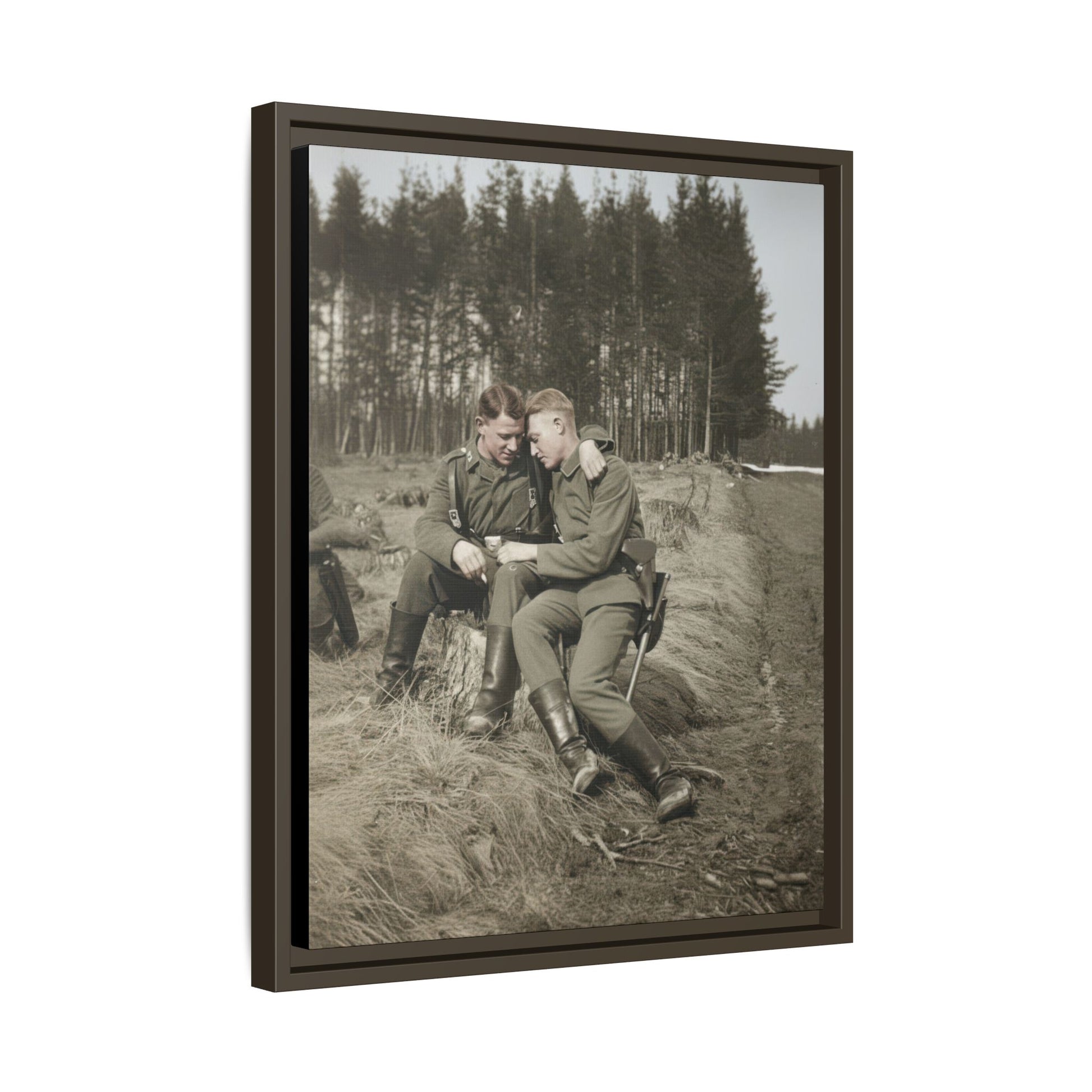 This artwork presents a vintage photograph reproduced as framed canvas wall art, drawn from an early twentieth-century outdoor image of two uniformed men seated closely together beside a roadside clearing. The historical photograph is reproduced as museum-quality wall décor, preserving the tonal character and visual quiet of the original print. With its combination of figure study, landscape setting, and period dress, the image offers a thoughtful example of historical portrait photography adapted for contemporary display.