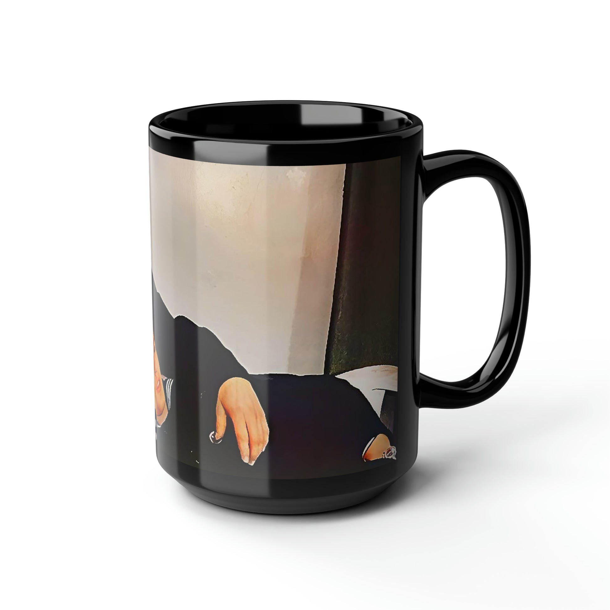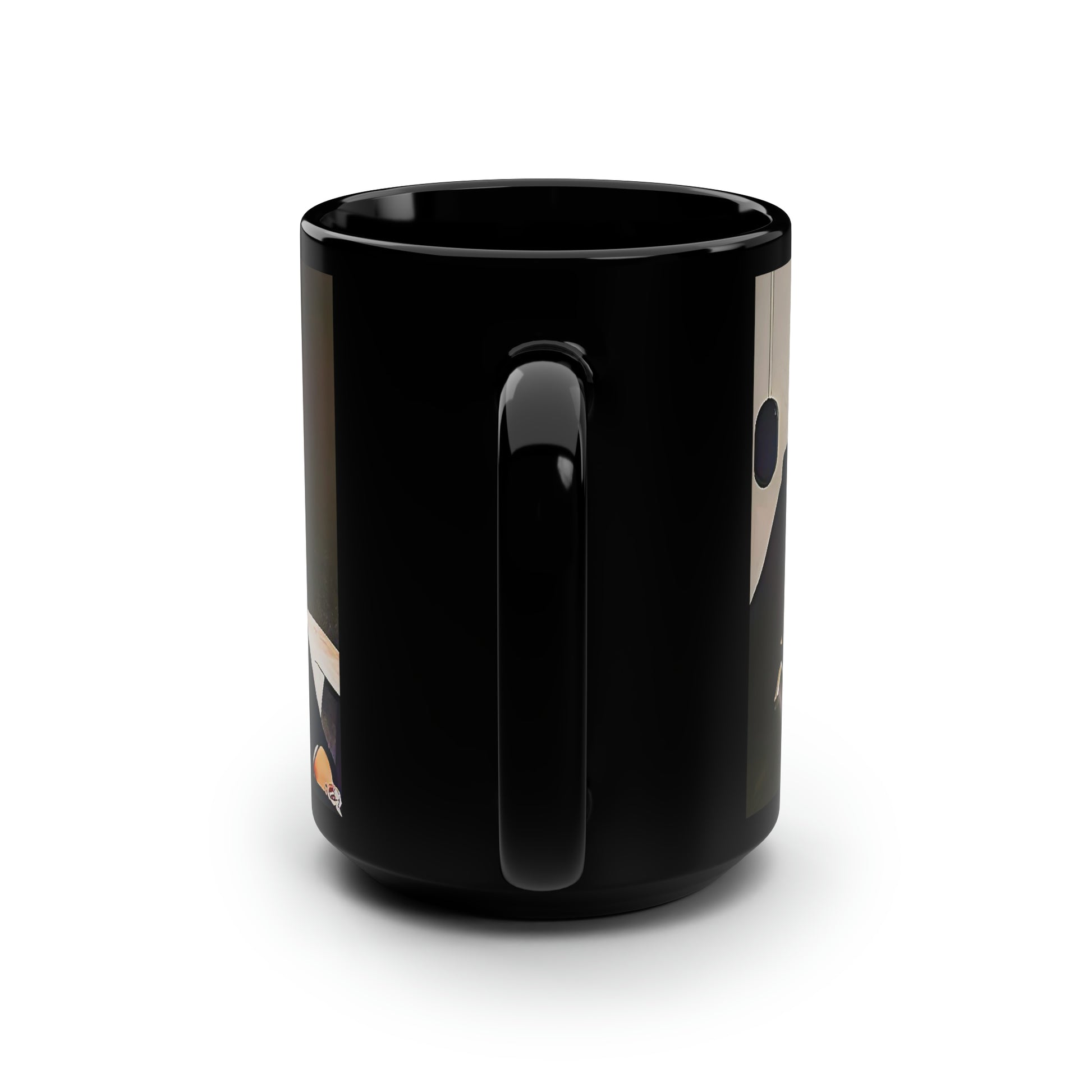 These black mugs come in one size – 15oz (0.44l) – plenty for morning caffeine boosts and hot cups of tea on a rainy day. They're easy to grip and feel sturdy thanks to the C-shaped handle. They are printed on black ceramic material in picture-perfect quality with a glossy finish.