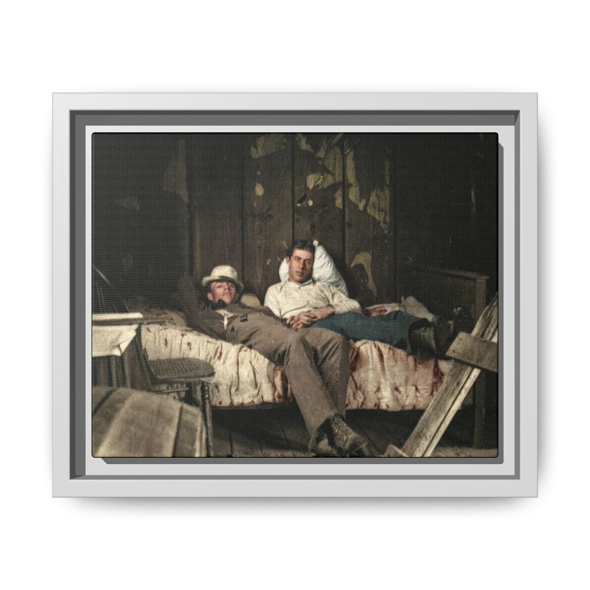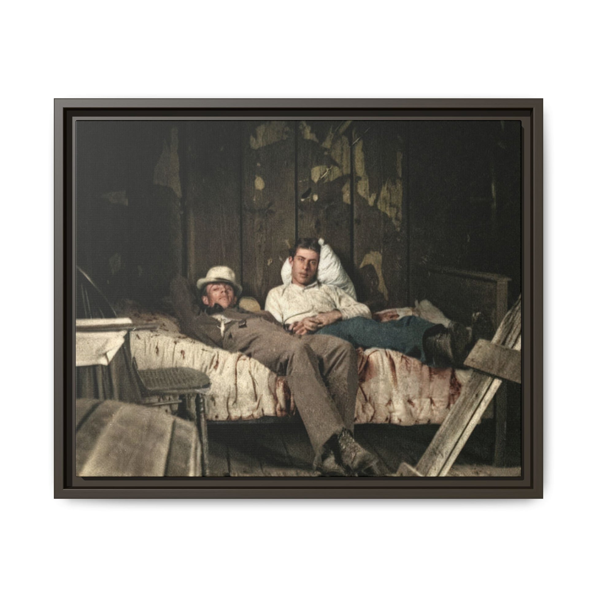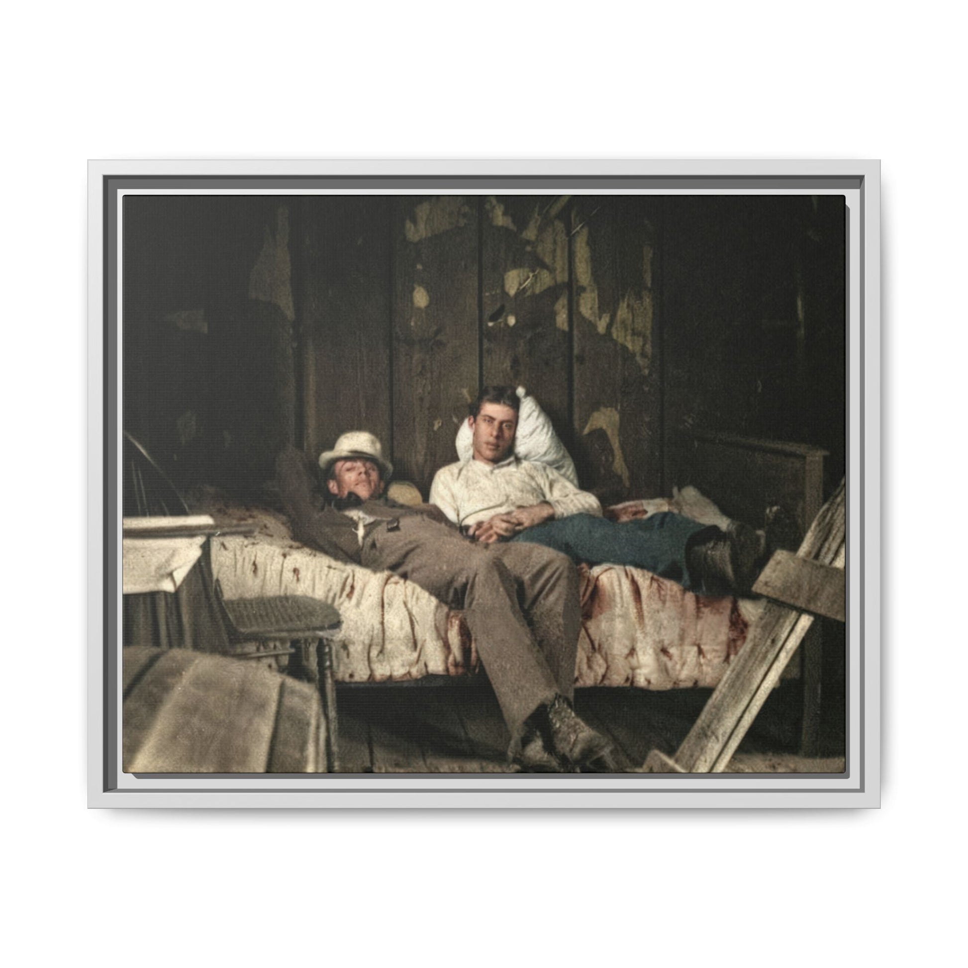 Title: Two Men Reclining on a Bed in a Rustic Interior
