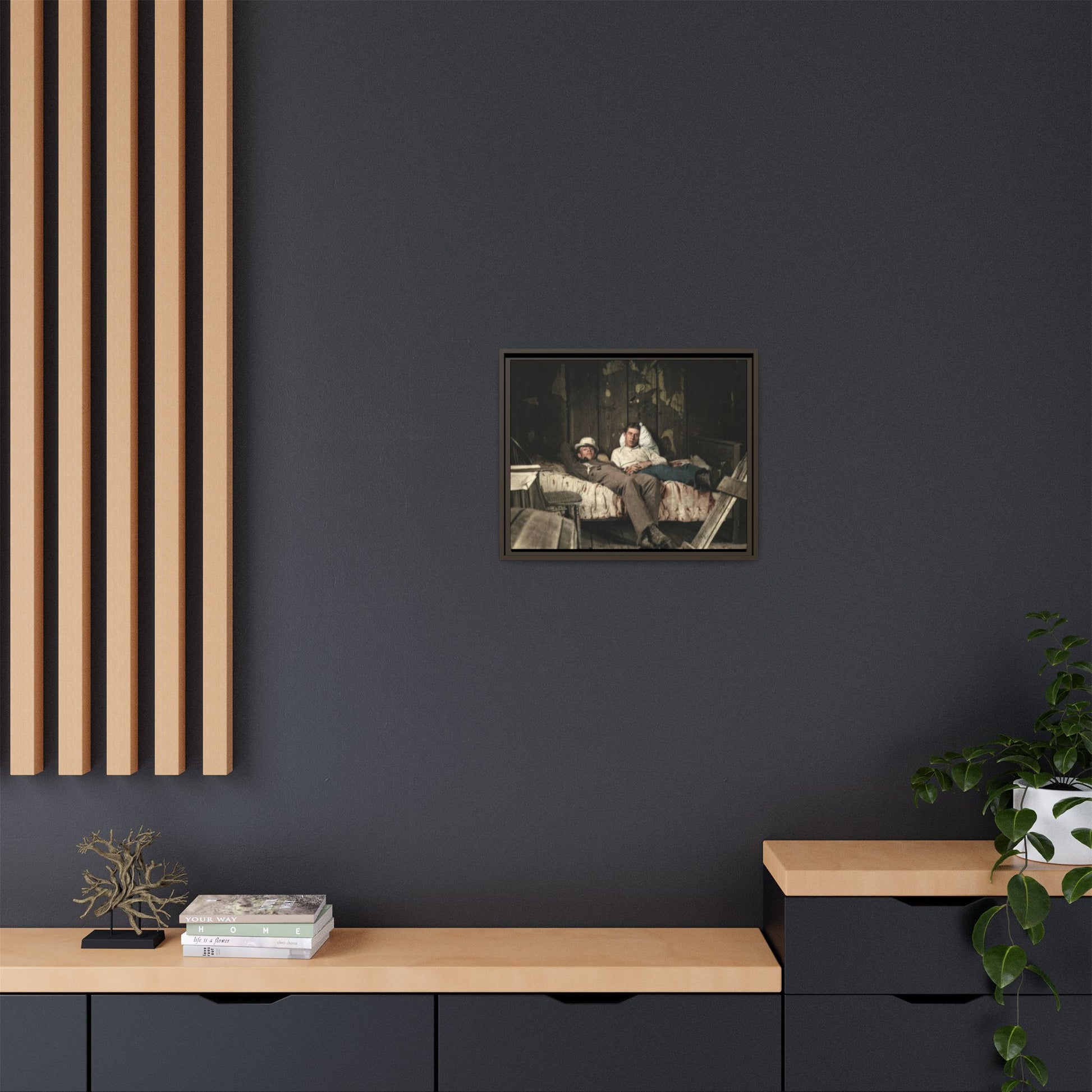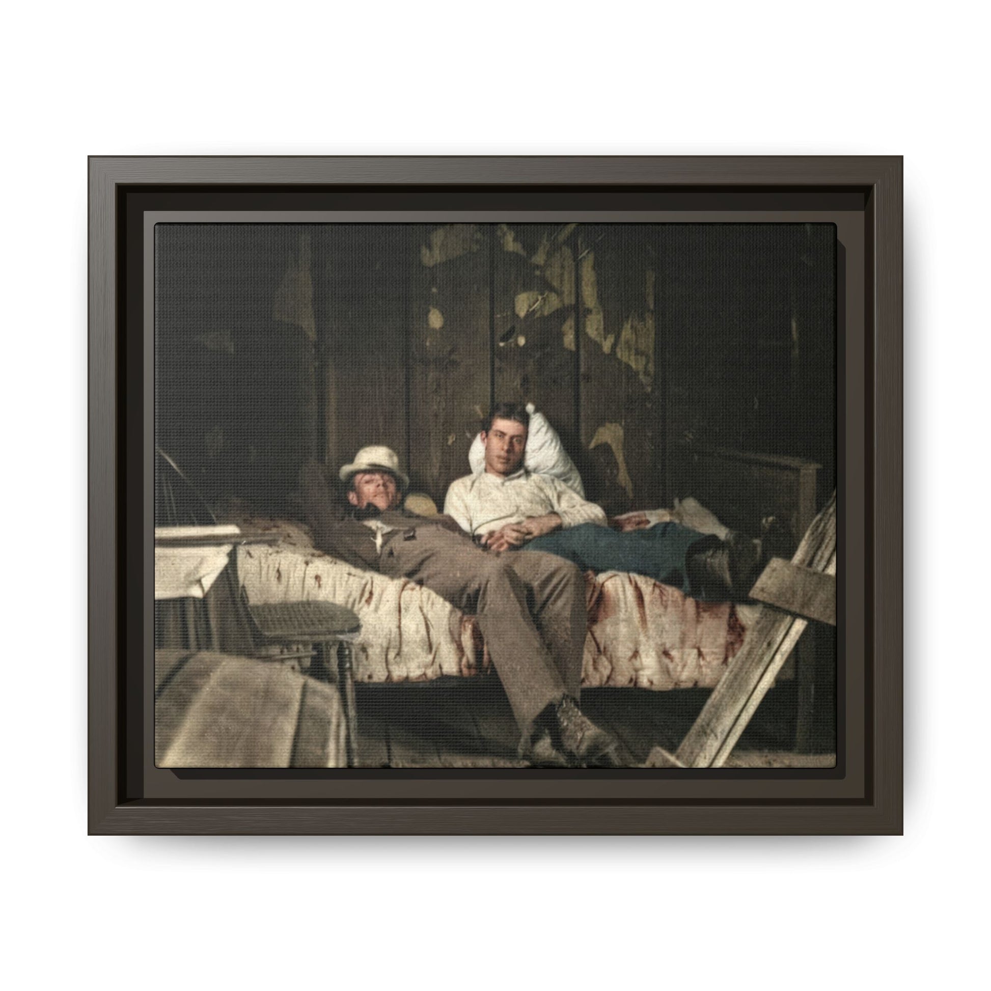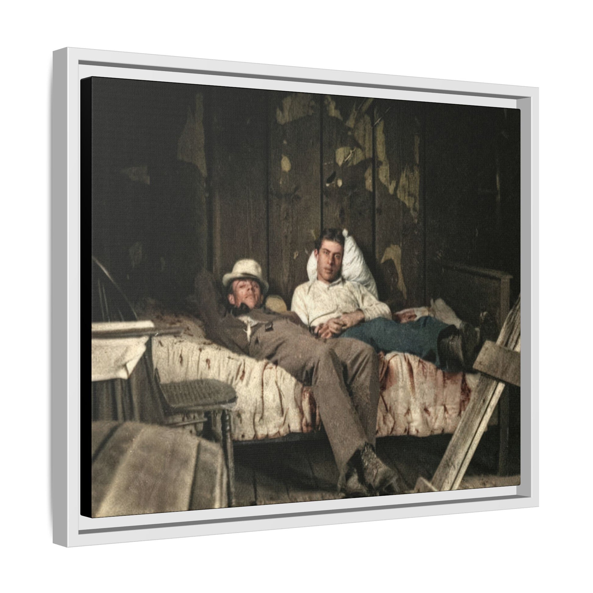 Title: Two Men Reclining on a Bed in a Rustic Interior