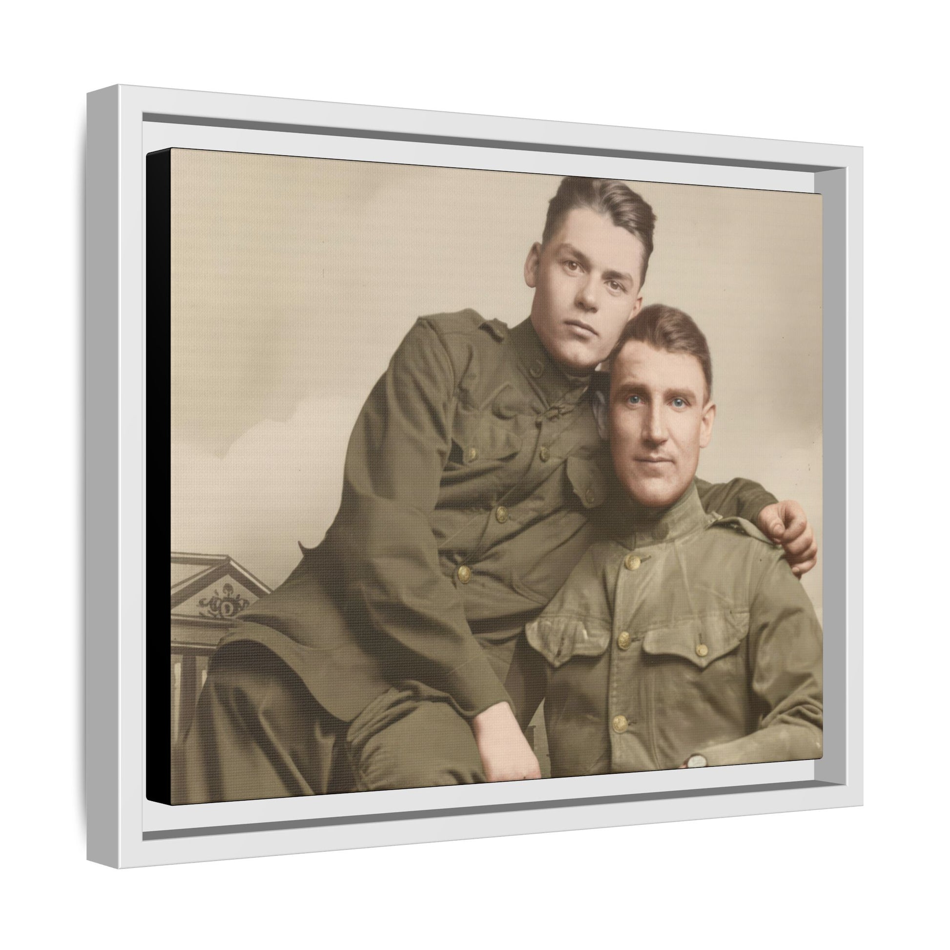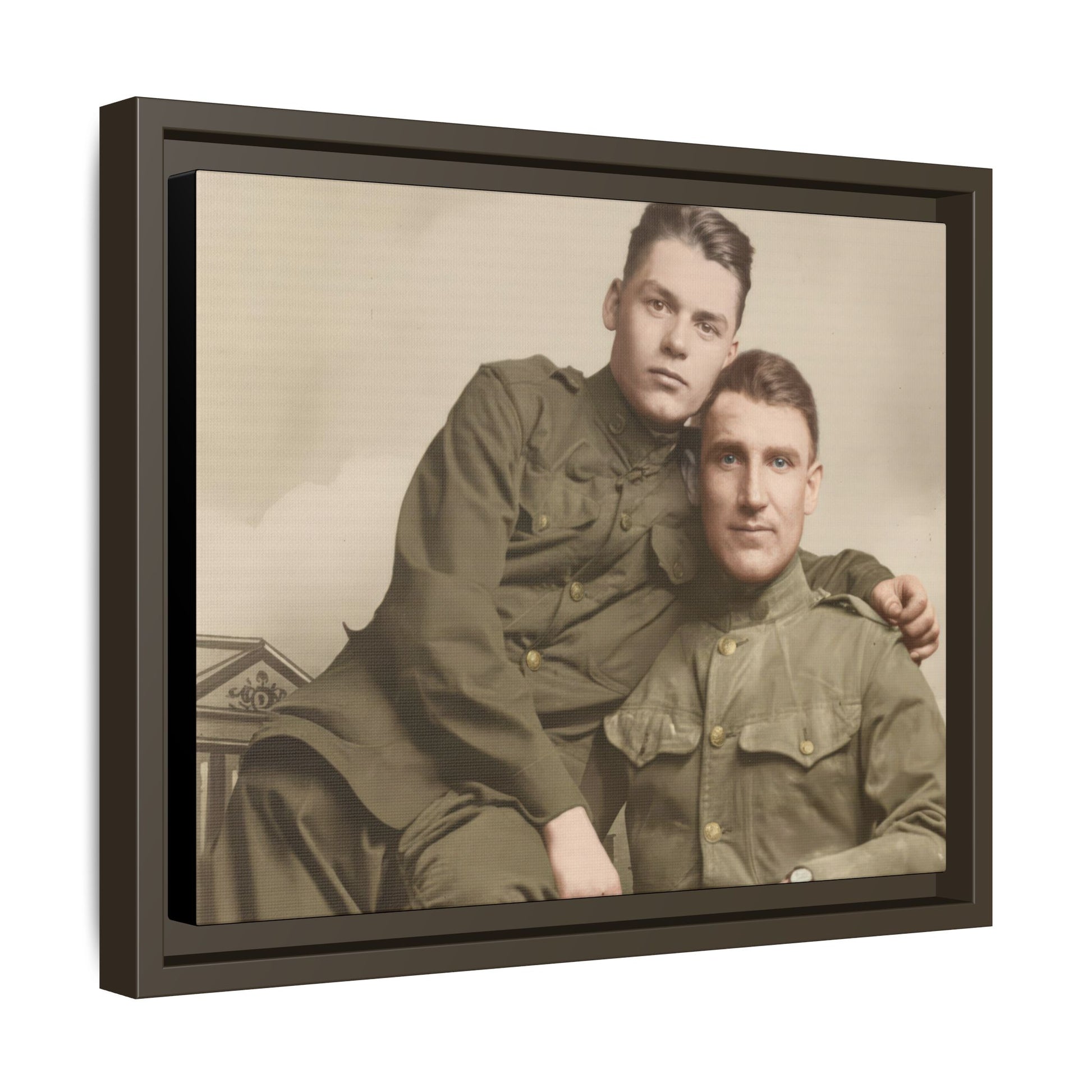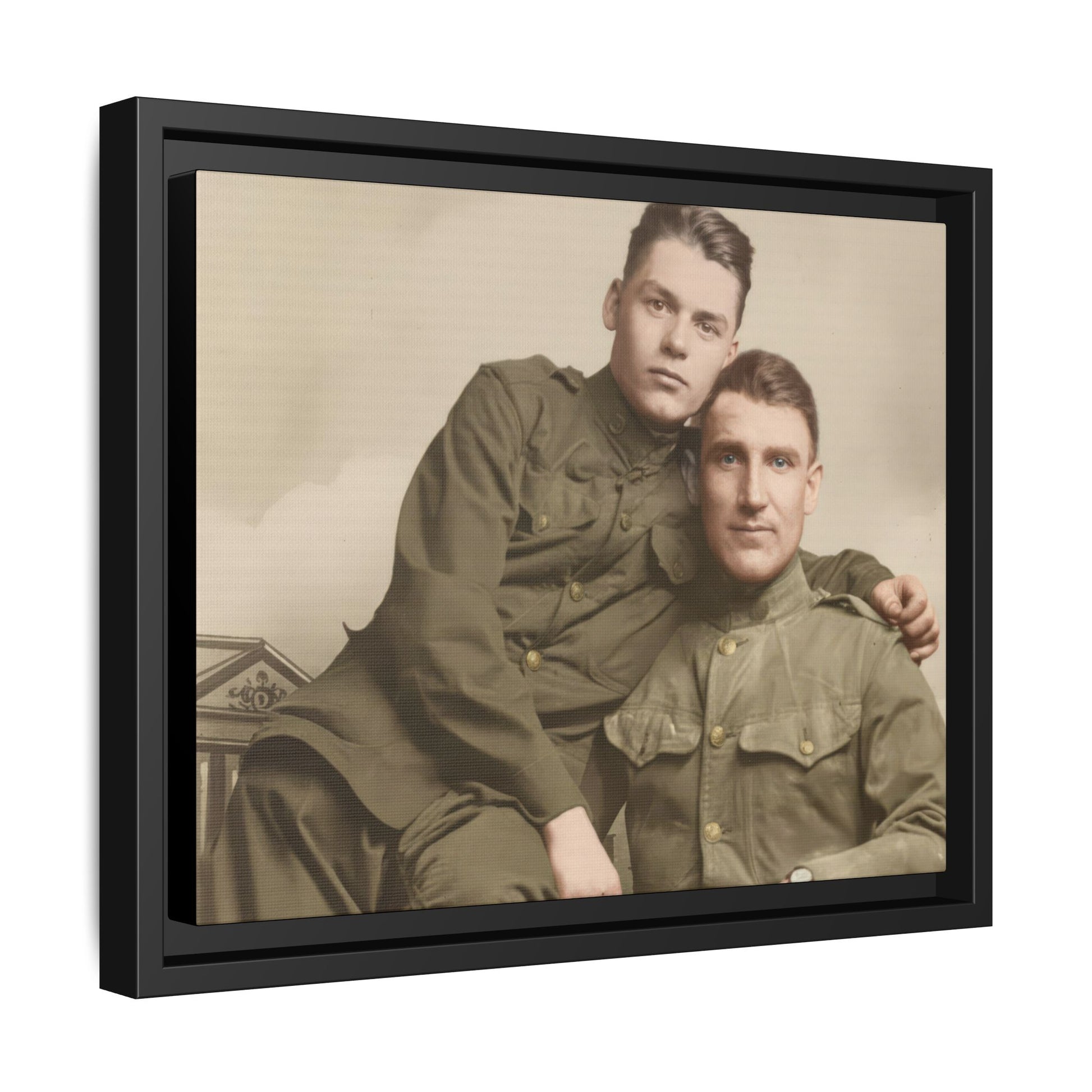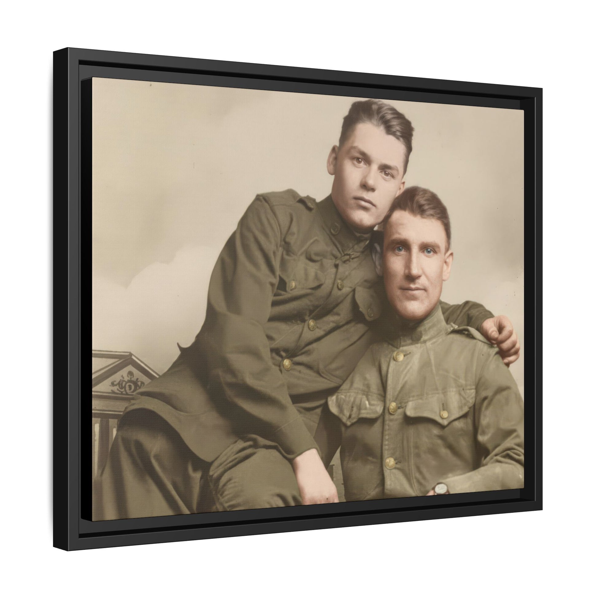 A probable gelatin silver studio portrait from about 1915–1925 showing two uniformed men seated together. Minor surface wear and gentle tonal aging are present, making the object a clear example of early twentieth-century professional portrait production.