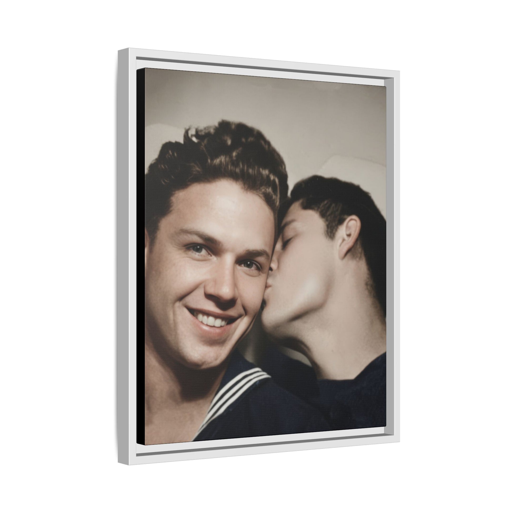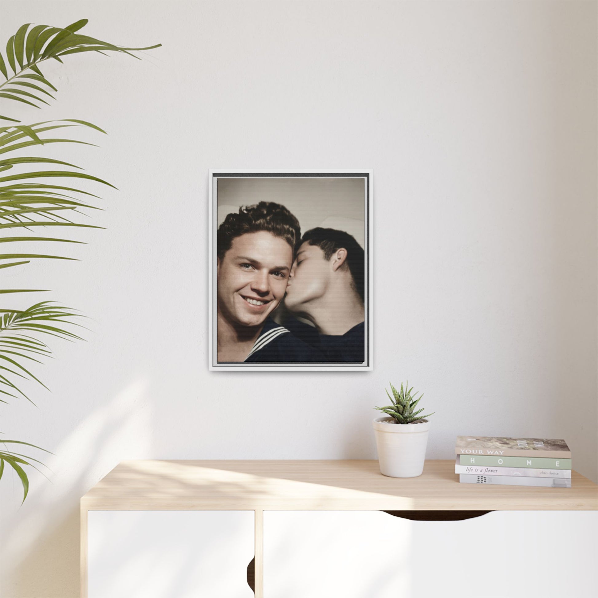 This vintage photograph is reproduced as framed canvas wall art, presenting a mid-twentieth-century historical portrait of two sailors captured in a close photobooth-style composition. Carefully prepared as a high-quality reproduction, the image preserves the immediacy of the original photograph while bringing its archival presence into a contemporary display setting.