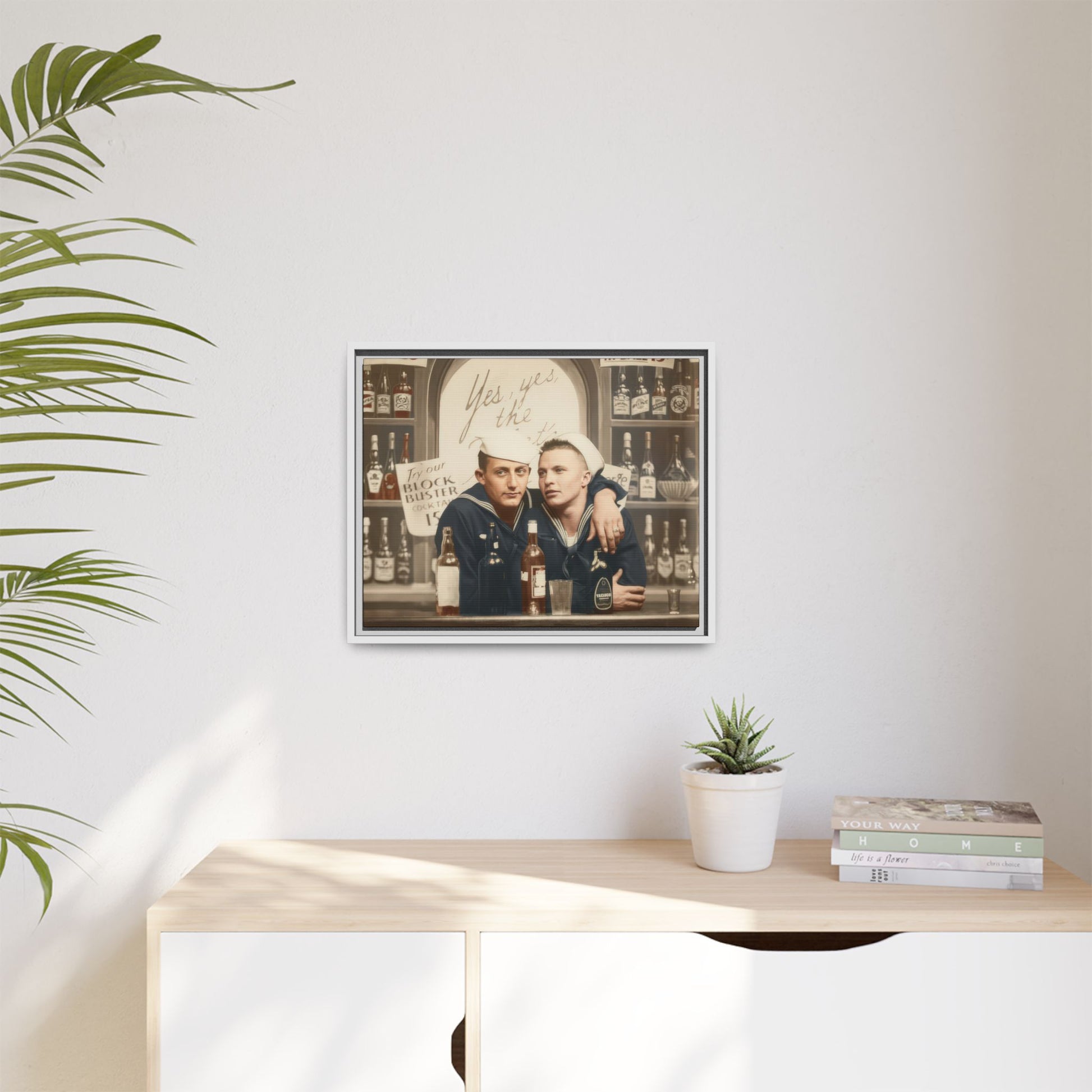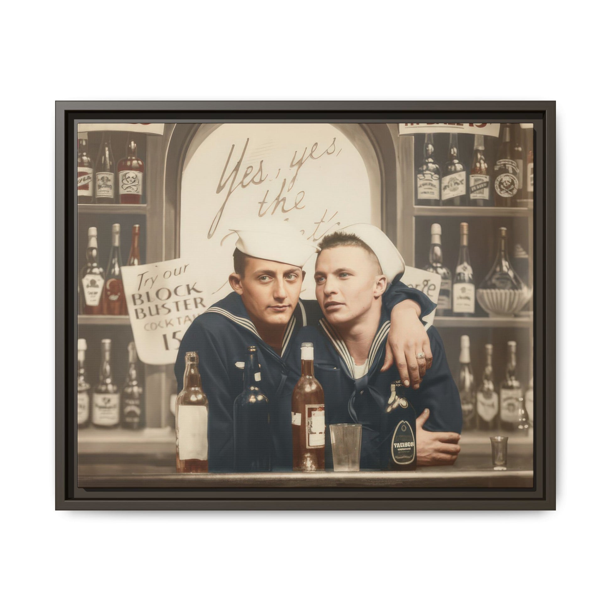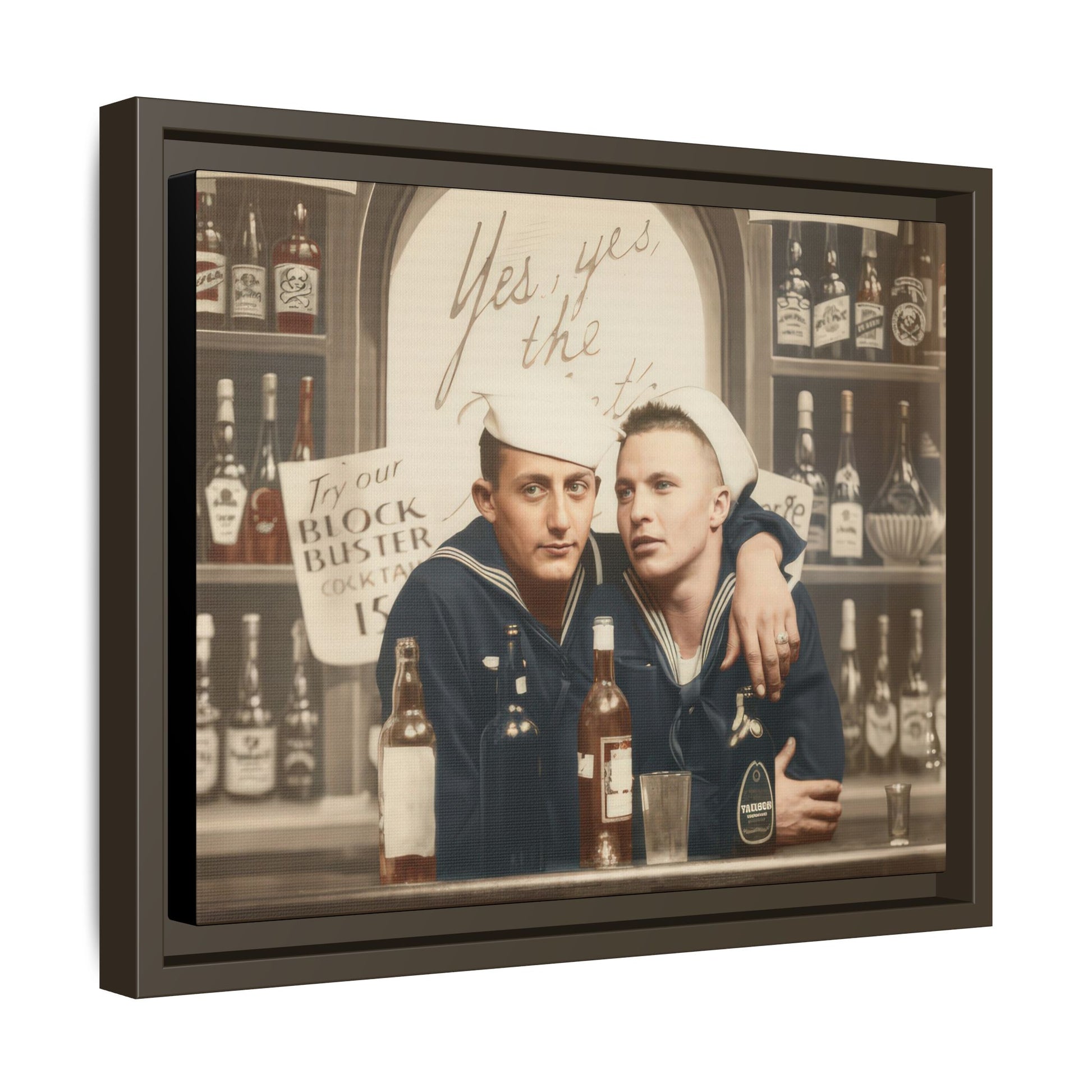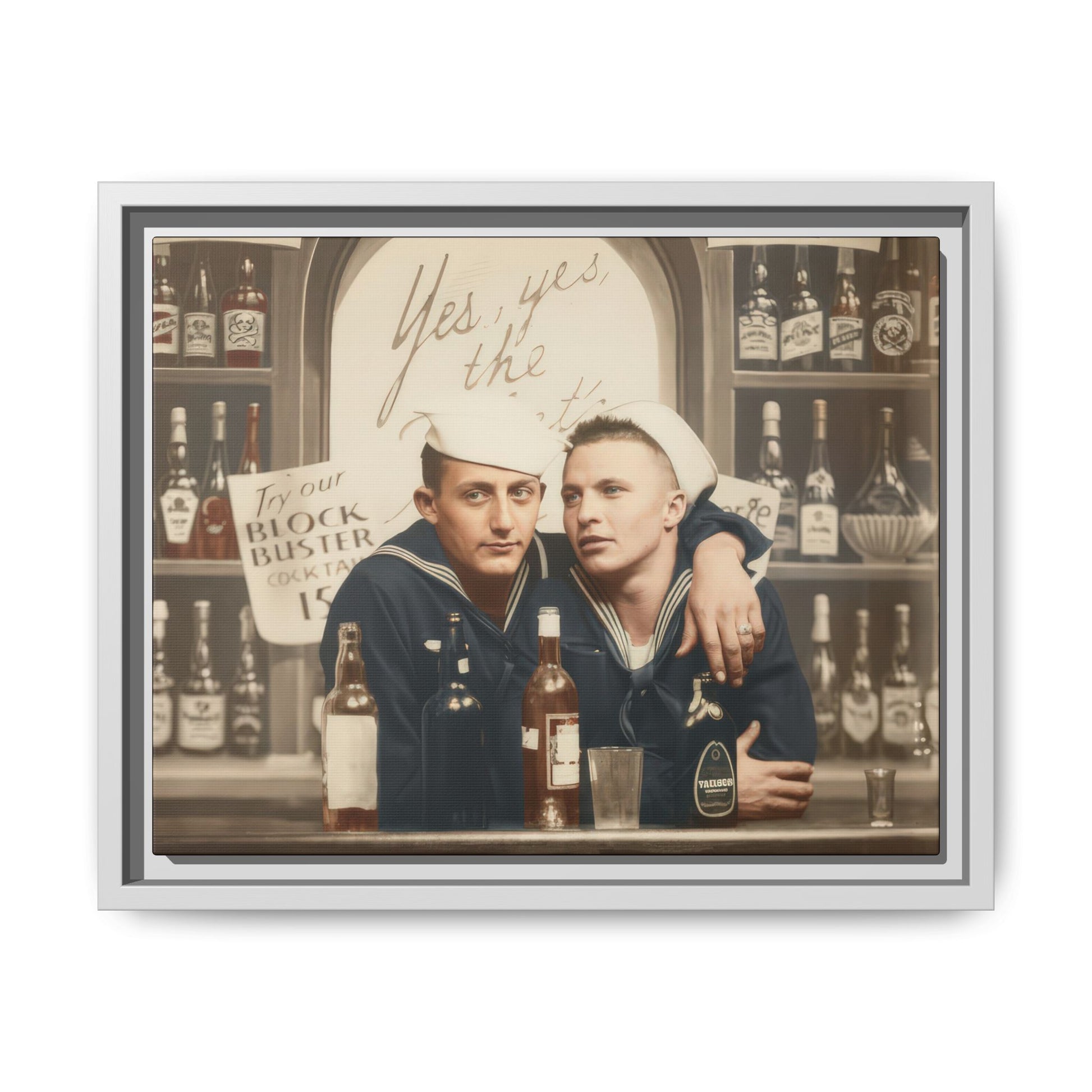 Title: Two Sailors Seated at Bar Counter with Bottles and Signage
