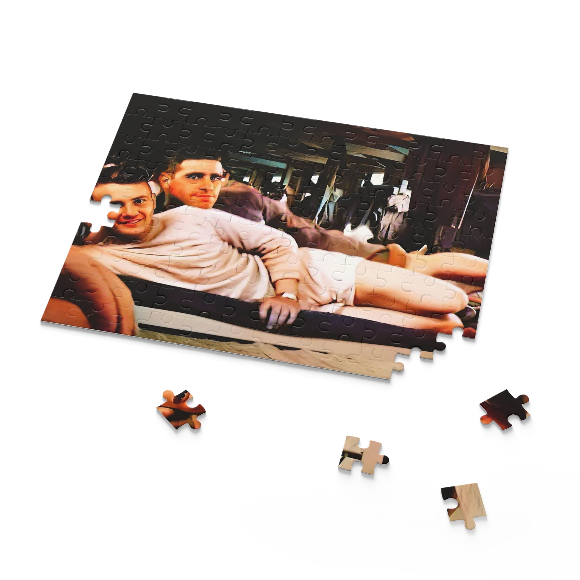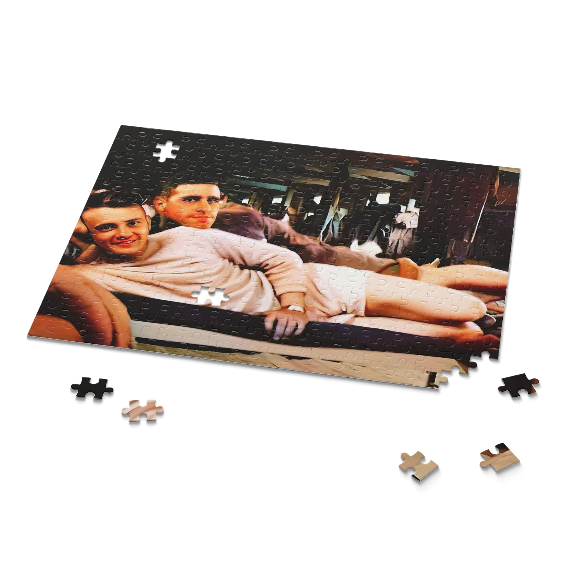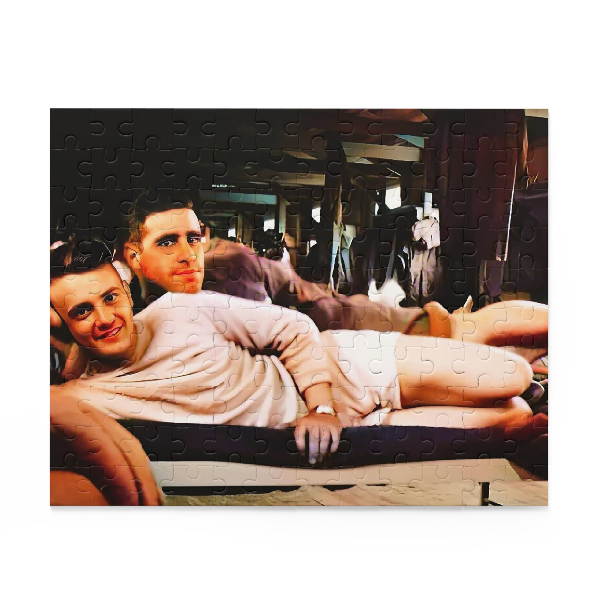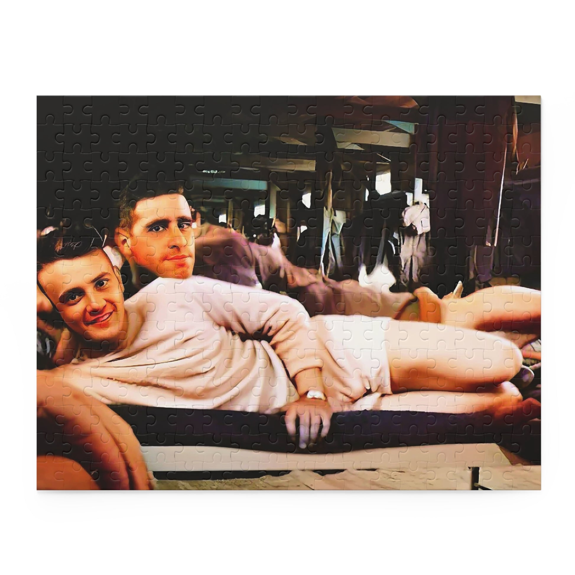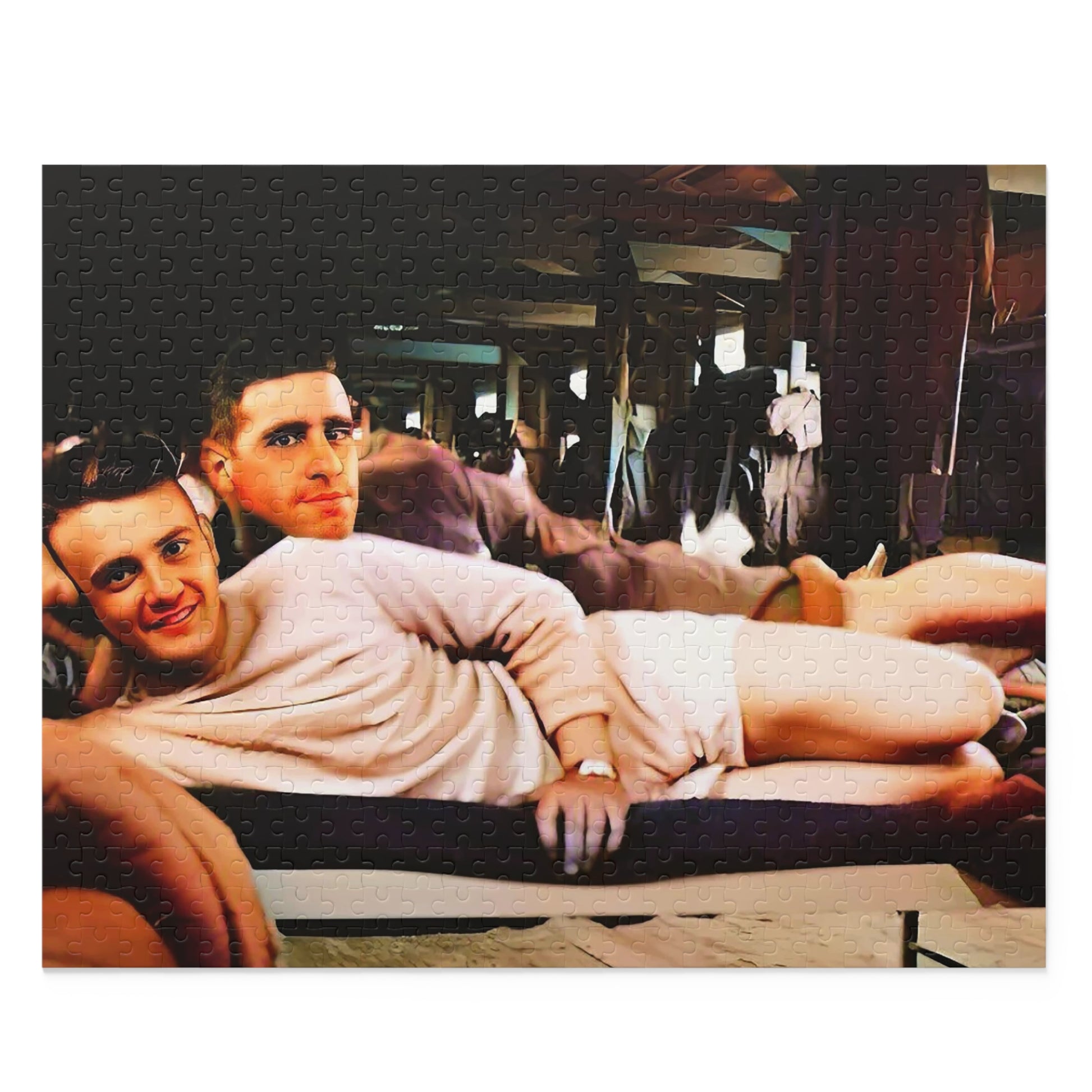 Capture a heartwarming moment from the 1930s with this charming jigsaw puzzle featuring a vintage photo of two young soldiers, Jules and Seymour, sharing a quiet, affectionate moment on a cot in their barracks. Both soldiers grin at the camera, and one soldier rests his chin affectionately on the other's shoulder. This puzzle is perfect for those who appreciate the bonds of friendship and the nostalgia of military life.