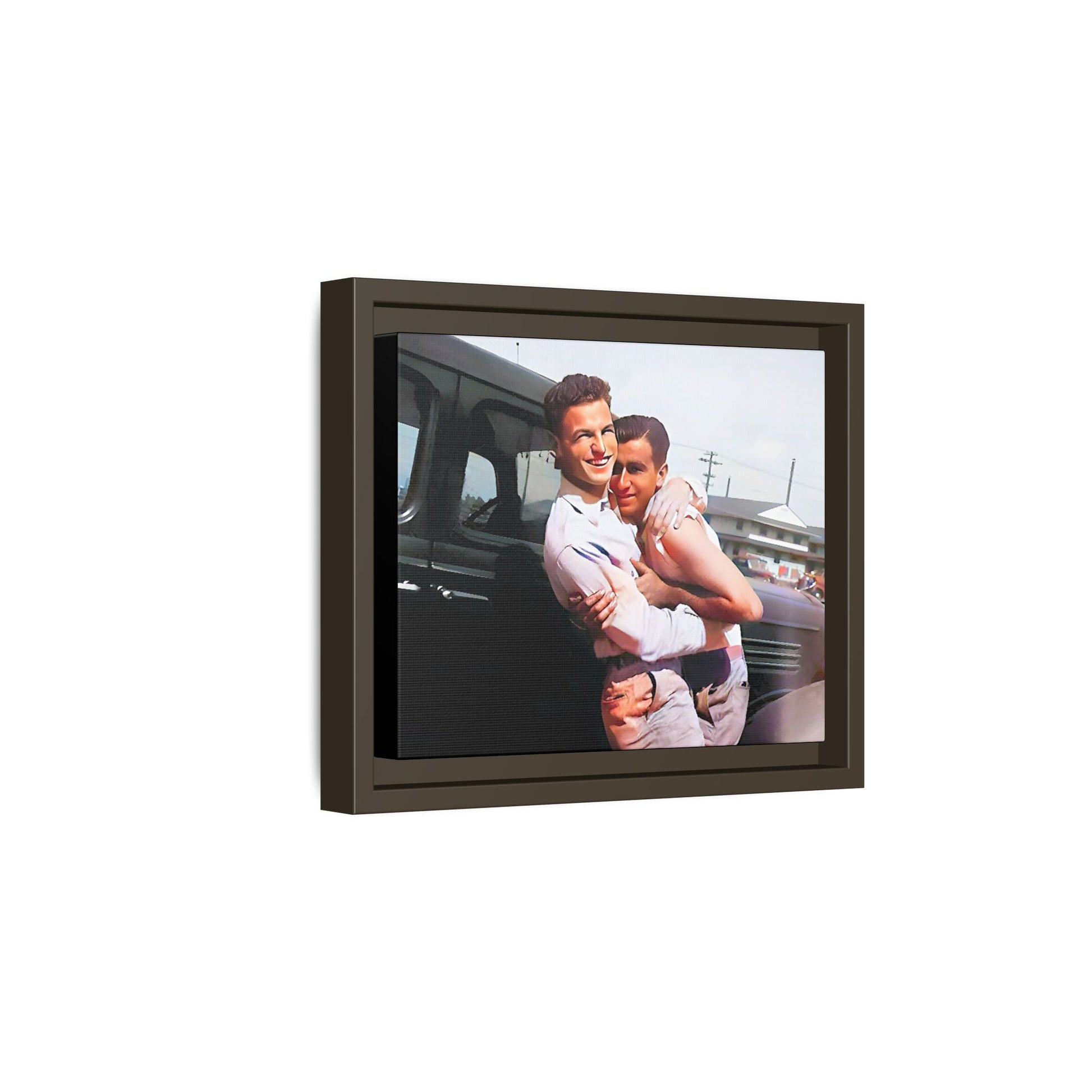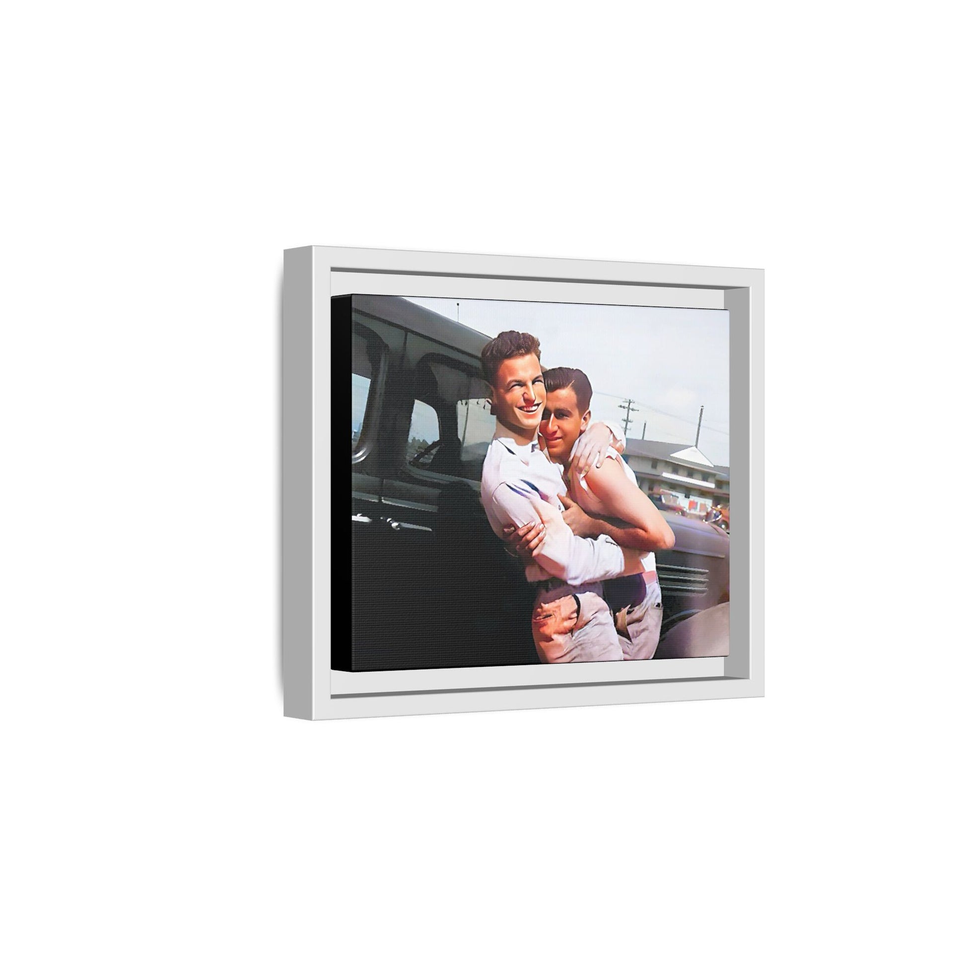Celebrate love, warmth, and timeless connection with this tender photograph of Henry and Raymond, embracing in a moment of pure joy and affection. Set against a backdrop of mid-century Peoria, Illinois, this image captures the genuine emotion and quiet strength of a bond that defies time. With their radiant smiles and heartfelt closeness, Henry and Raymond embody a story of love that resonates across generations.