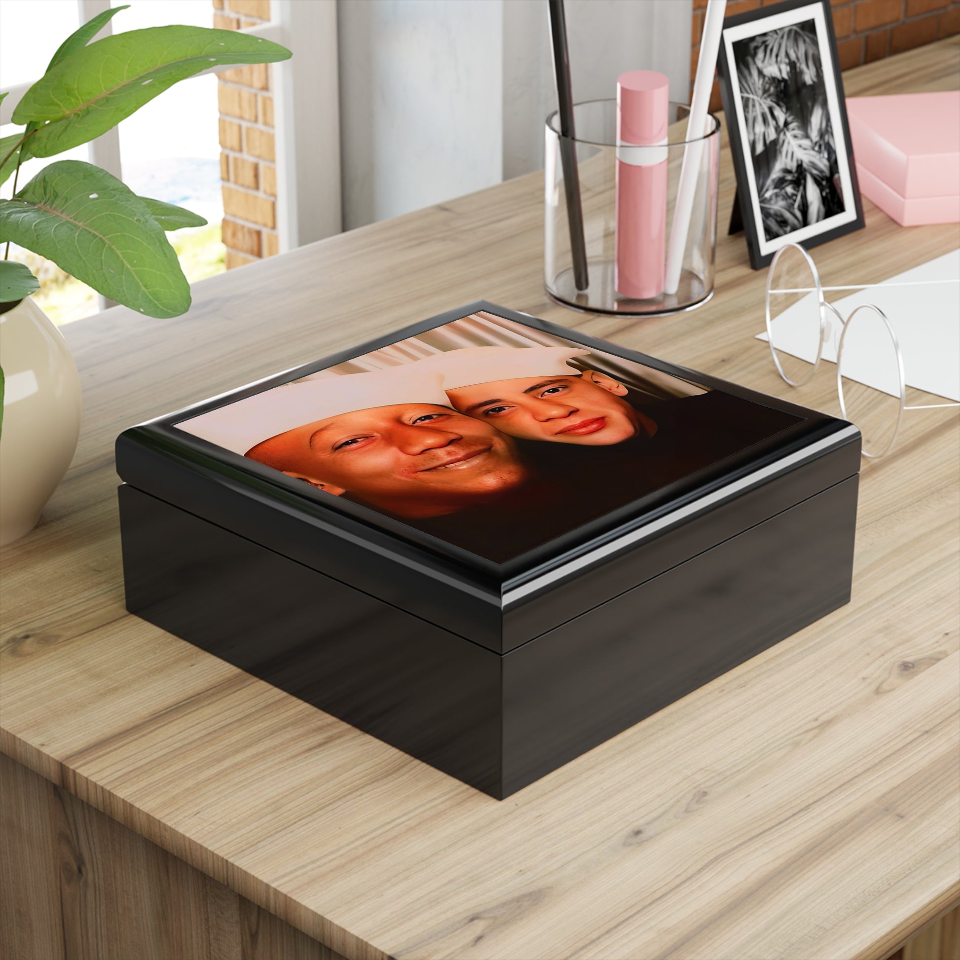 A place to keep that guitar pick you found on the bar floor from your favorite concert or a ticket receipt from your first movie with him. Keep all your mementos safe in custom style with this personalized keepsake box. This keepsake box features dual hinges that lock at 90 degrees, an elegant glossy finish, and a soft interior lined with felt material.