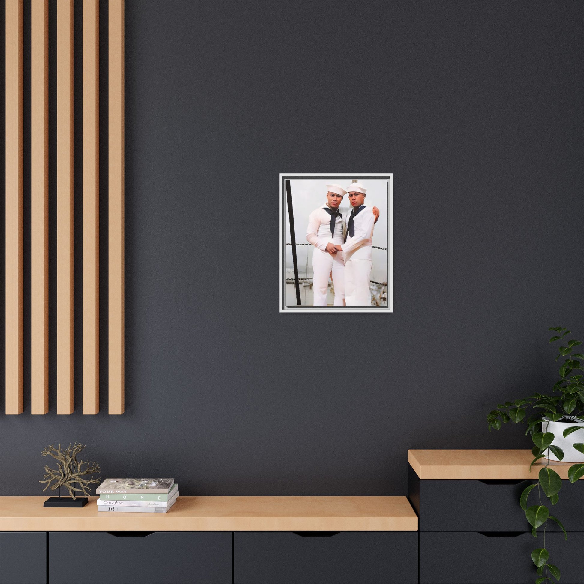 Celebrate the tender connection of love and camaraderie with paire 089 Agustín & Bruno: . This evocative photograph captures two sailors in immaculate white uniforms, standing proudly together aboard a naval ship docked at Apra Harbor, Guam. Their hands gently clasped, their expressions radiate strength and quiet devotion, encapsulating a poignant moment in time.