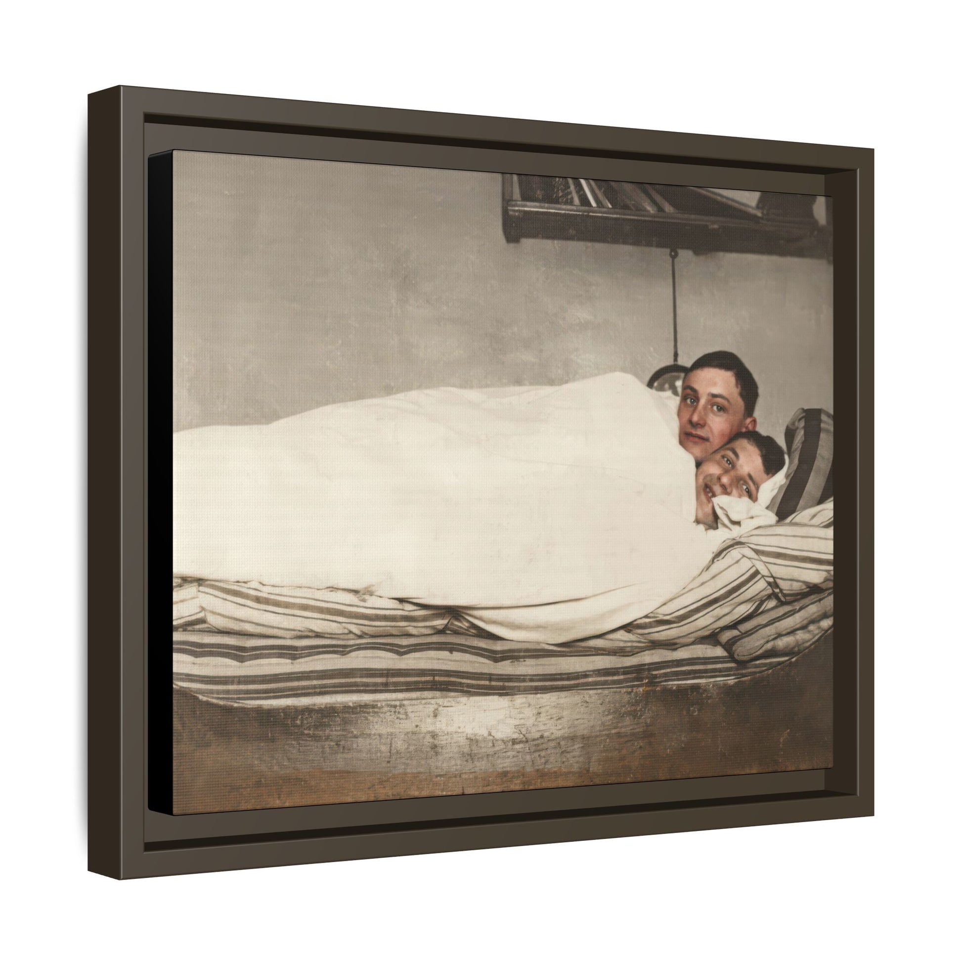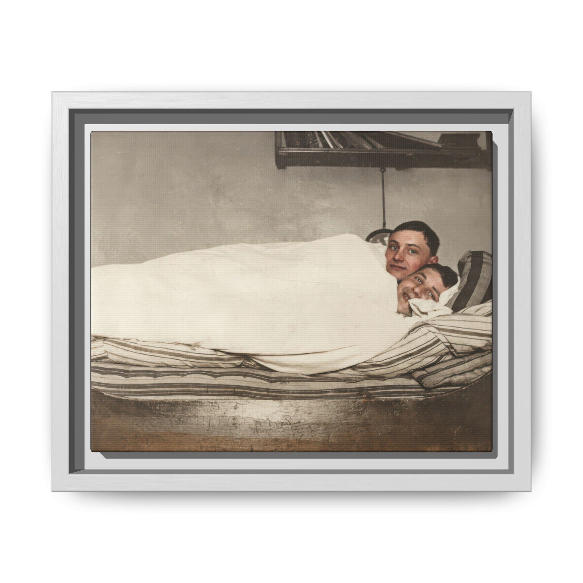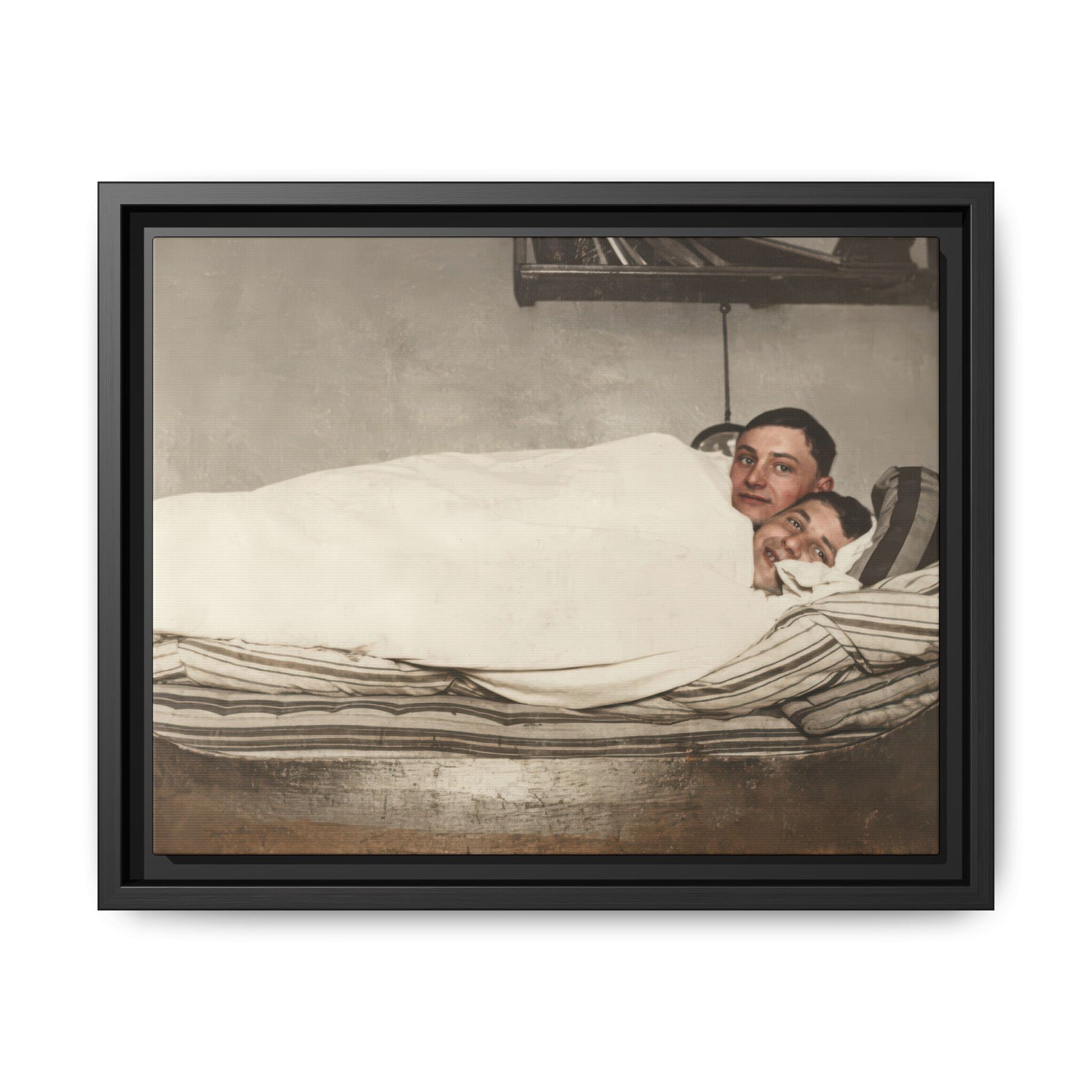 Title: Two Men Reclining in Bed within Domestic Interior