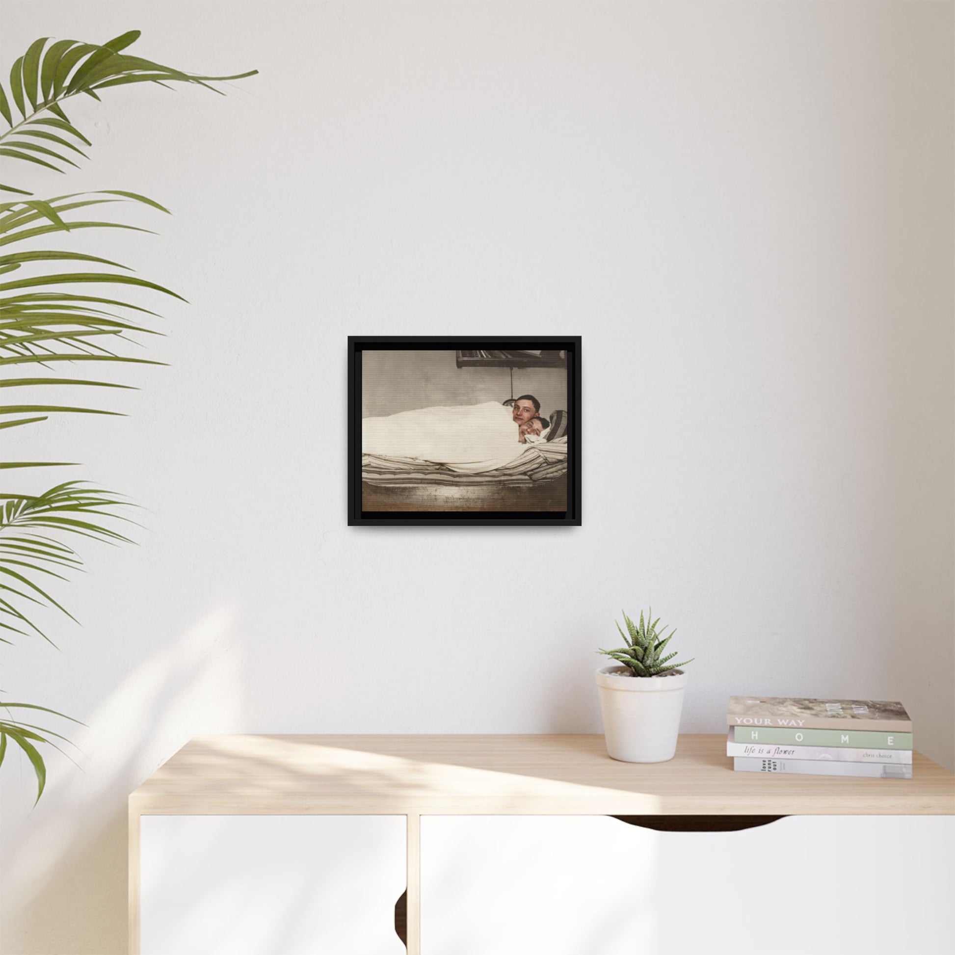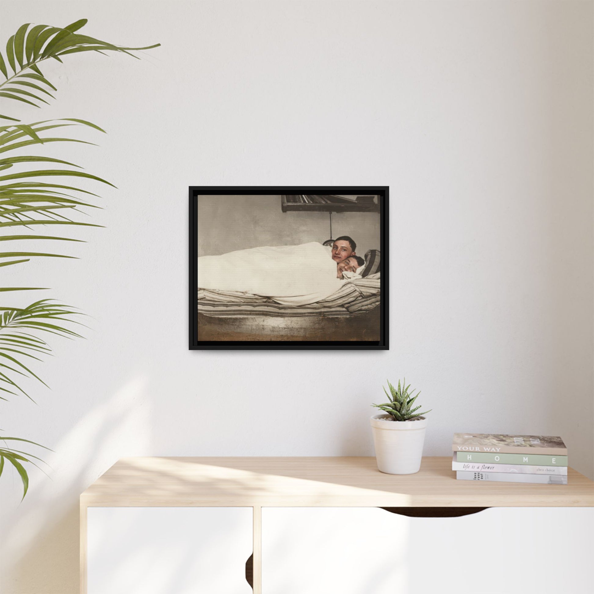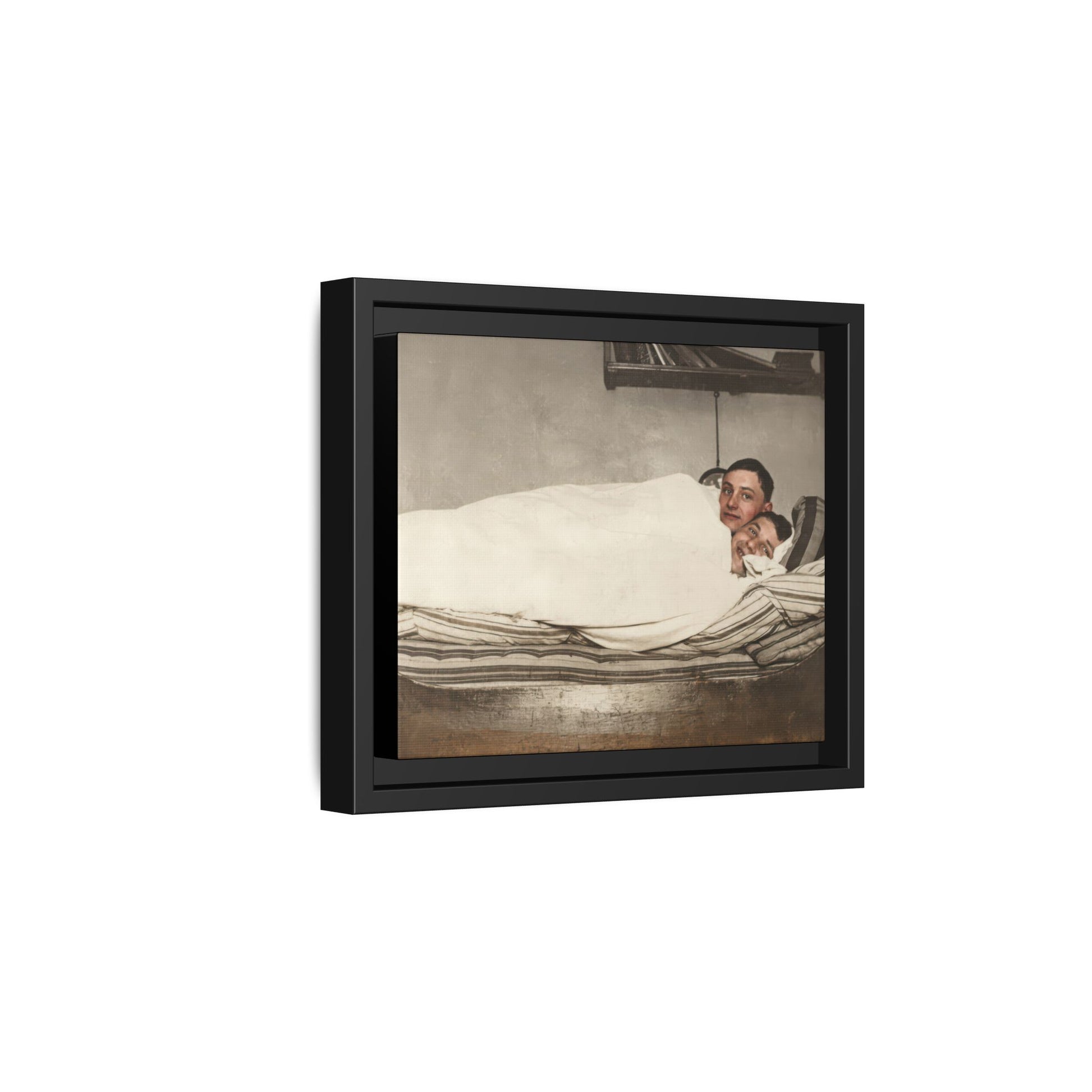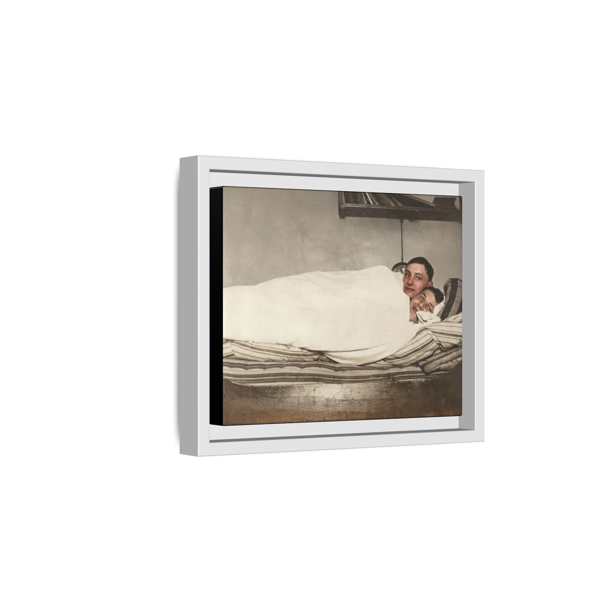 Title: Two Men Reclining in Bed within Domestic Interior