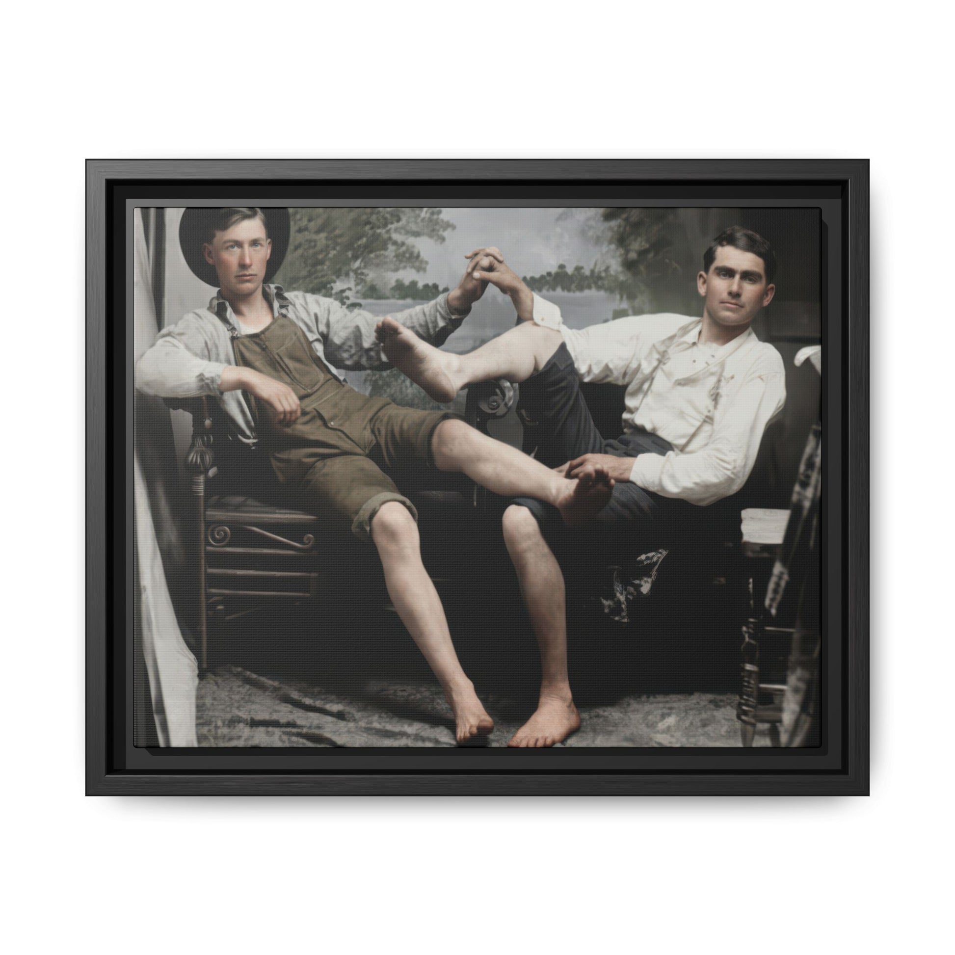 Title: Two Men Seated on Upholstered Bench with Painted Landscape Backdrop