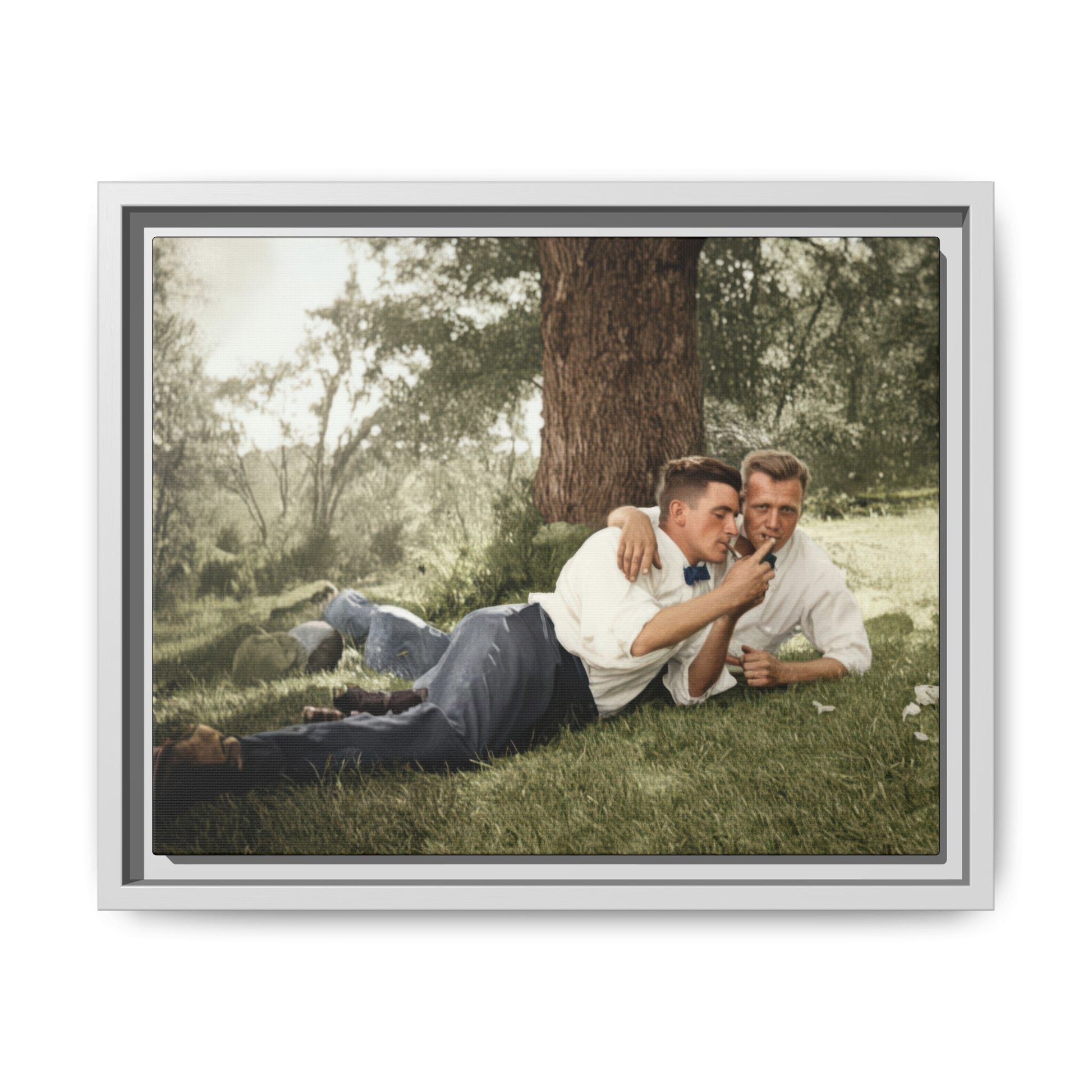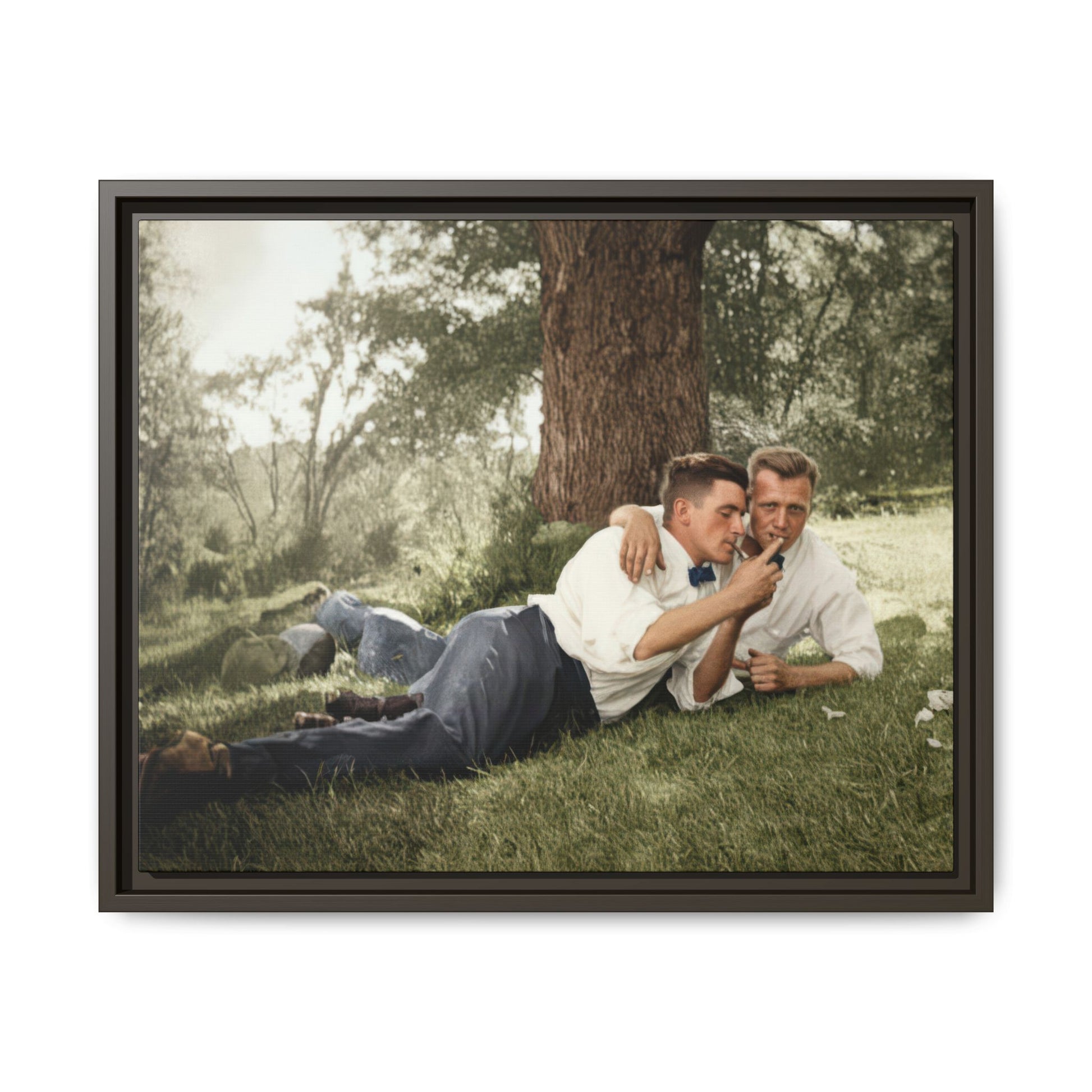 Title: Two Men Reclining on Grass Beneath Tree, Outdoor Snapshot