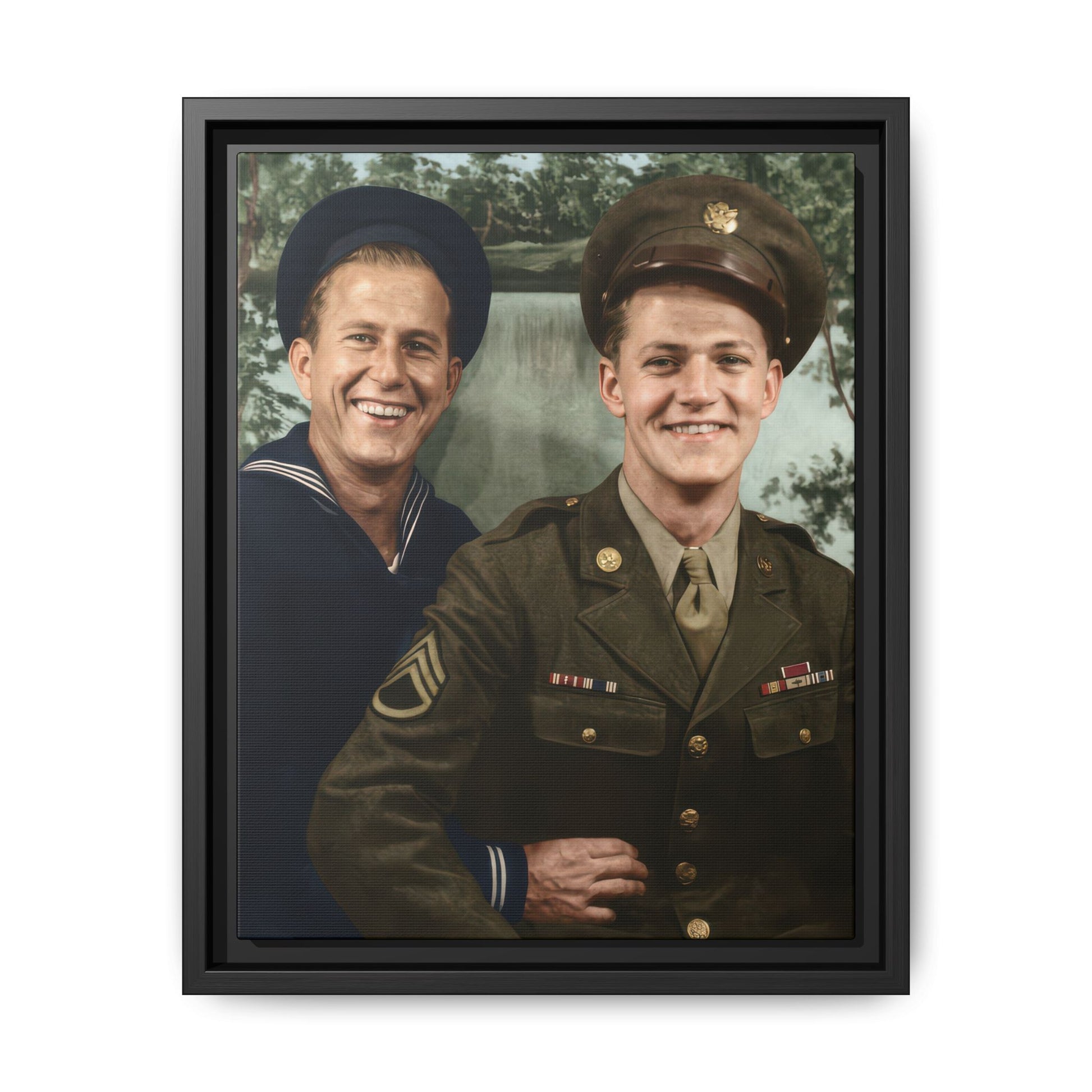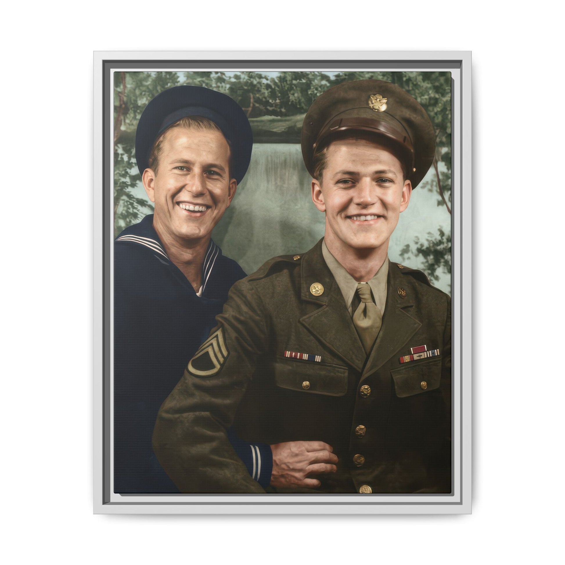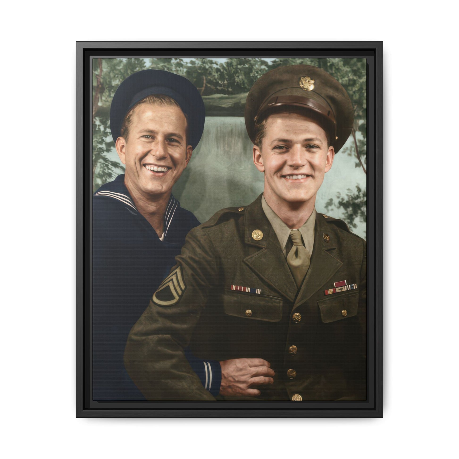 The estimated date is based on visible military uniforms and insignia. One individual wears a U.S. Navy enlisted uniform with a jumper-style top and a rating badge on the sleeve. The other wears a U.S. Army service uniform with a peaked cap, service ribbons, and metal insignia. The cut of the uniforms, tie style, and short, neatly groomed hairstyles are consistent with mid-1940s wartime presentation. The painted landscape backdrop is typical of commercial studio portraiture during the Second World War.