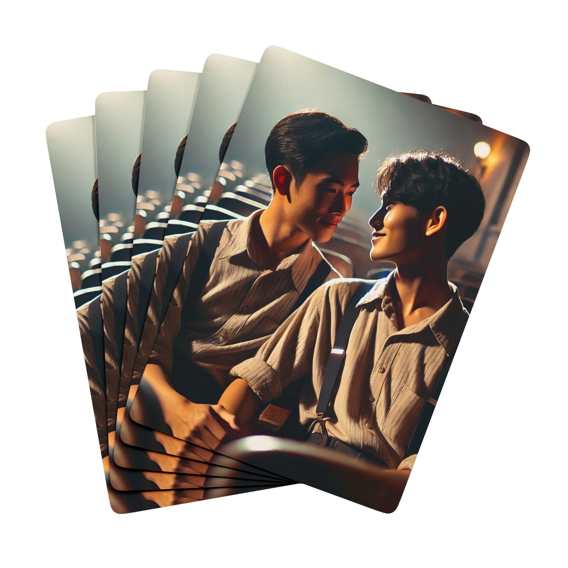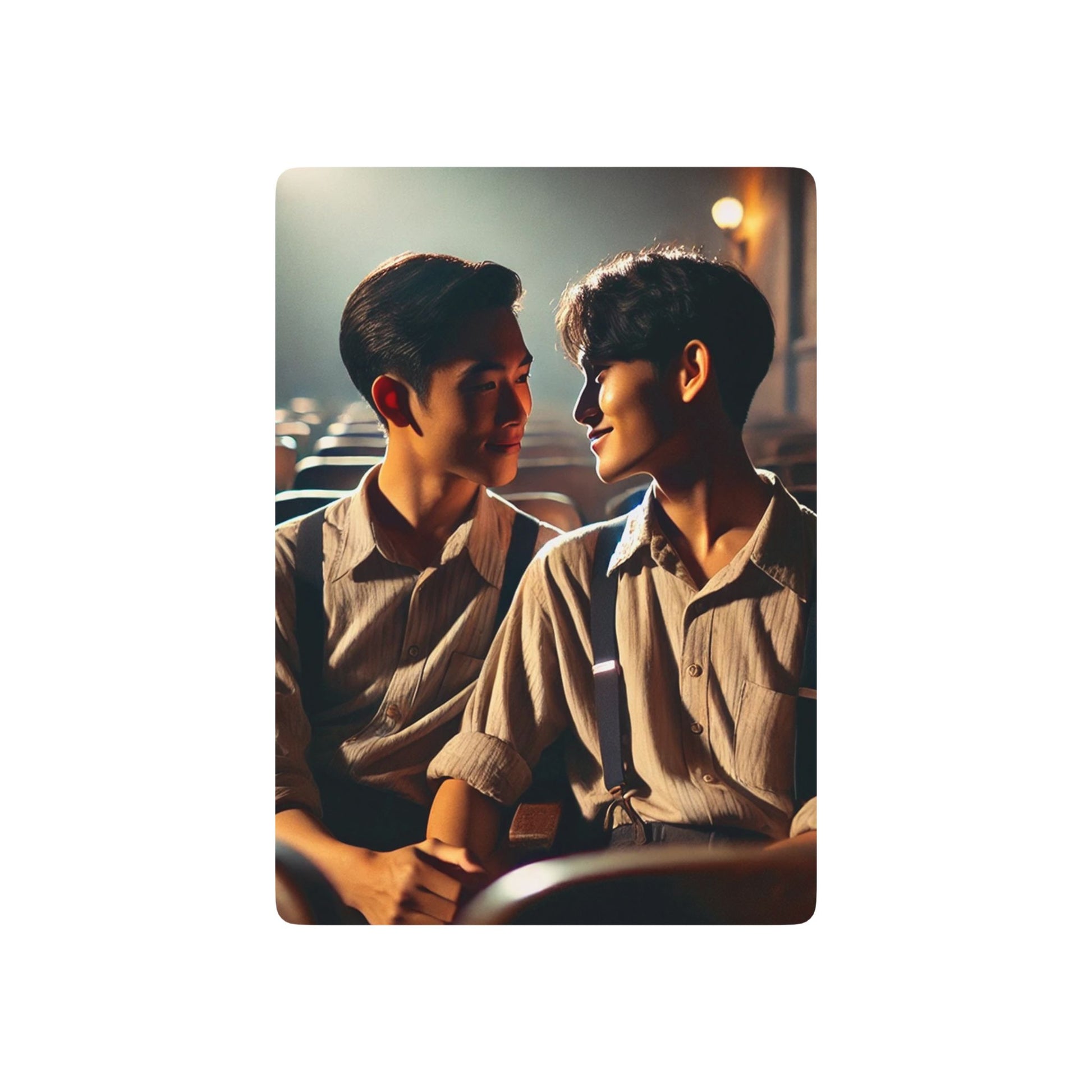 - Striking Card Back Artwork: A cinematic composition featuring two young men in a vintage movie theater, their love illuminated by the warm glow of the screen, capturing the essence of hidden romance.
