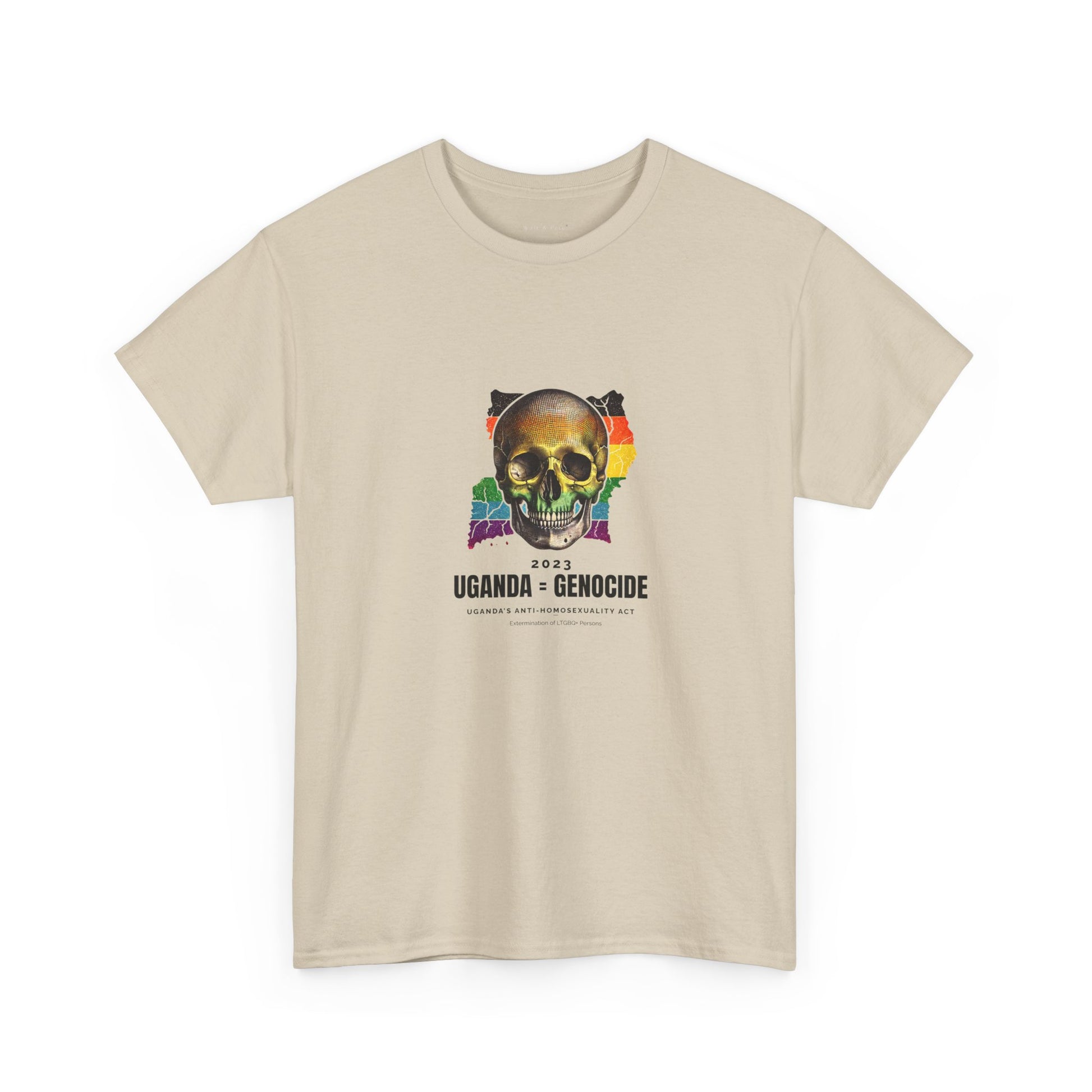 Take a stand against injustice with the 'Uganda = Genocide | Activist T-Shirt | What the F*$)*.' This powerful statement piece highlights the harsh reality facing LGBTQ+ individuals in Uganda following the passage of the 2023 Anti-Homosexuality Act. Featuring a bold design of a human skull overlayed with the colors of the rainbow and Uganda’s flag, set against a vintage map of Uganda, this shirt draws attention to the perilous situation for LGBTQ+ Ugandans and their families, who are at grave risk under laws promoting discrimination, persecution, and even extermination.