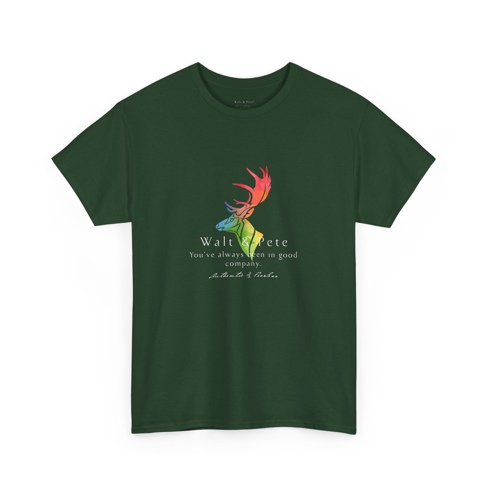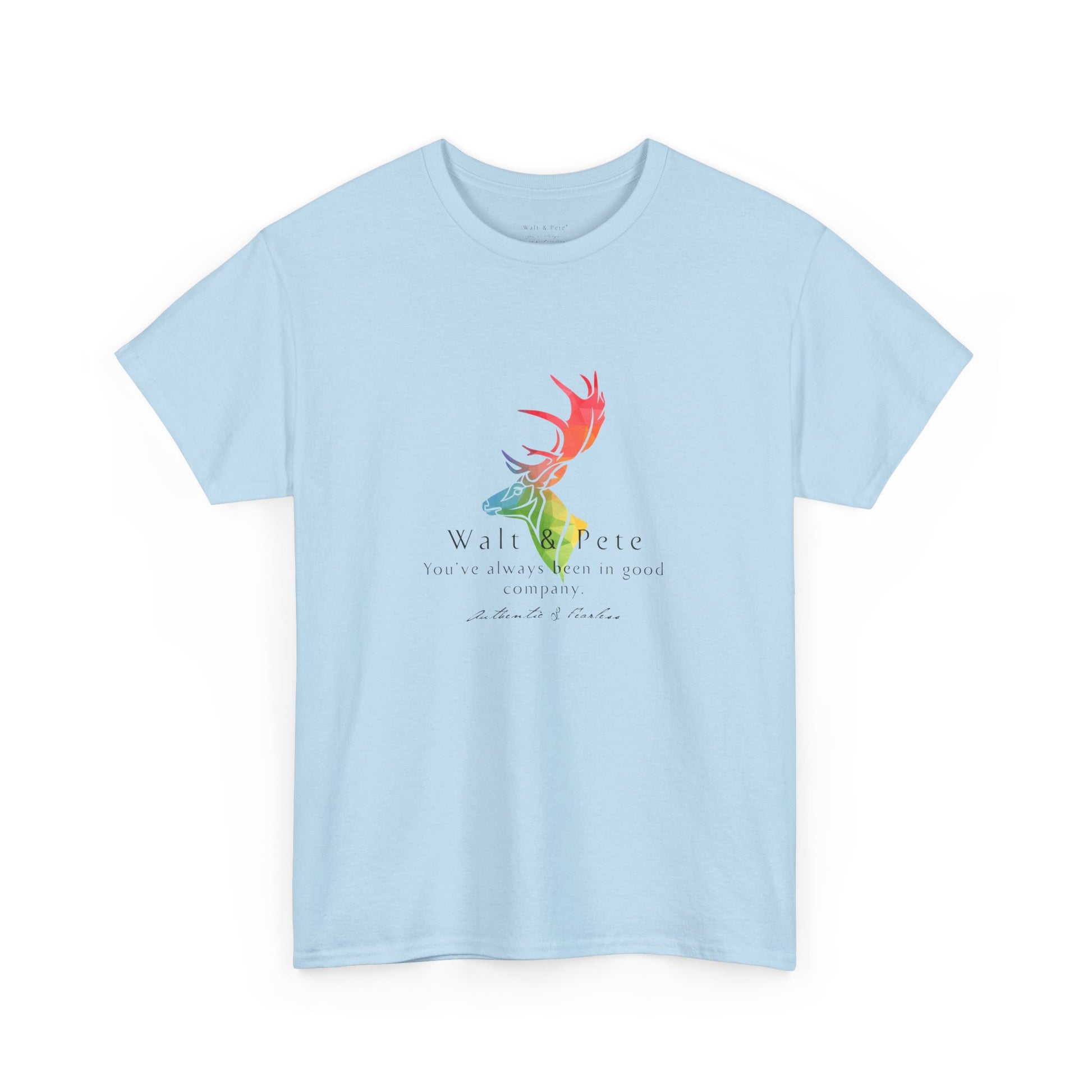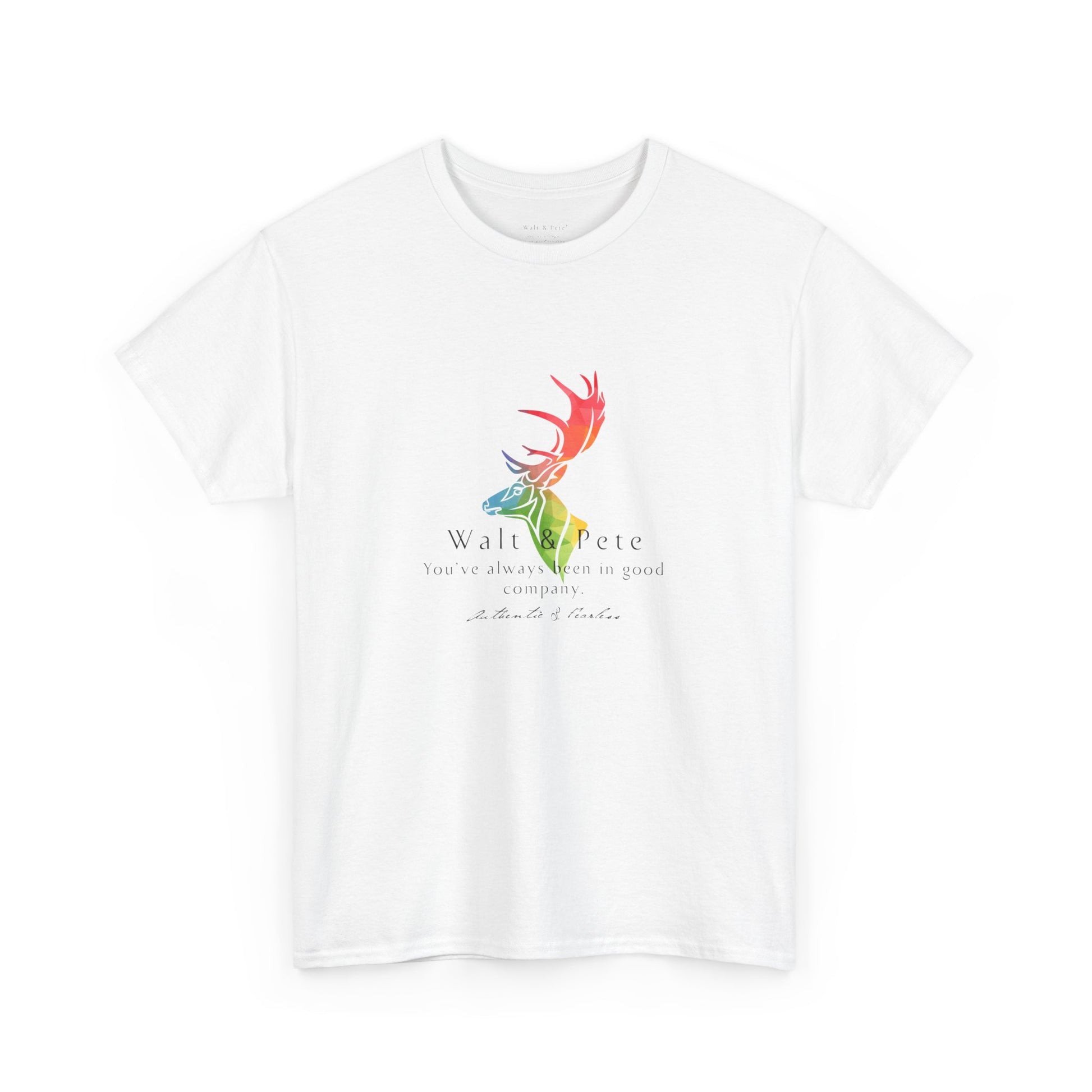 Celebrate authenticity and pride with this bold Walt & Pete® T-shirt. Featuring a majestic stag in vibrant rainbow colors and the empowering phrase 'You've always been in good company,' this design is all about fearlessness and embracing your true self. Perfect for those who live life authentically, this shirt reflects the spirit of Walt & Pete®, a brand dedicated to honoring LGBTQ+ history and community. Made from high-quality, soft fabric, it’s comfortable for everyday wear while making a statement about pride, strength, and belonging. Show the world that being fearless and authentic means you're always in great company.