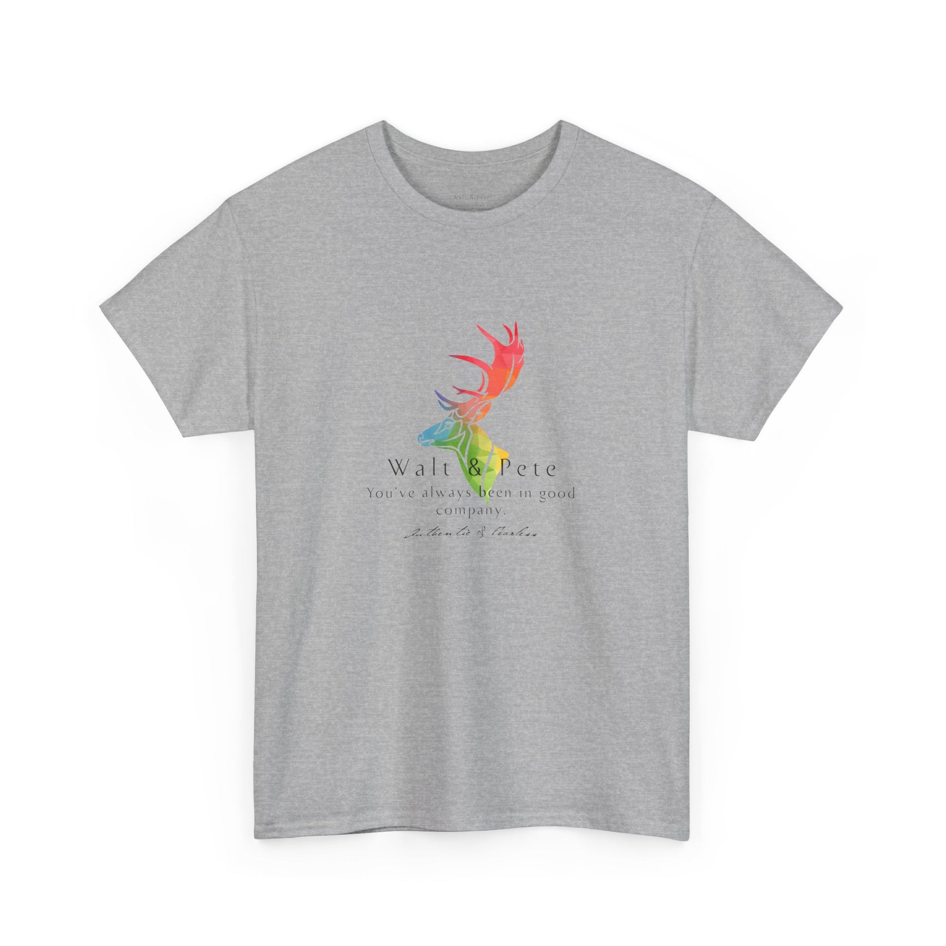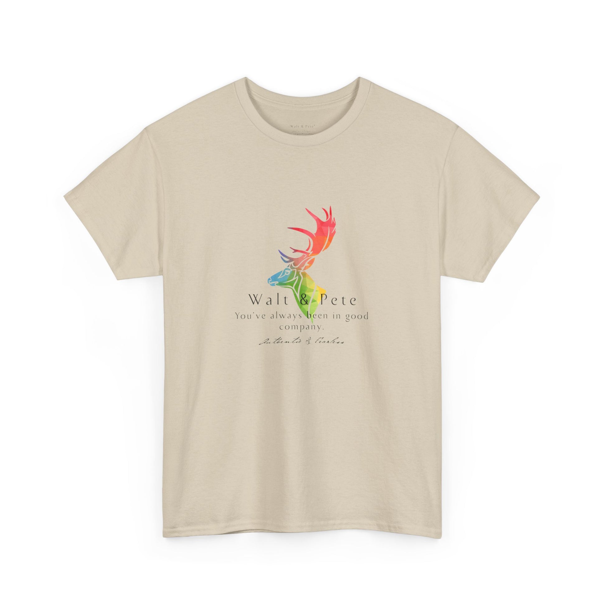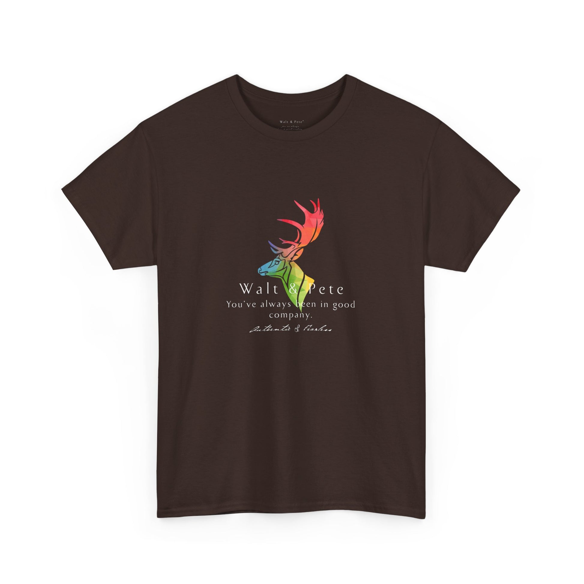 Celebrate authenticity and pride with this bold Walt & Pete® T-shirt. Featuring a majestic stag in vibrant rainbow colors and the empowering phrase 'You've always been in good company,' this design is all about fearlessness and embracing your true self. Perfect for those who live life authentically, this shirt reflects the spirit of Walt & Pete®, a brand dedicated to honoring LGBTQ+ history and community. Made from high-quality, soft fabric, it’s comfortable for everyday wear while making a statement about pride, strength, and belonging. Show the world that being fearless and authentic means you're always in great company.